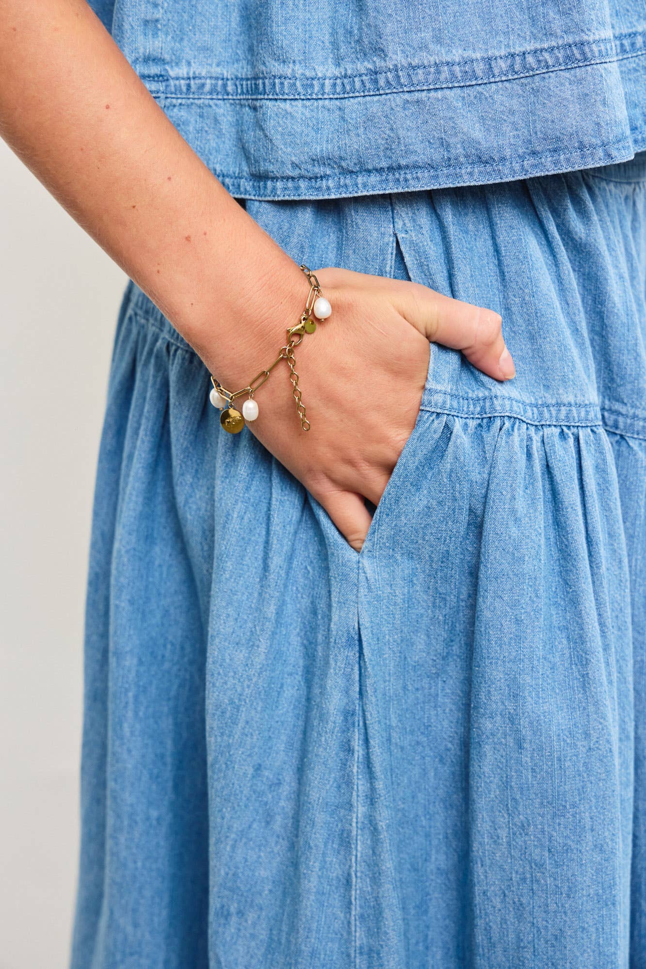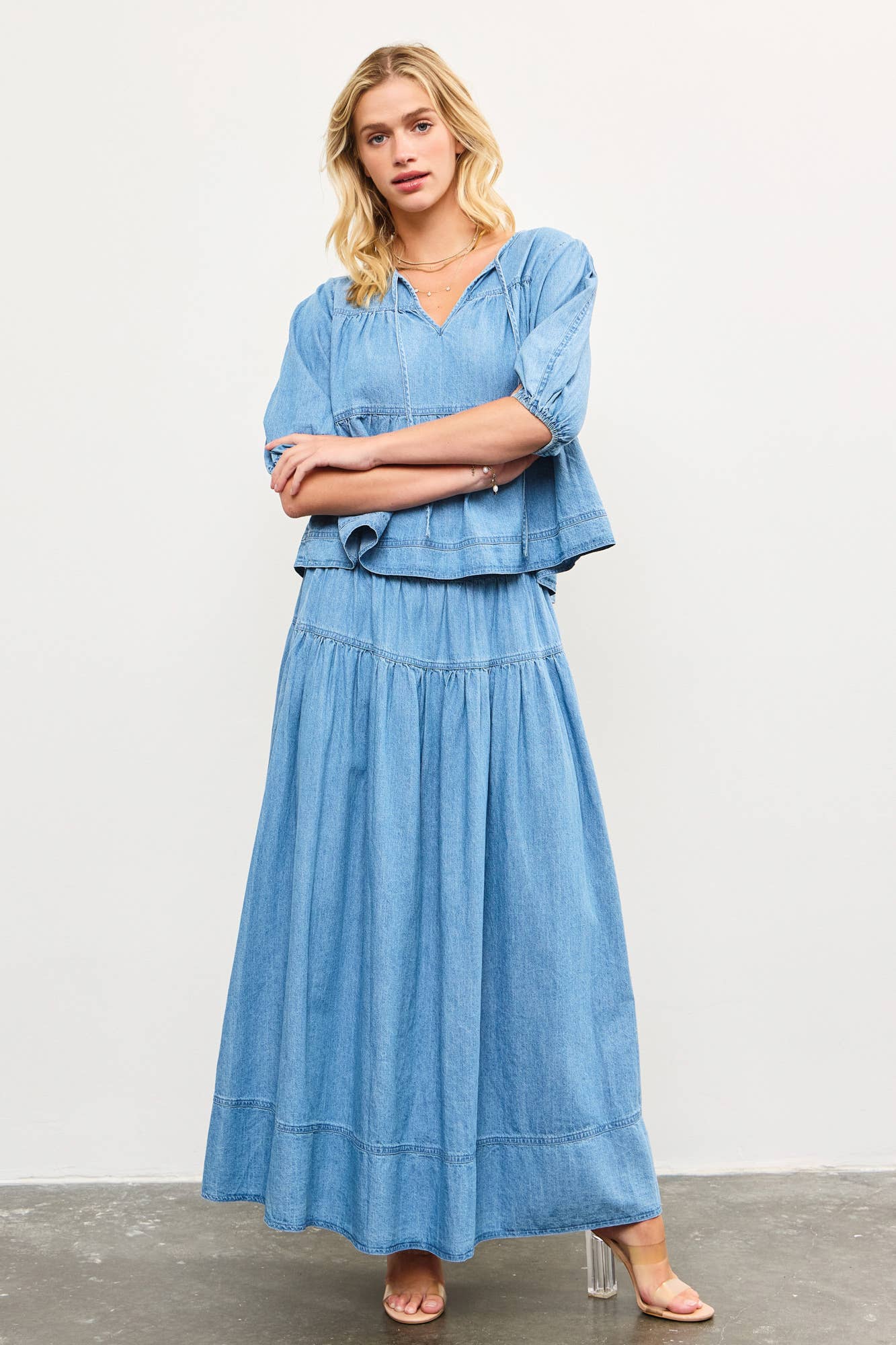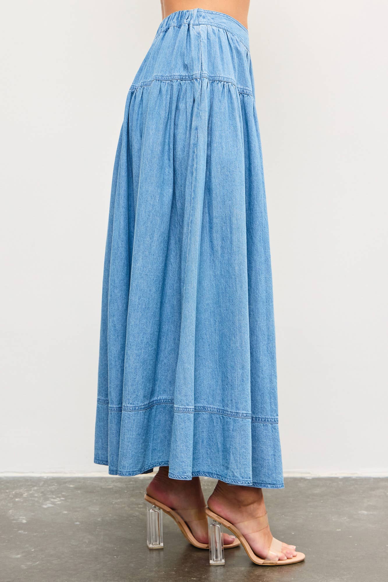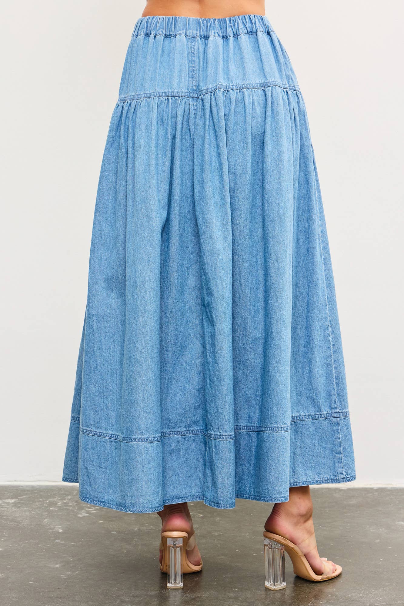 BANDED WAIST SHIRRING TIERED DENIM MIDI SKIRT: WASHED DS0755