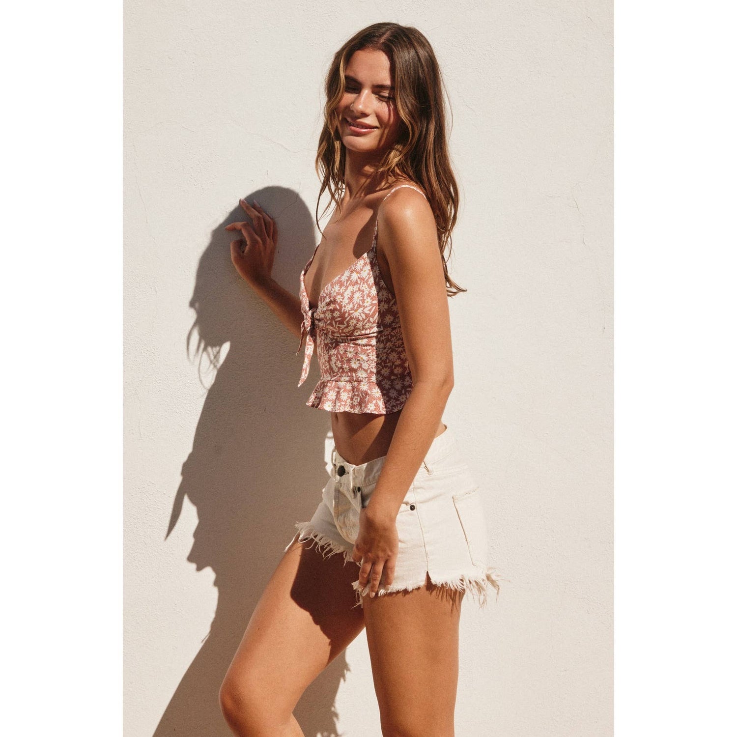 Floral print cami top featuring a triangle bust, knot detail, and ruffled cropped hem. Smocked back and adjustable shoulder straps for better fitting. Model is 5'7"and wearing size Small.