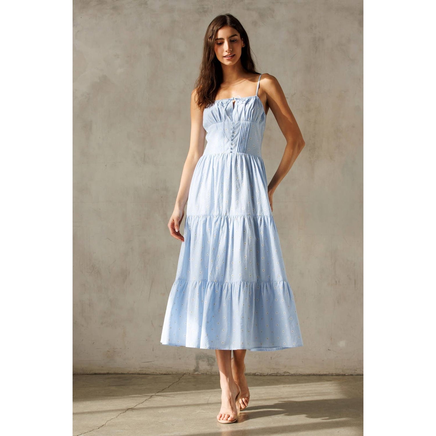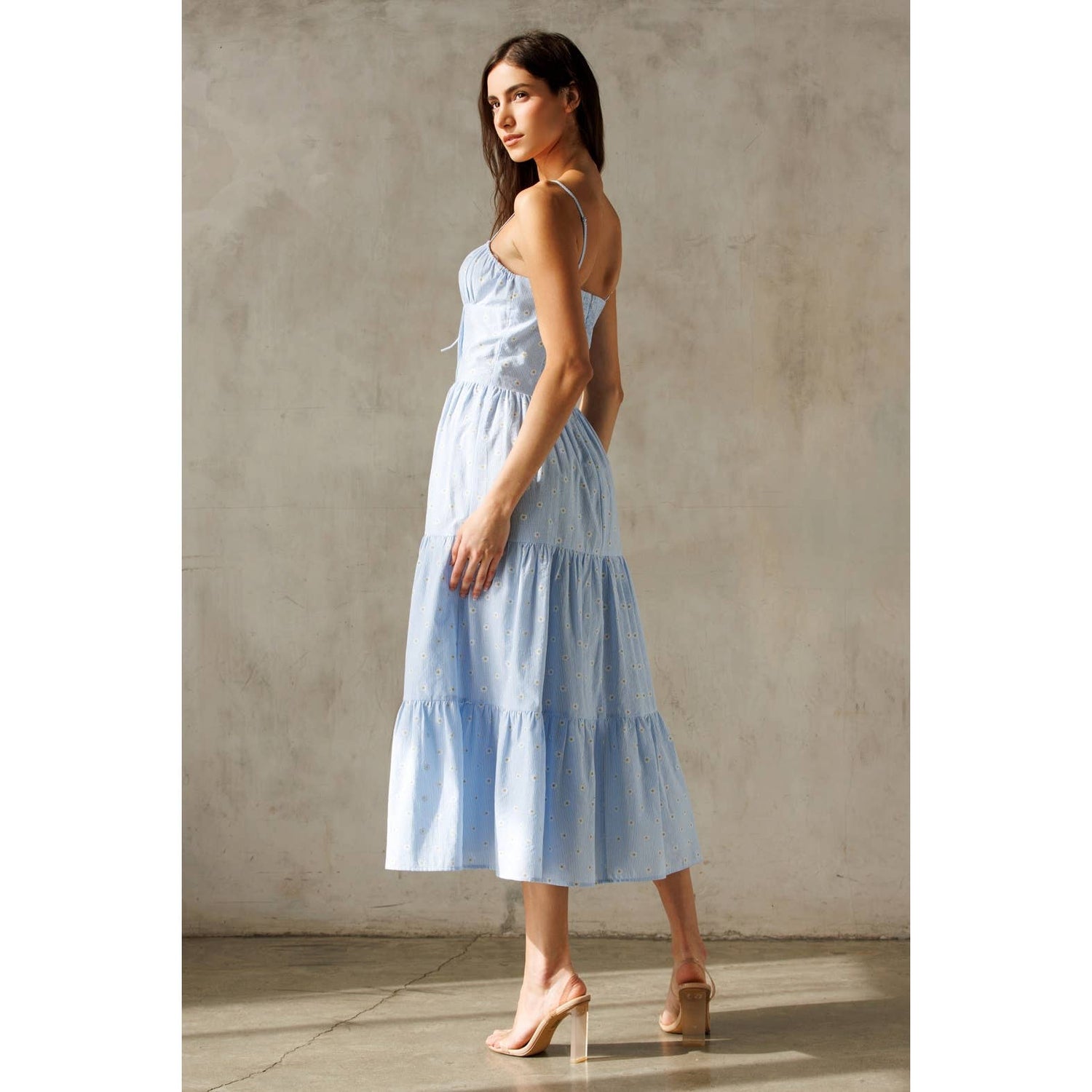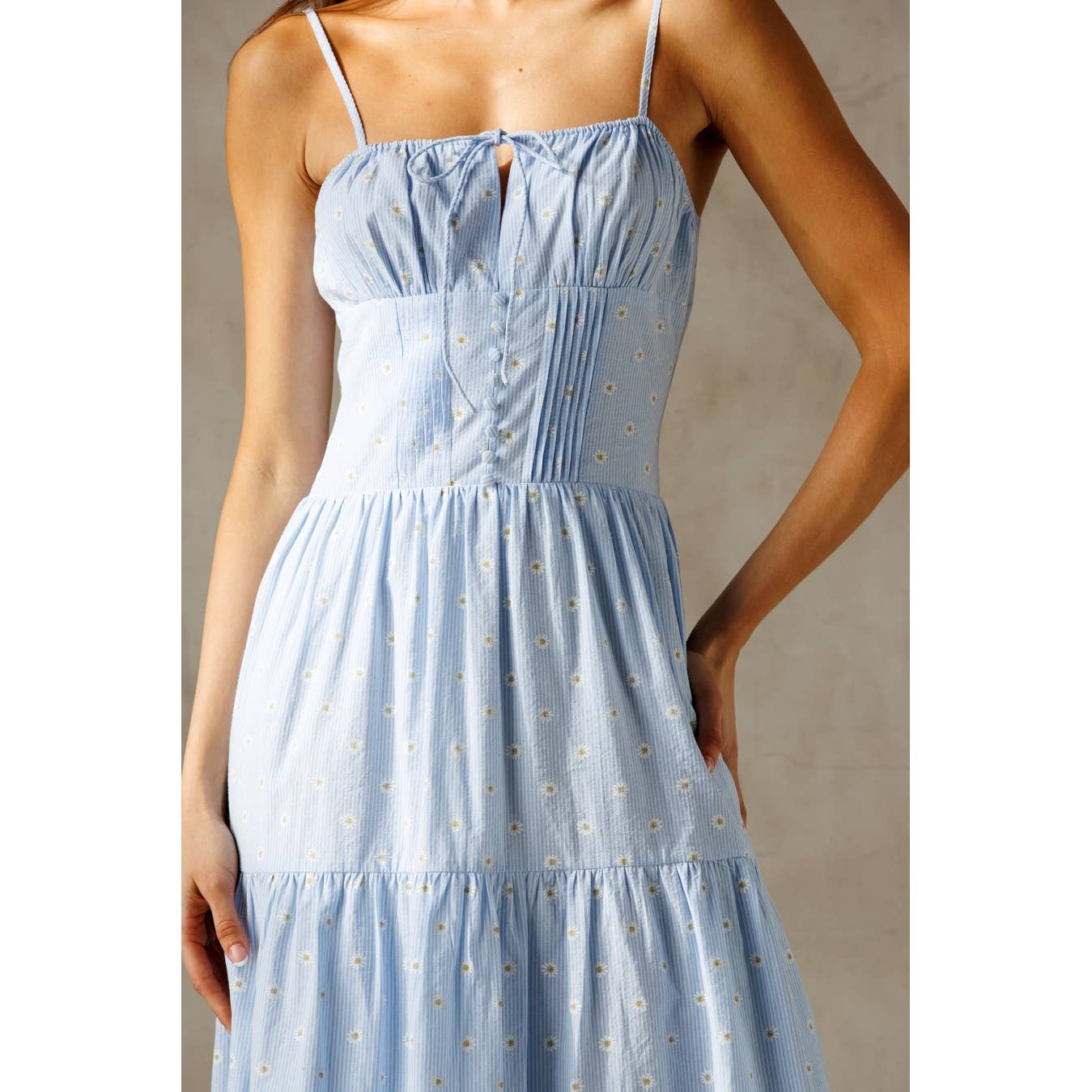 This dreamy light blue midi dress is the epitome of effortless summer style. Featuring delicate daisy print throughout, it has a romantic and playful charm. The fitted bodice with a subtle tie-front detail and thin adjustable straps provides a flattering silhouette, while the smocked back ensures comfort and flexibility. The tiered skirt flows gracefully, making it ideal for warm-weather outings.