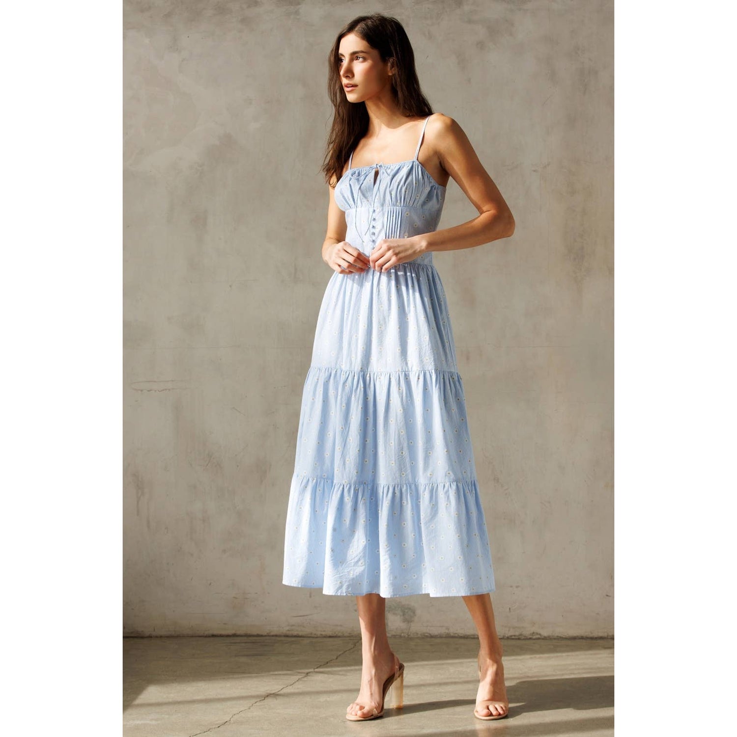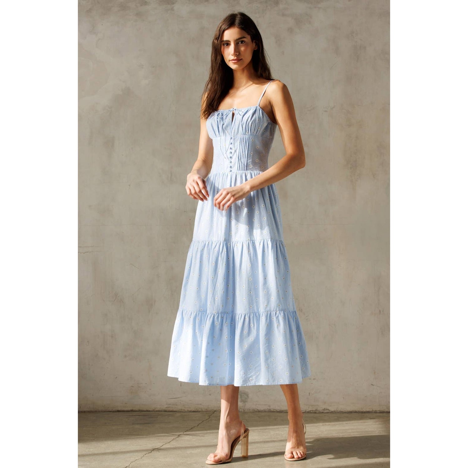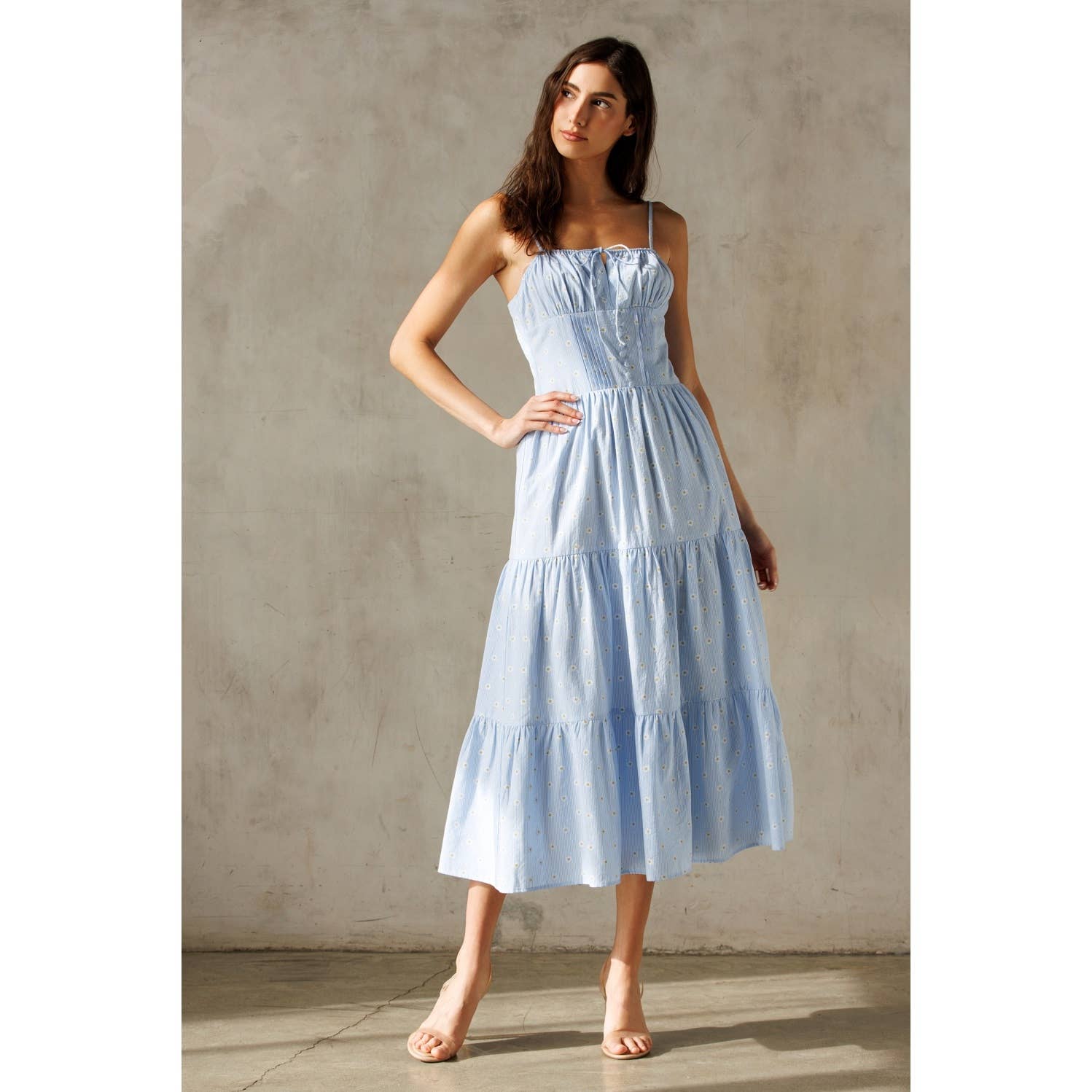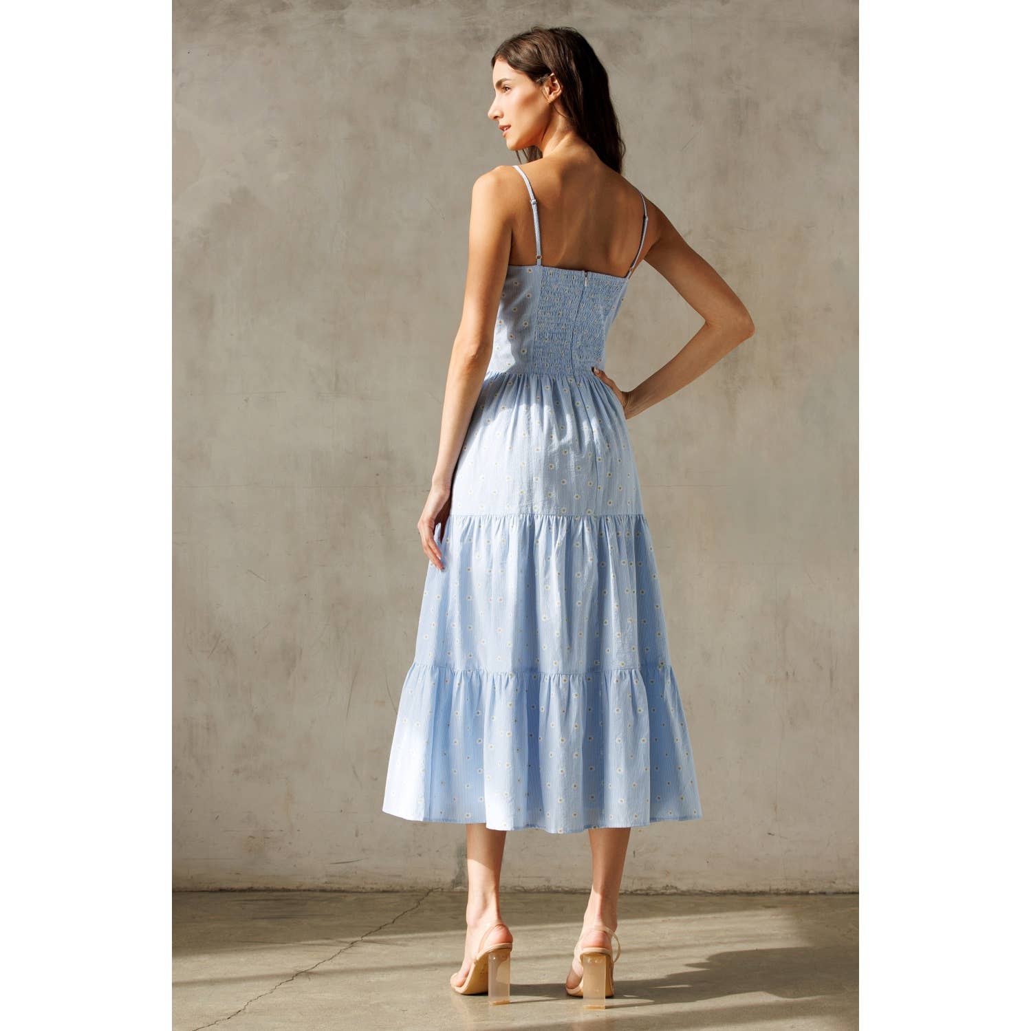 This dreamy light blue midi dress is the epitome of effortless summer style. Featuring delicate daisy print throughout, it has a romantic and playful charm. The fitted bodice with a subtle tie-front detail and thin adjustable straps provides a flattering silhouette, while the smocked back ensures comfort and flexibility. The tiered skirt flows gracefully, making it ideal for warm-weather outings.