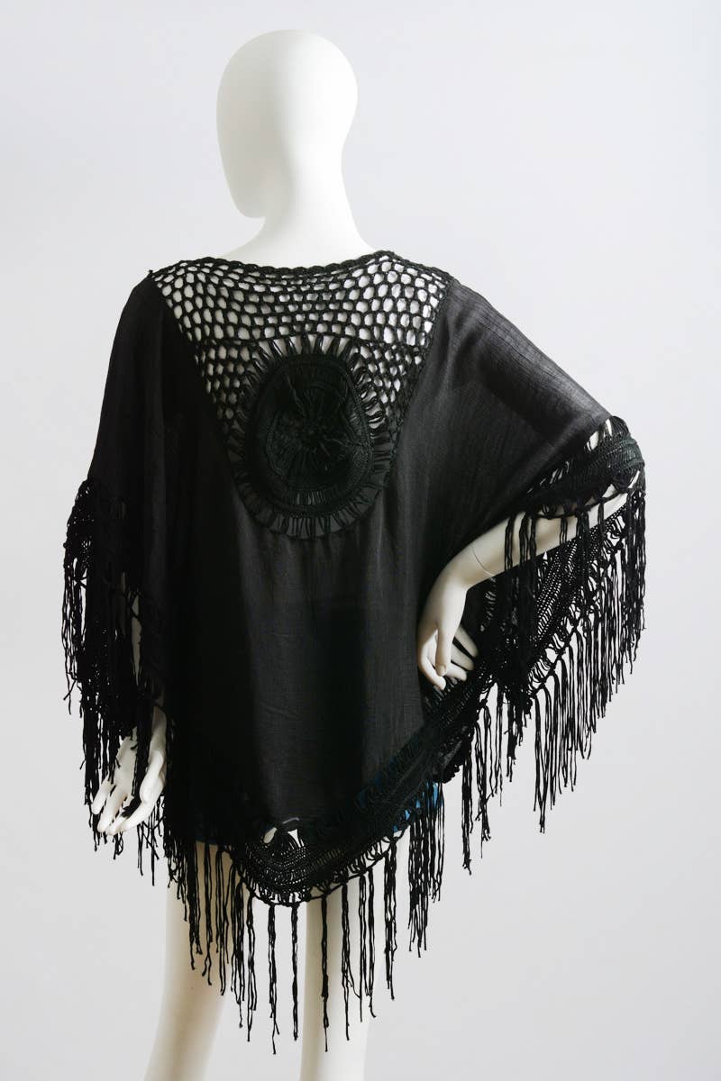 Unveil your boho spirit with our Crochet Medallion Tassel Kimono. This fringed boho kimono, featuring a striking circular medallion crochet on the back, is a sheer, lightweight wrap perfect for sunny beach days. Its open-front design and crochet lace detailing offer a trendy boho-chic look that's versatile for festival wear or as a casual crochet coverup. Embody summer vibes in this fashionable fringed cape, a must-have for your bohemian wardrobe.
