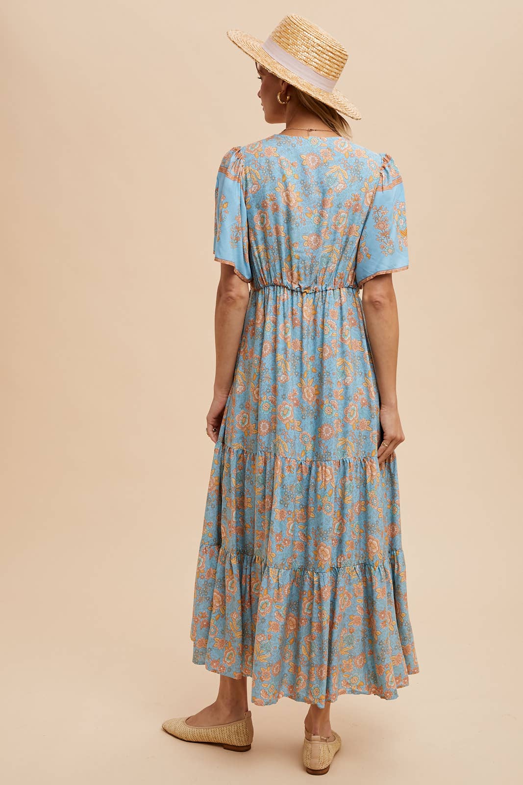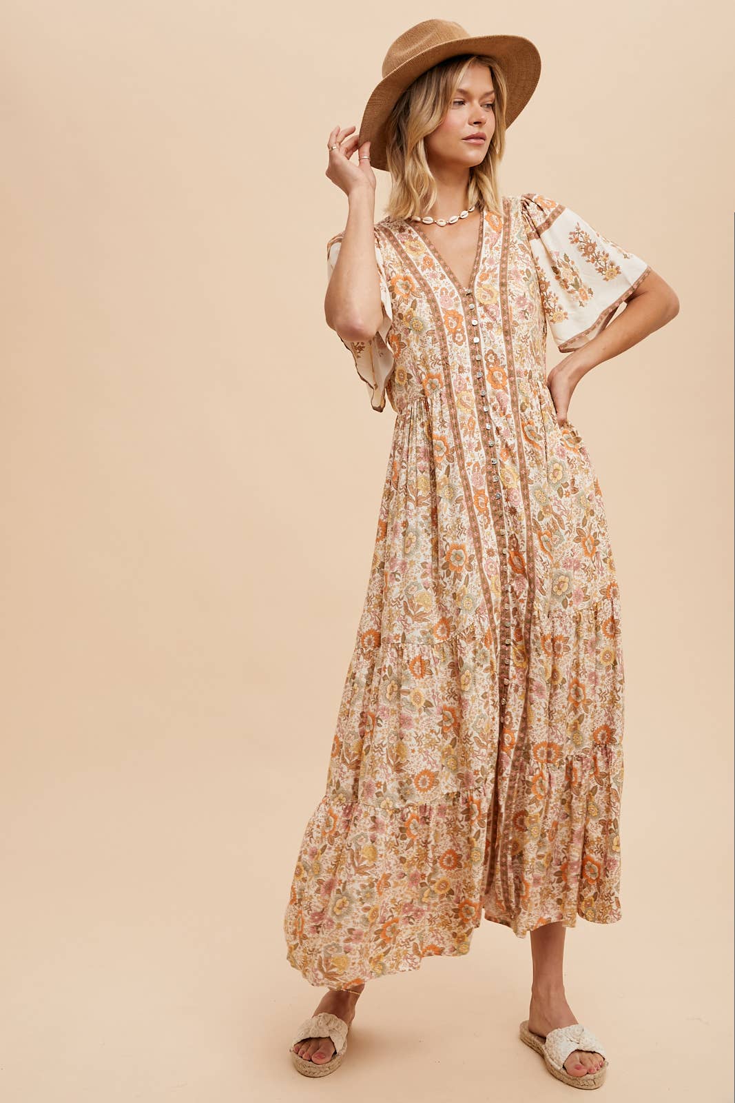 BORDER FLORAL PRINT BUTTON FRONT MIDI DRESS FEATURING: FULL LINING, FLUTTER SLEEVE,