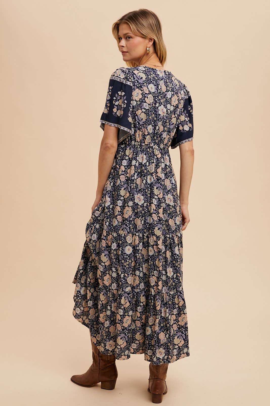 BORDER PRINT BUTTON FRONT MIDI DRESS: MIDNIGHT / ILD4971-A