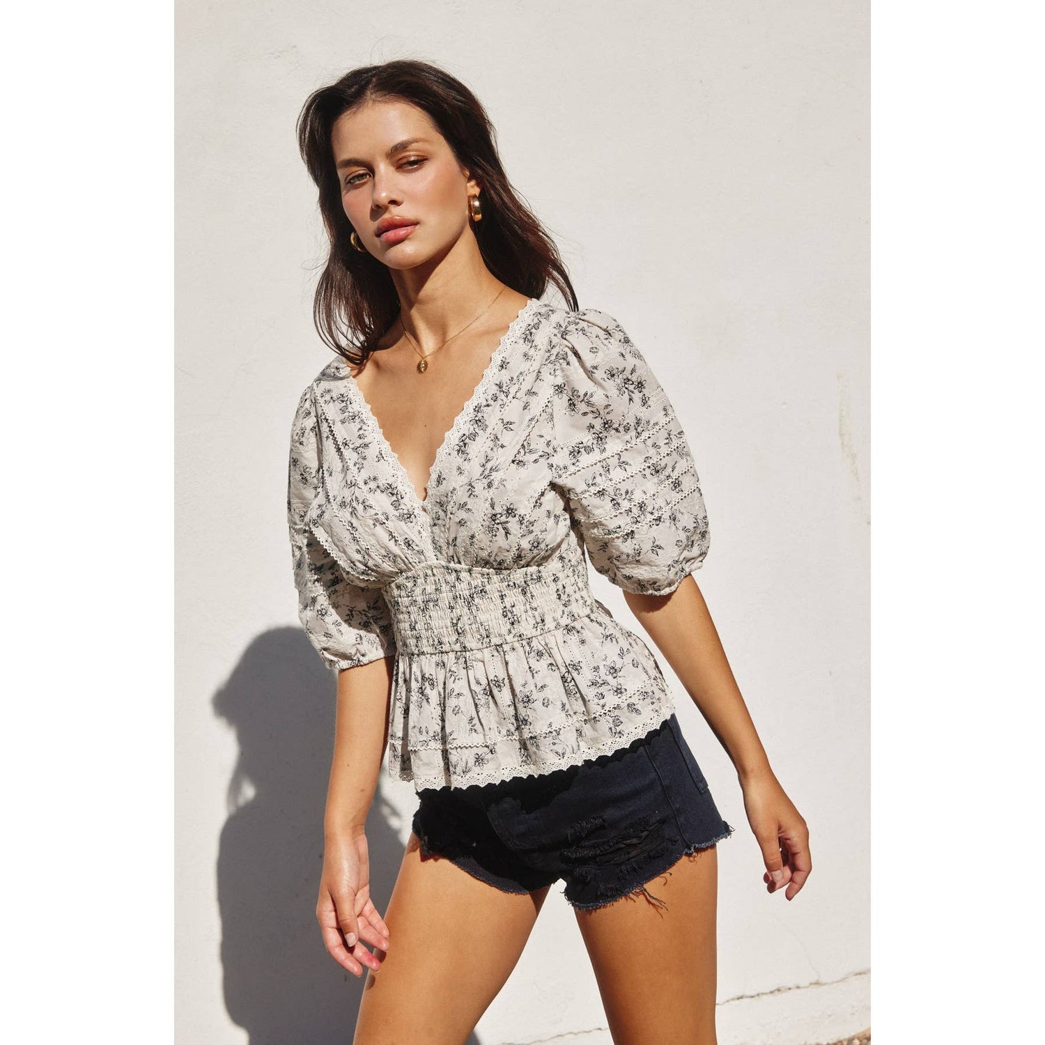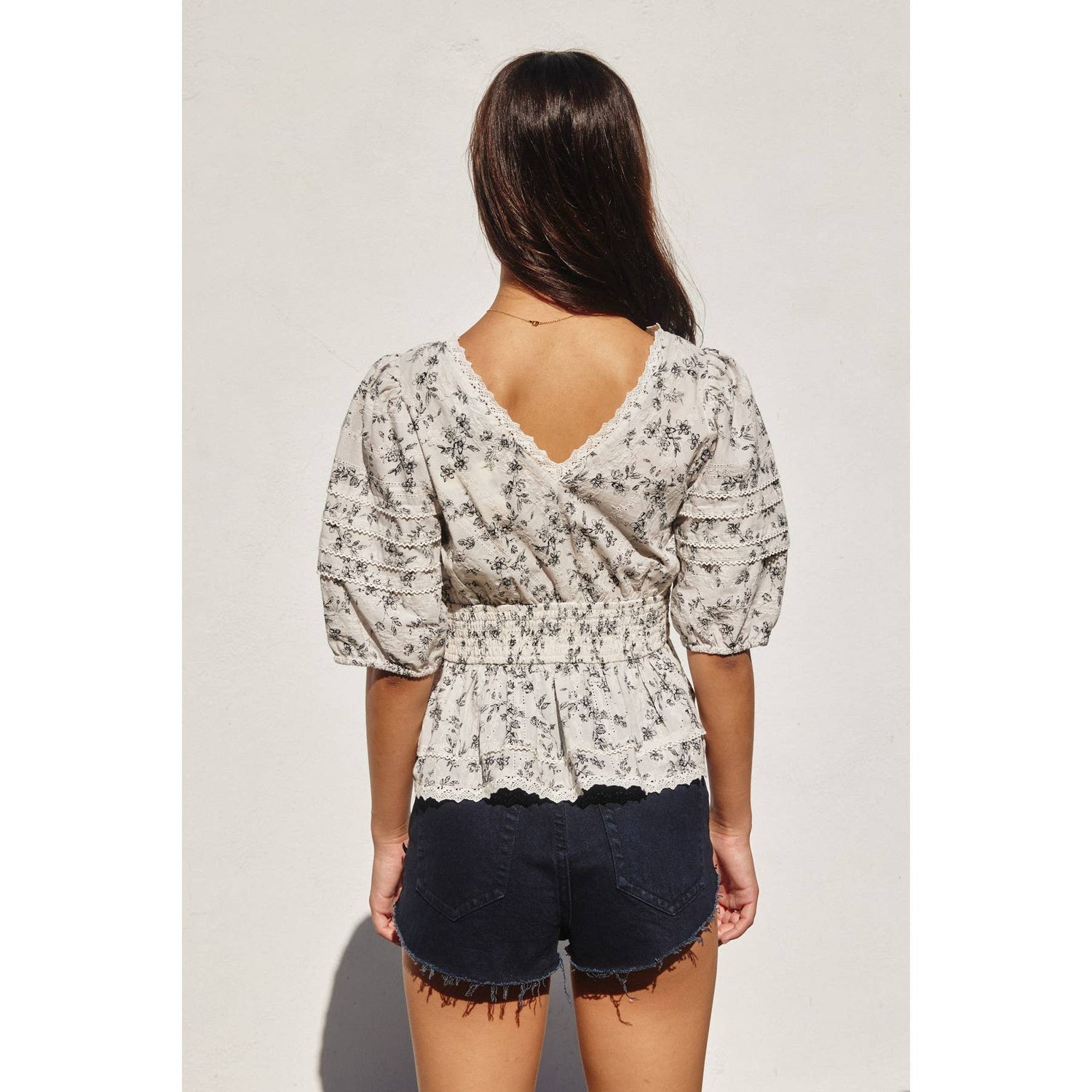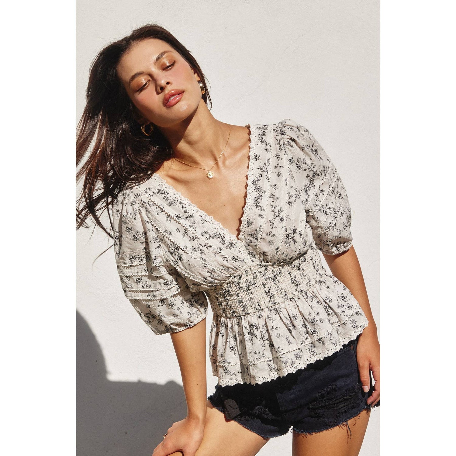 Floral print cotton eyelet peplum top with lace trim details. Model is 5'6" and wearing size Small.
