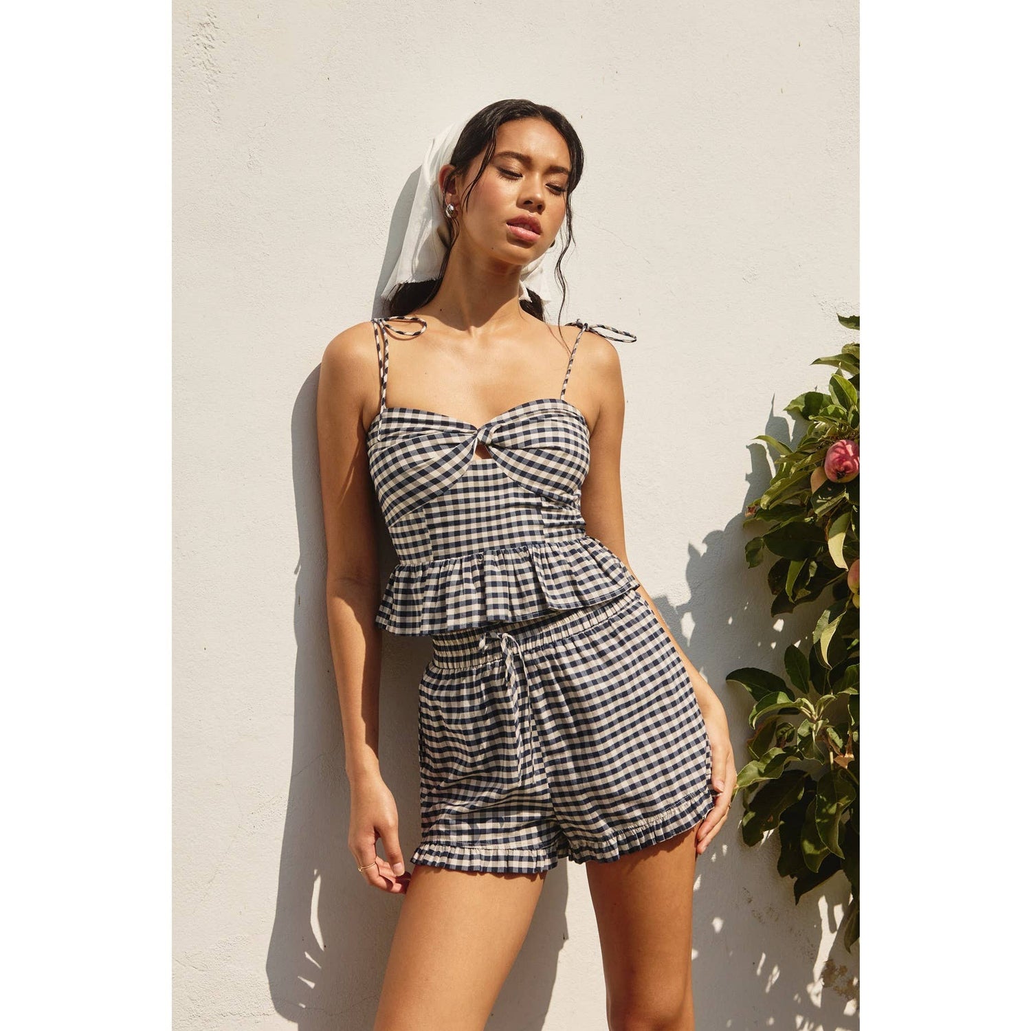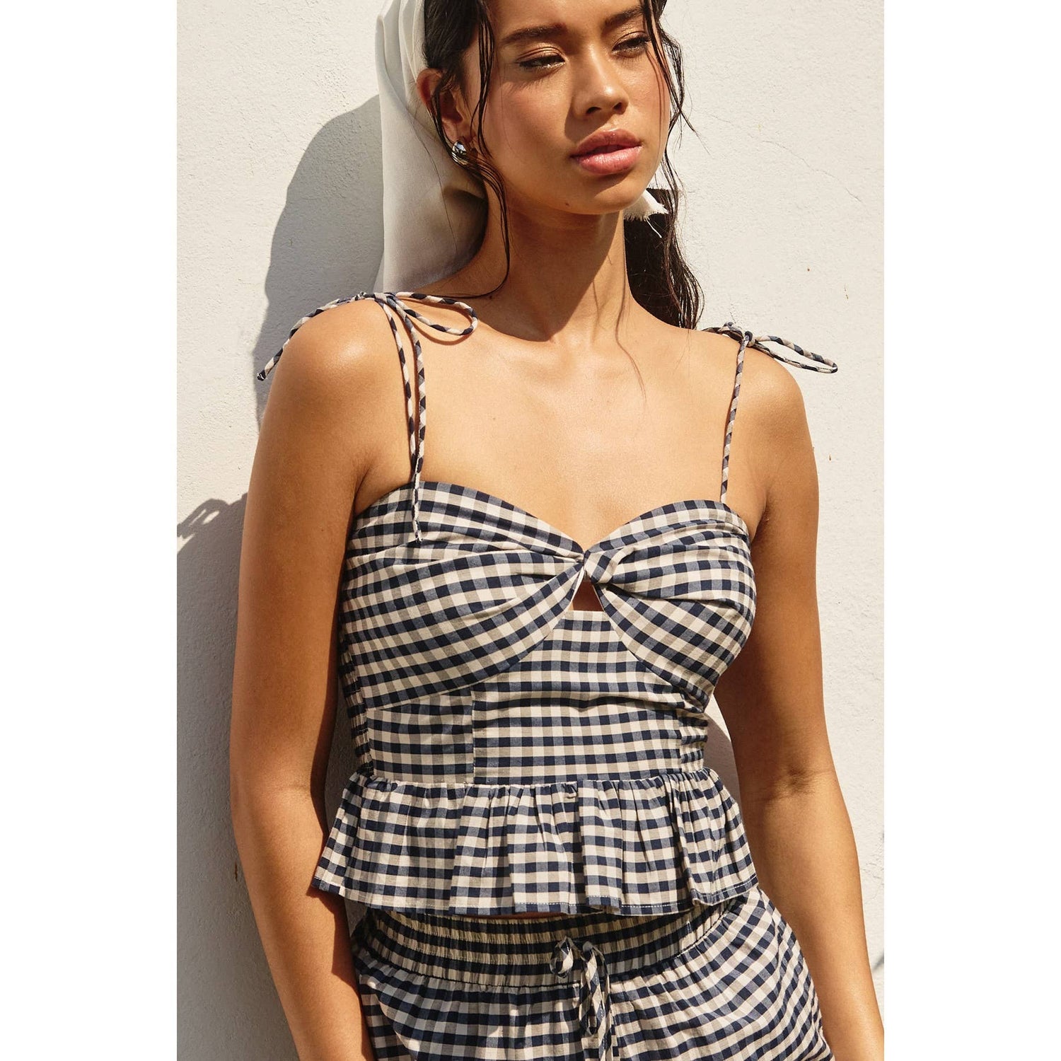 Gingham print top featuring a twist knot and a cutout at the bust. Model is 5'11" and wearing size Small.