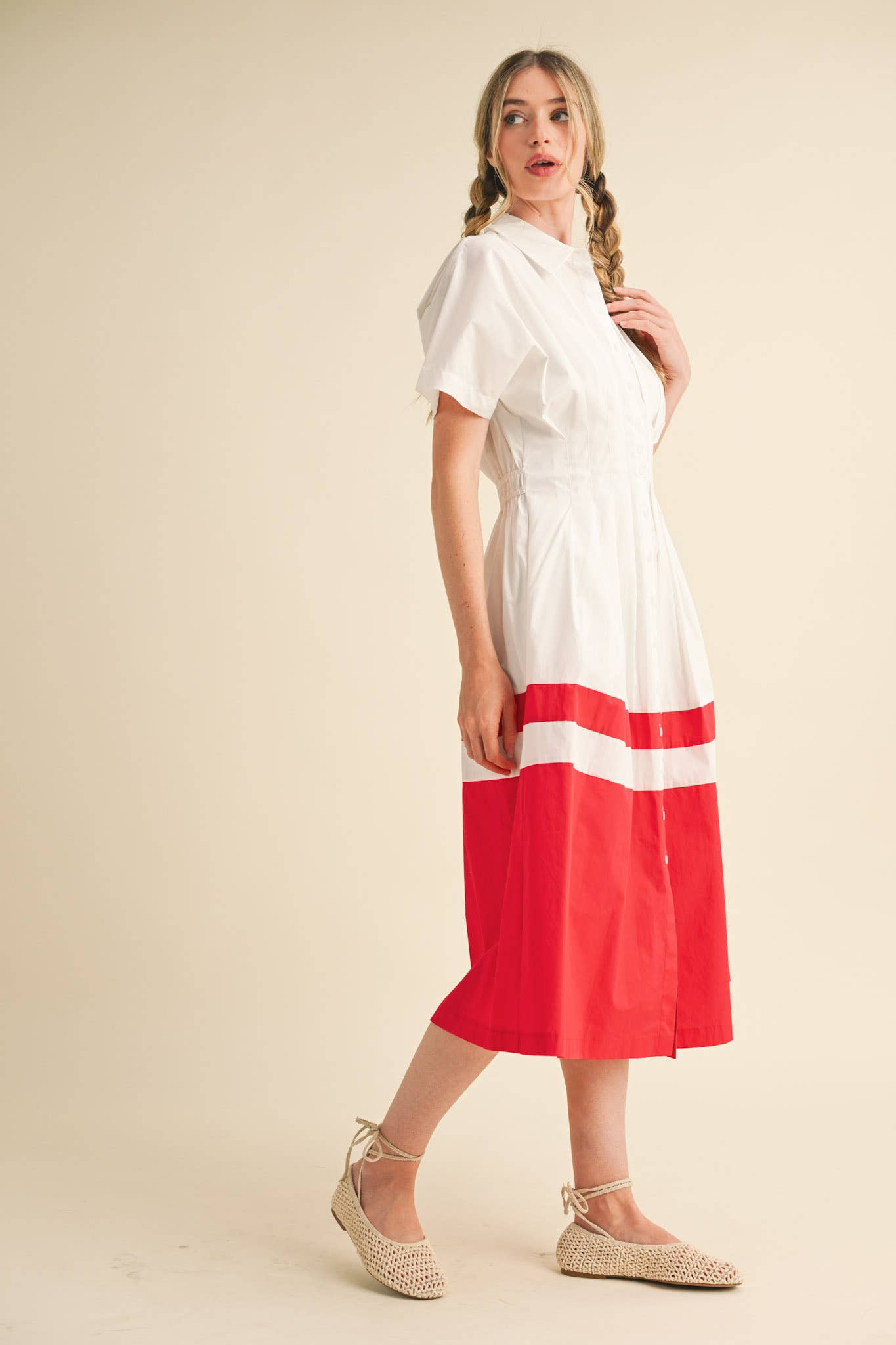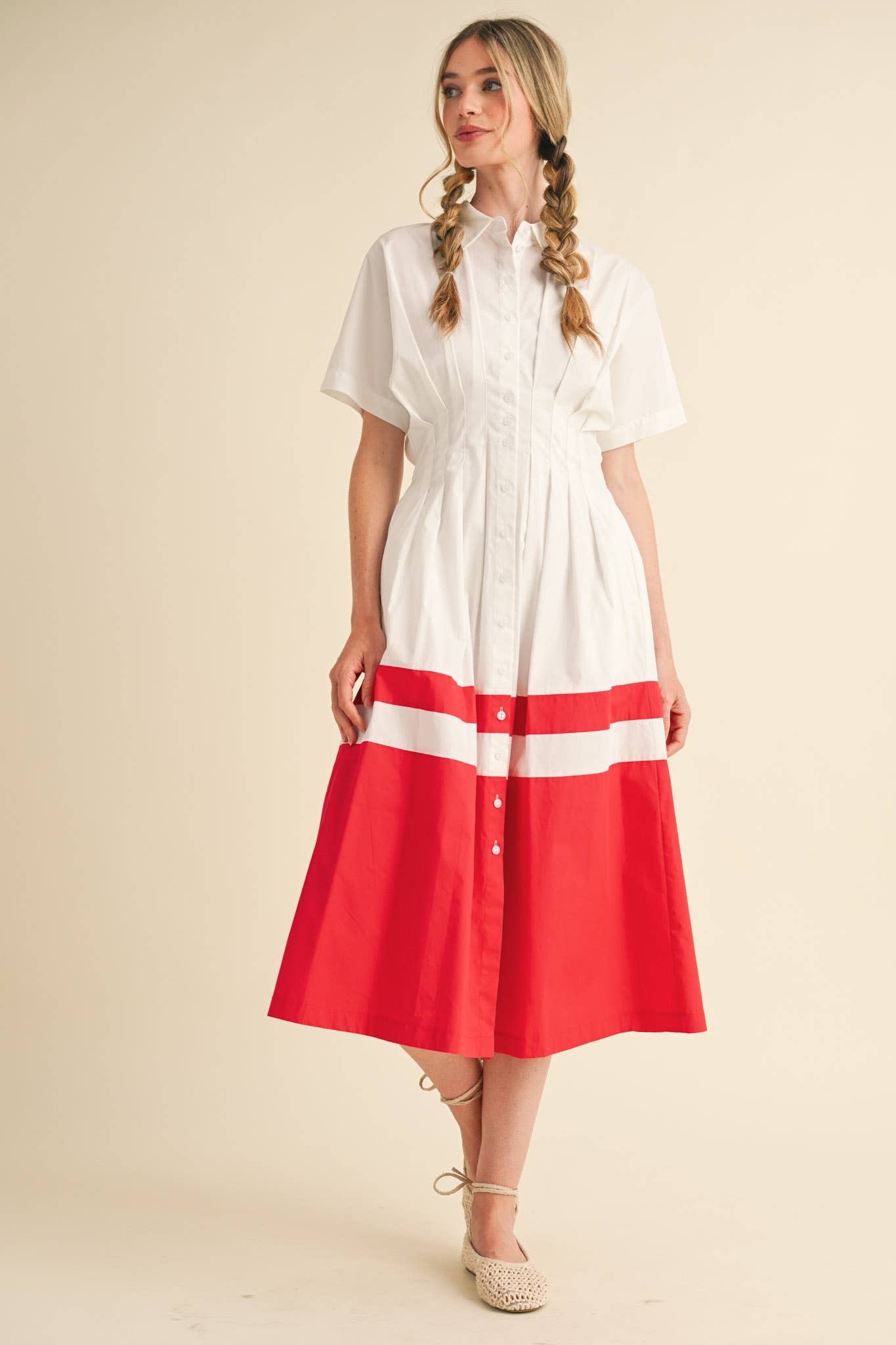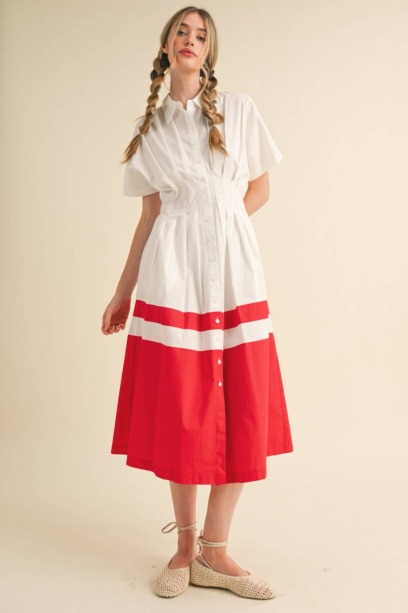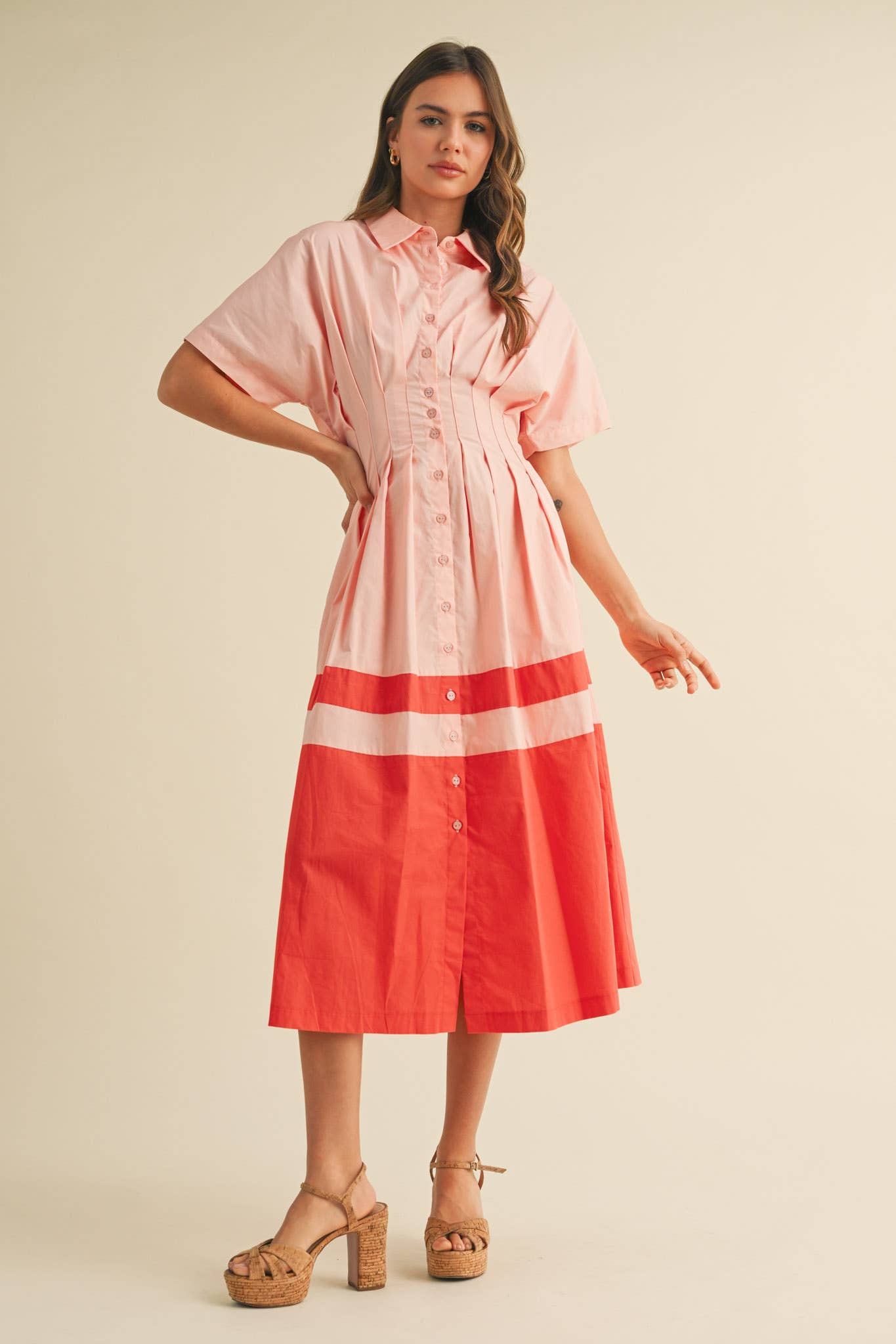 BUTTON DOWN PLEATED WAIST COLOR BLOCK MIDI DRESS MDR3556