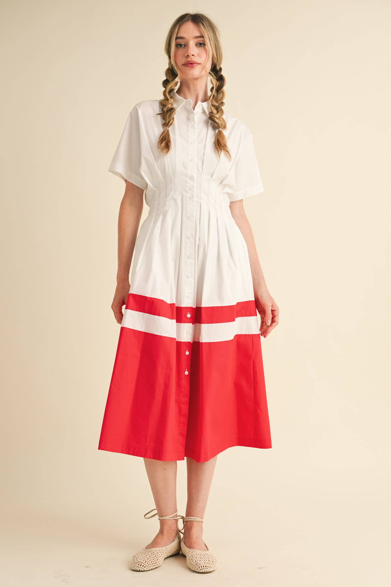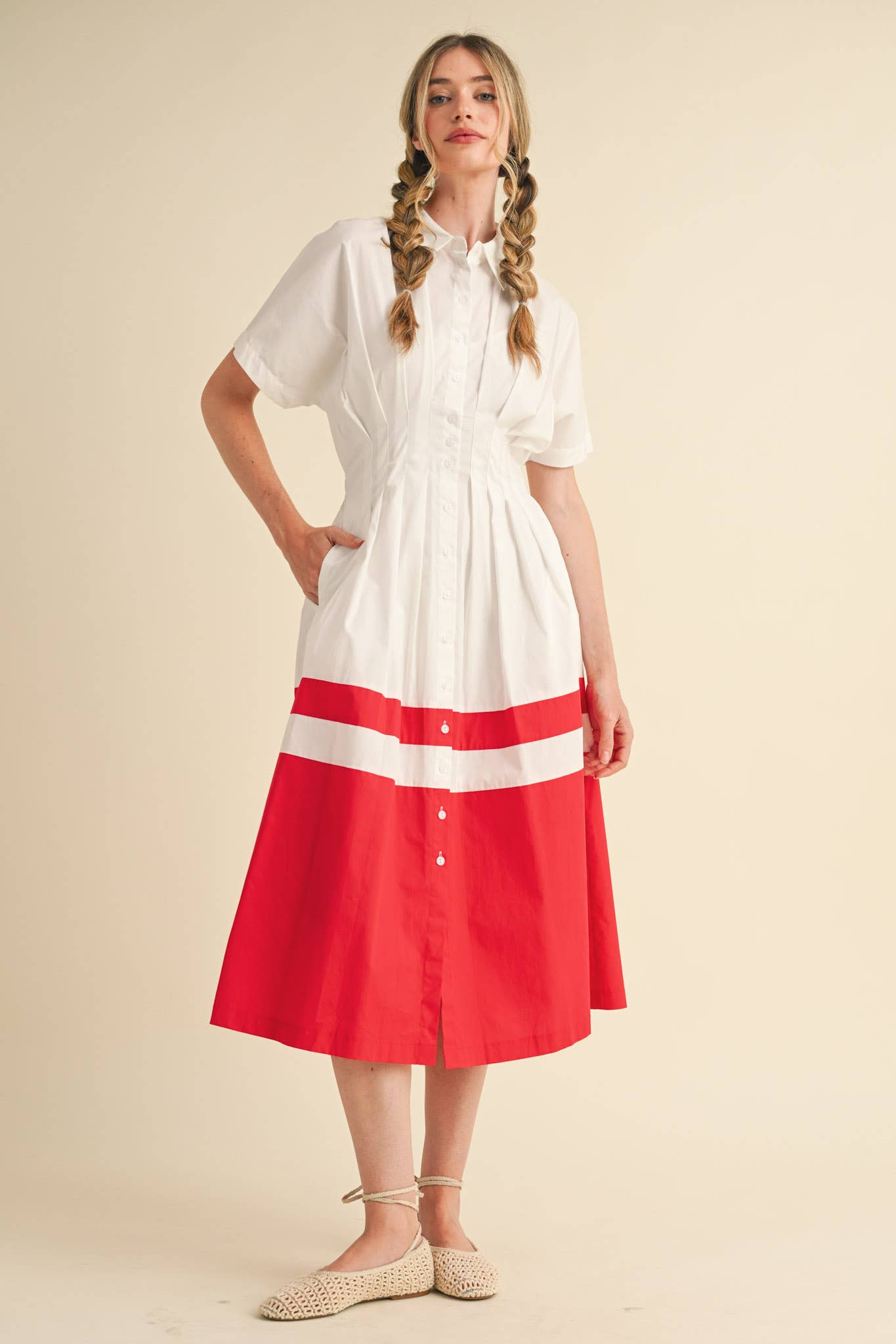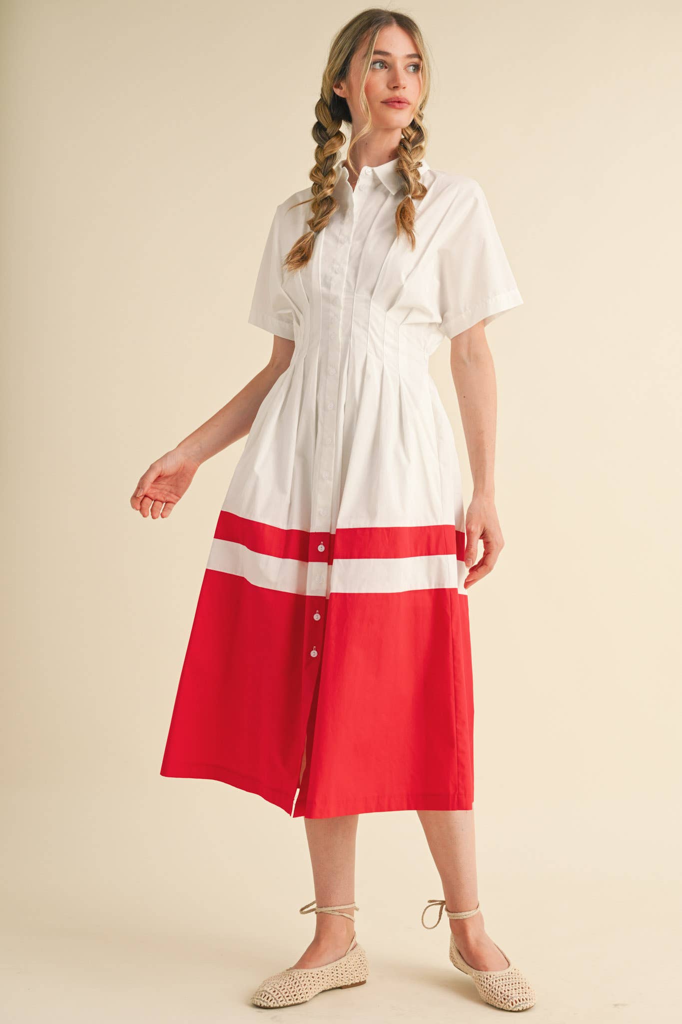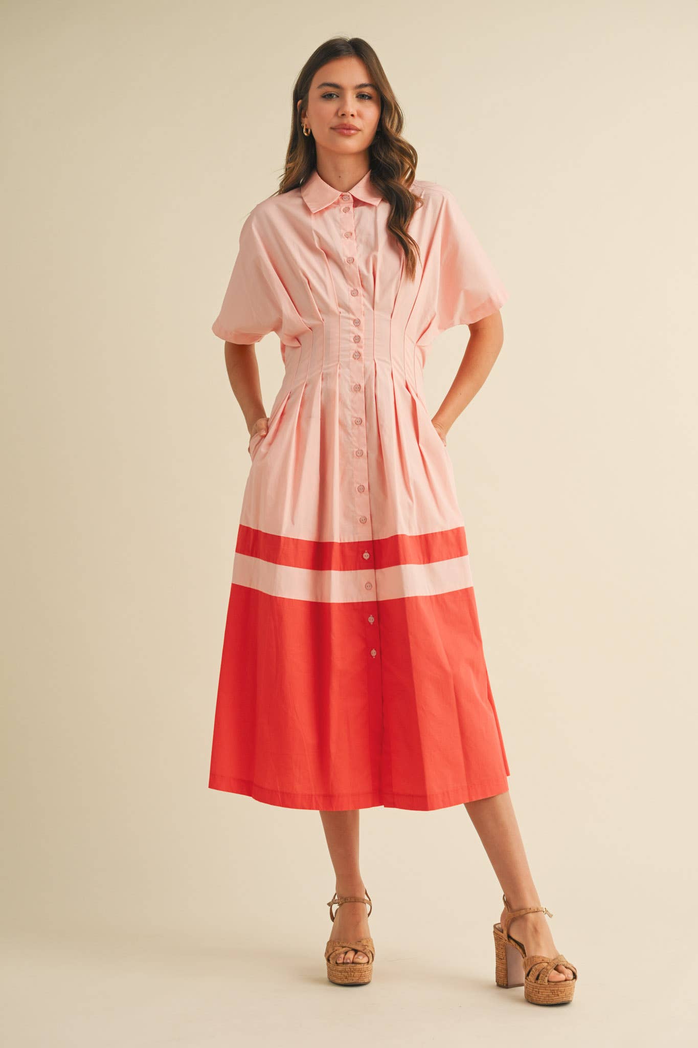 BUTTON DOWN PLEATED WAIST COLOR BLOCK MIDI DRESS MDR3556