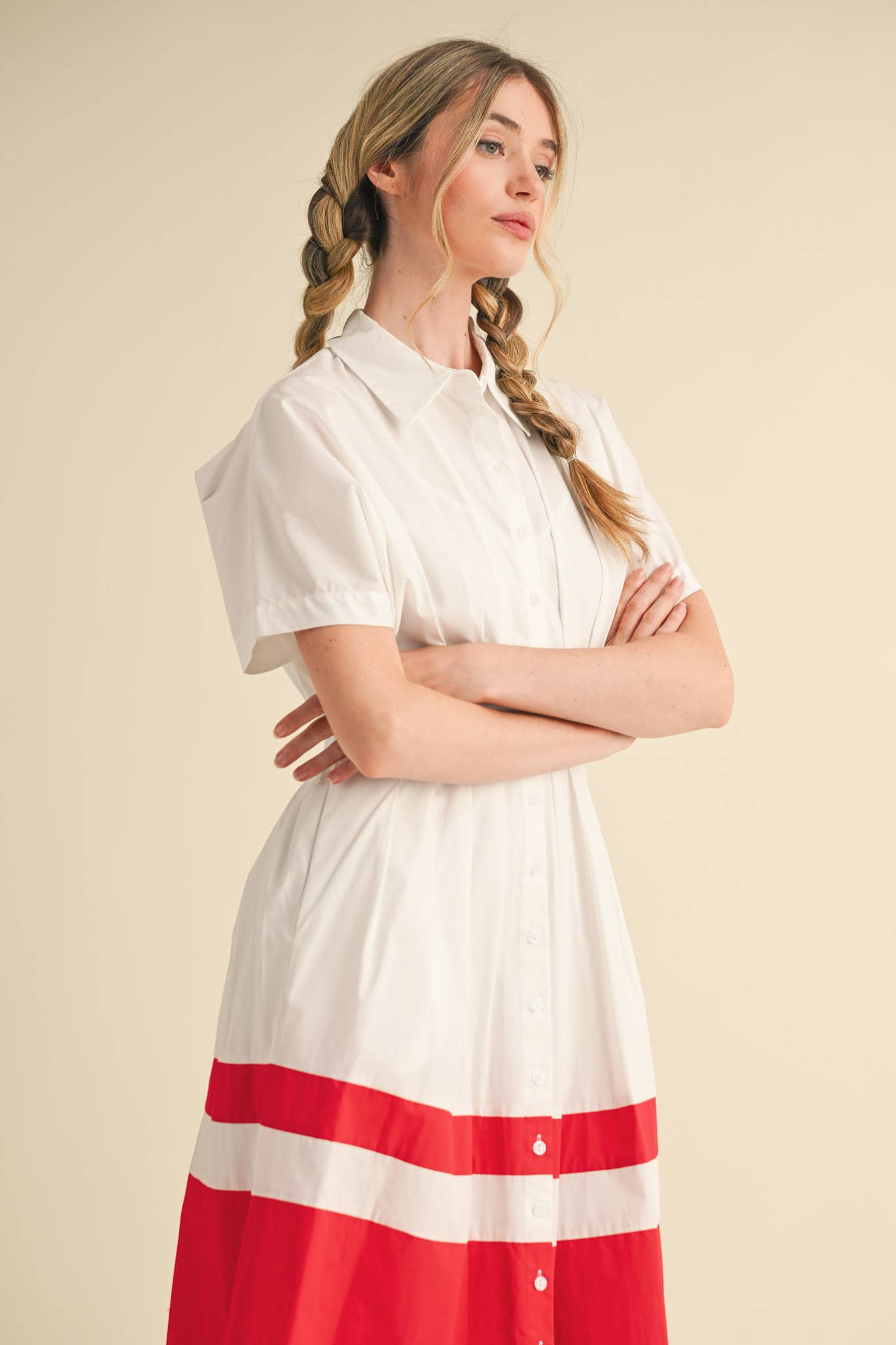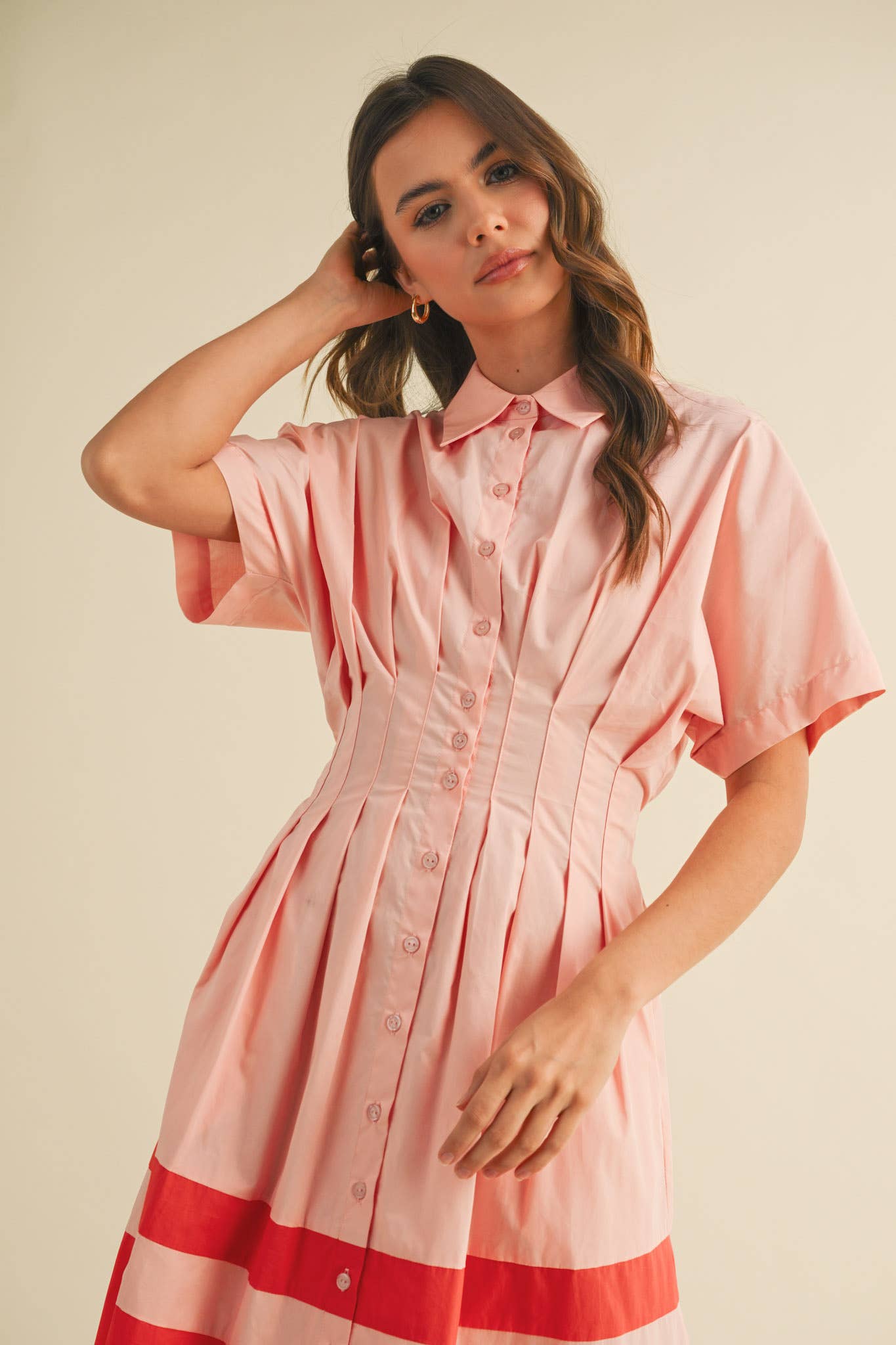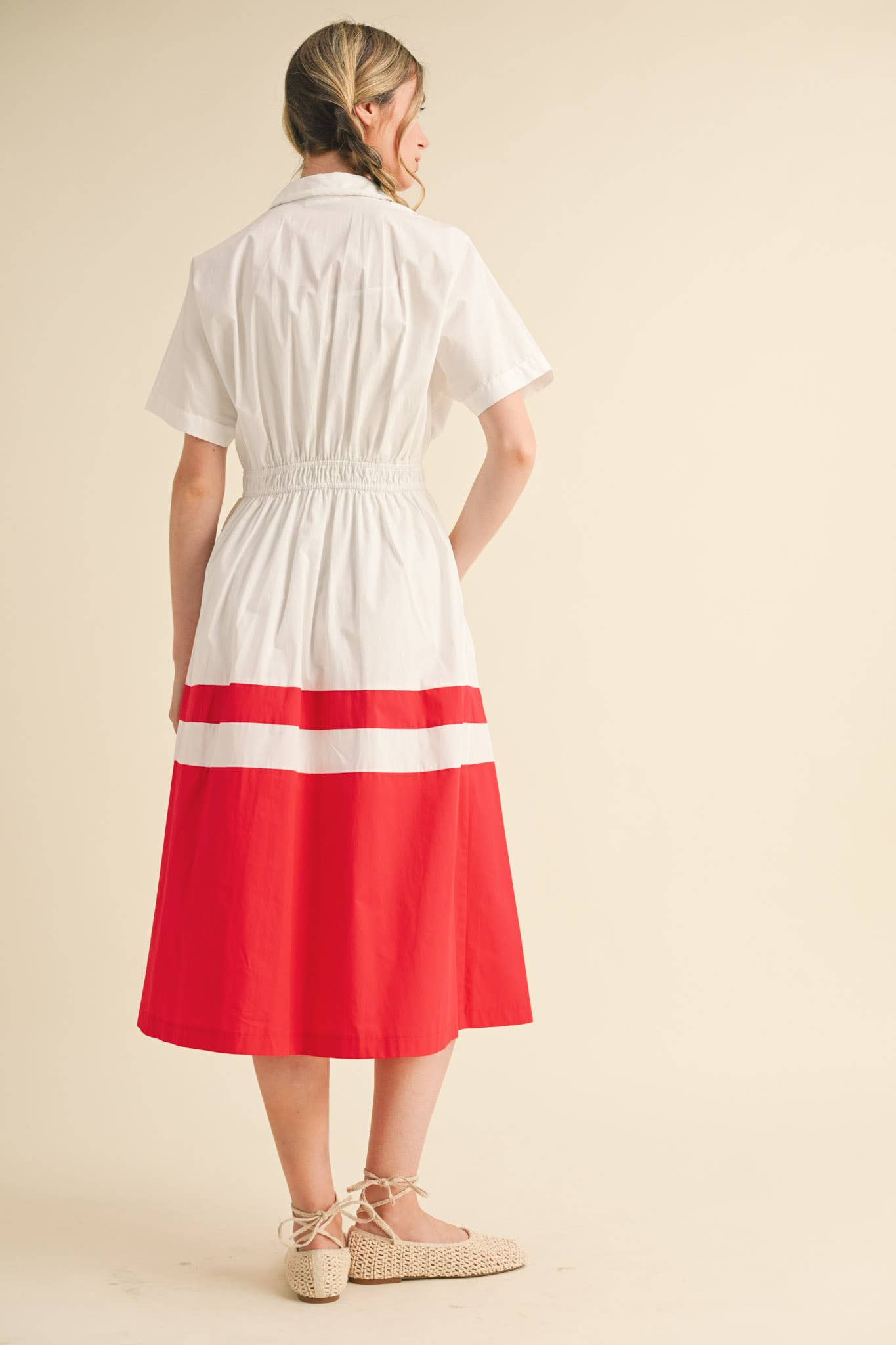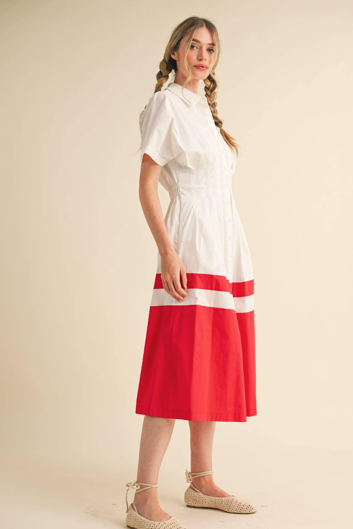BUTTON DOWN PLEATED WAIST COLOR BLOCK MIDI DRESS MDR3556