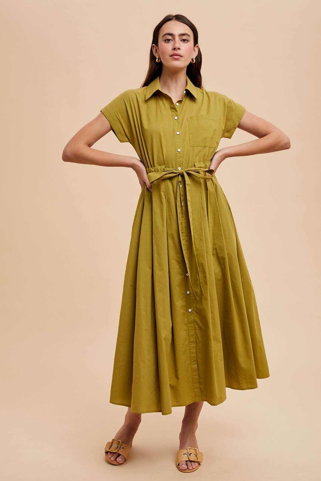 BUTTON DOWN SHIRT MAXI DRESS: OLIVE PALM / ILD6353