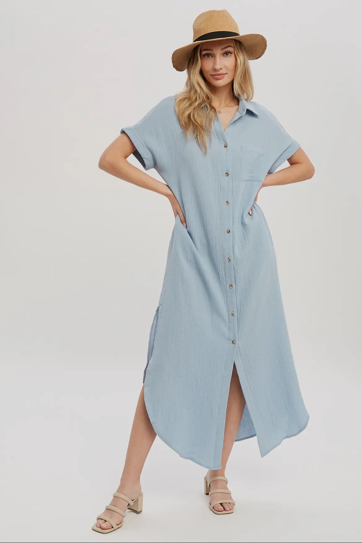 D01028 - Chambray - Short Sleeve Button Up Long T-Shirt Dress - Bluivy