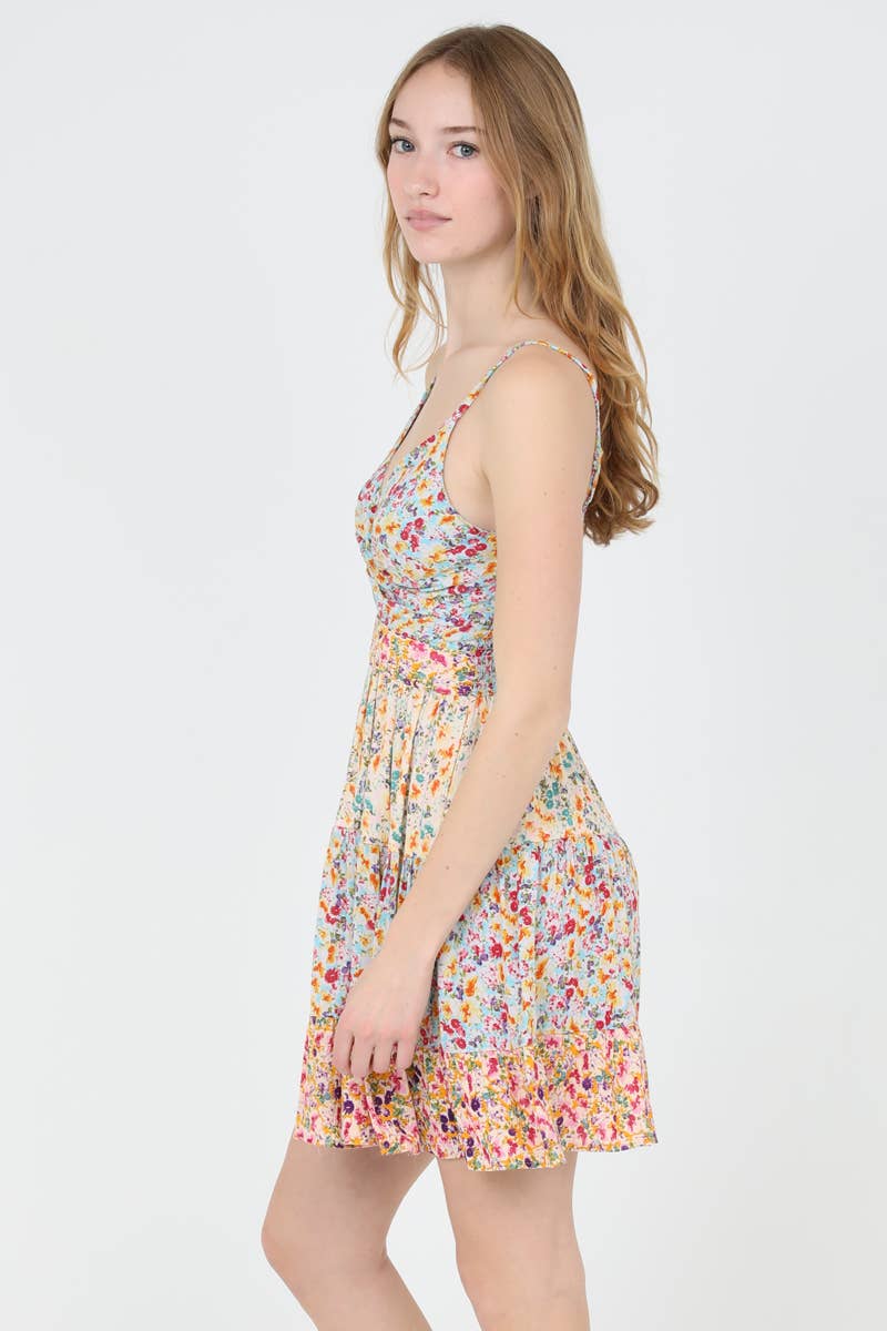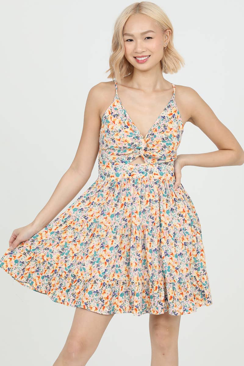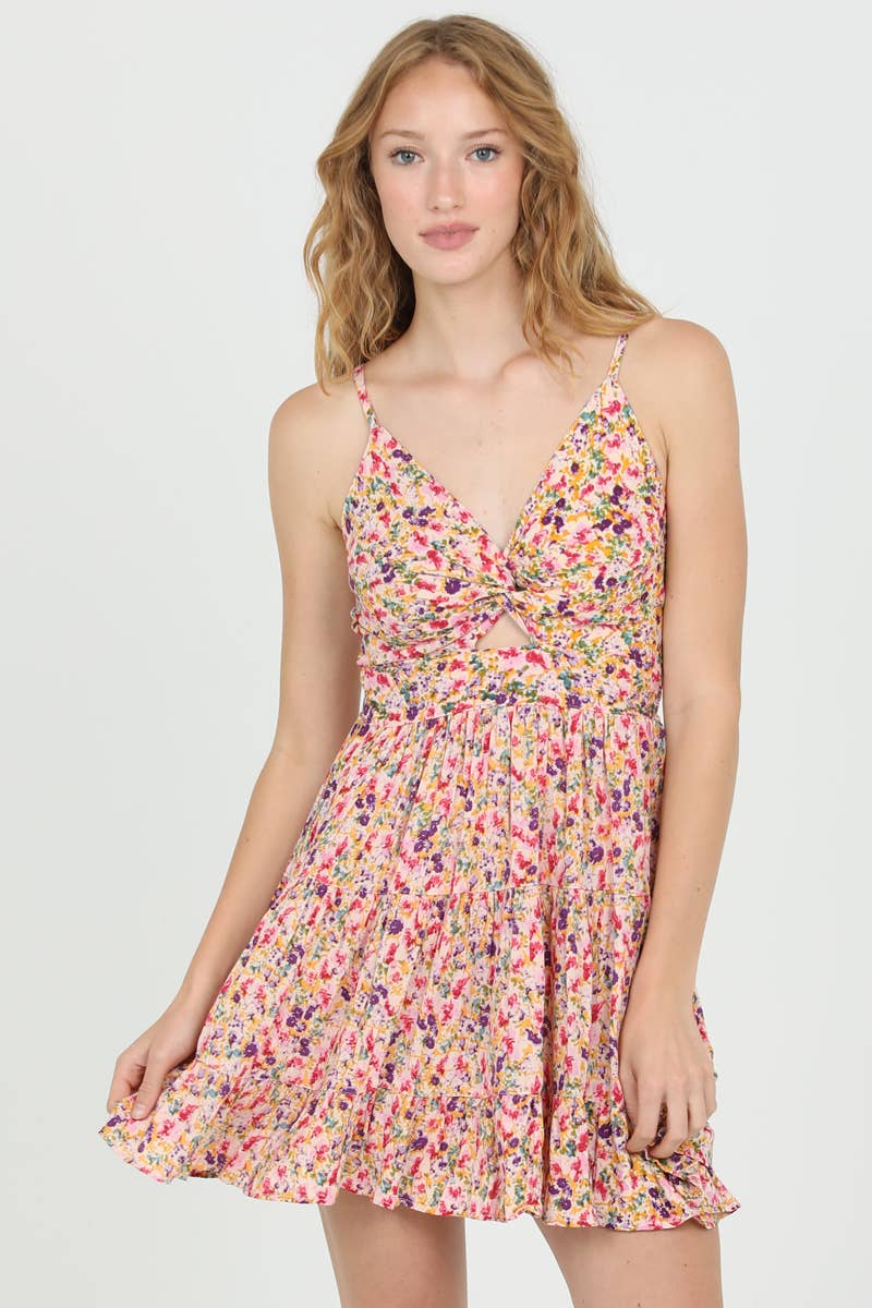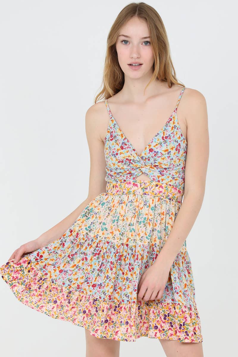 Introducing our multi-colored C4143-A814 V Neck Twist Front Sundress from Angie, a sundress that radiates bohemian charm and vibrant energy. Designed with a global lifestyle in mind, this junior fit dress with a v-neck is perfect for a day party or everyday wear. The floral pattern and mini length make it a standout piece in any wardrobe. This sleeveless dress is not just a piece of clothing, but a work of art brought to life by our designers who scour the globe for inspiration. Bold, poetic, and wearable, it's the perfect piece for the every girl.