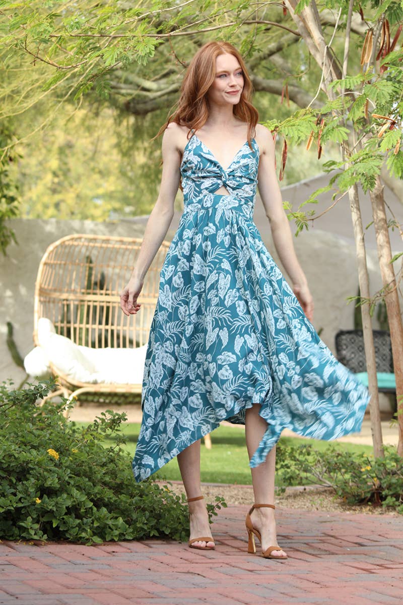 V NECK TWIST FRONT CUT OUT HANKY HEM DRESS