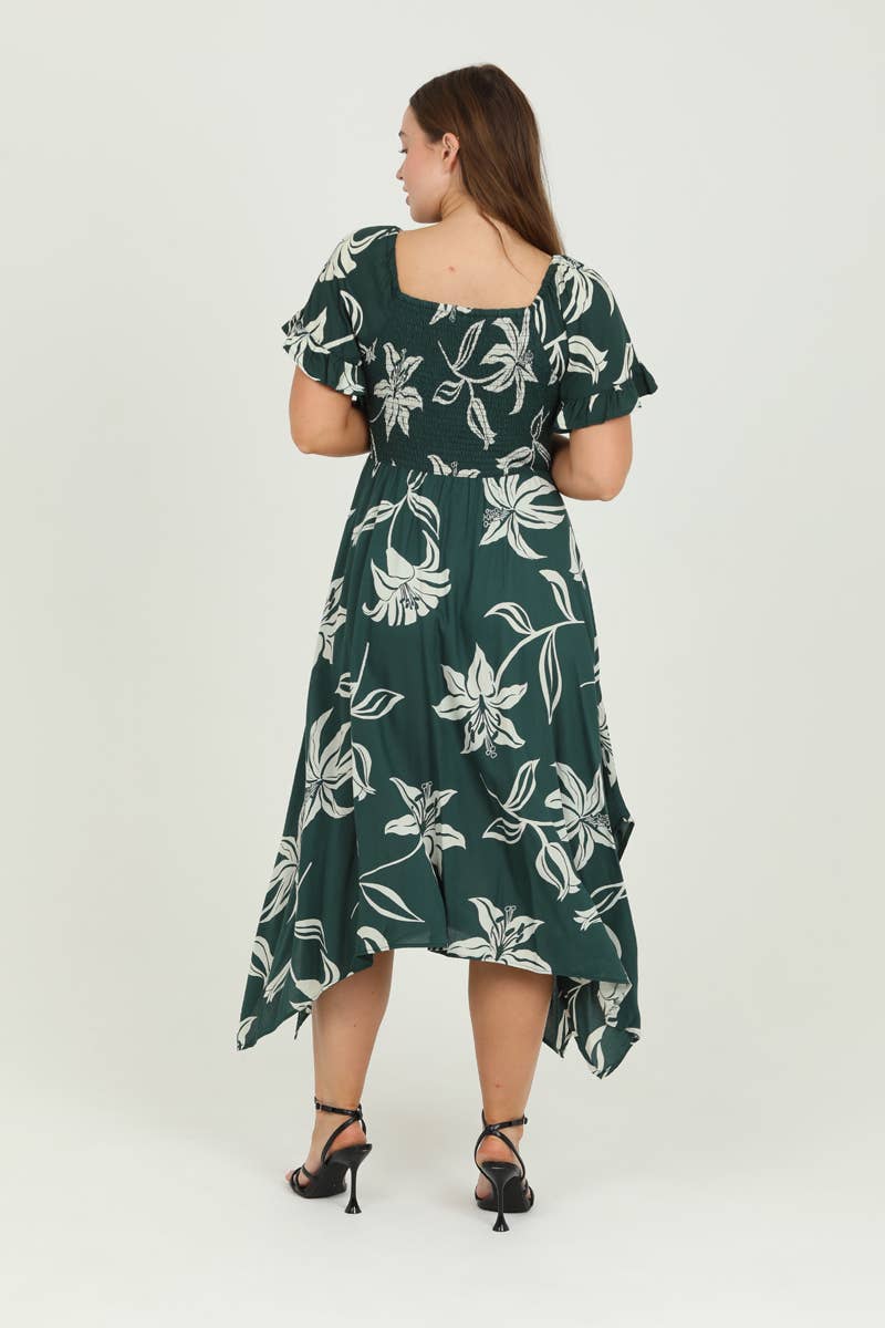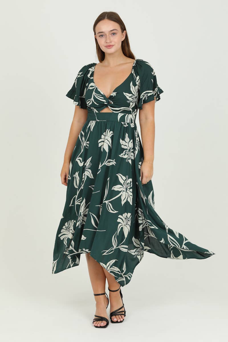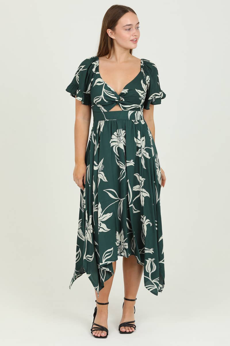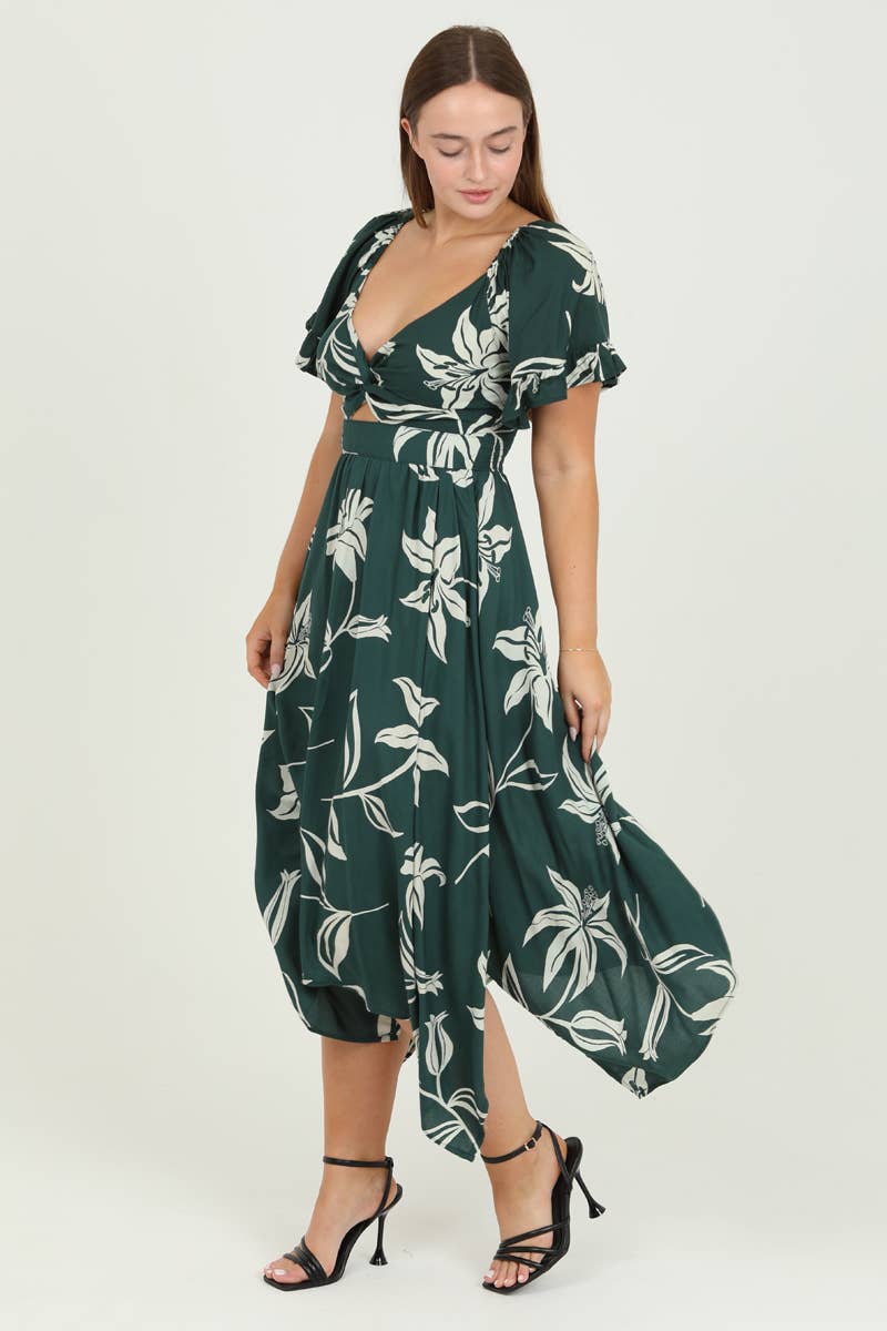 V NECK TWIST FRONT CUT OUT HANKY HEM MAXI DRESS