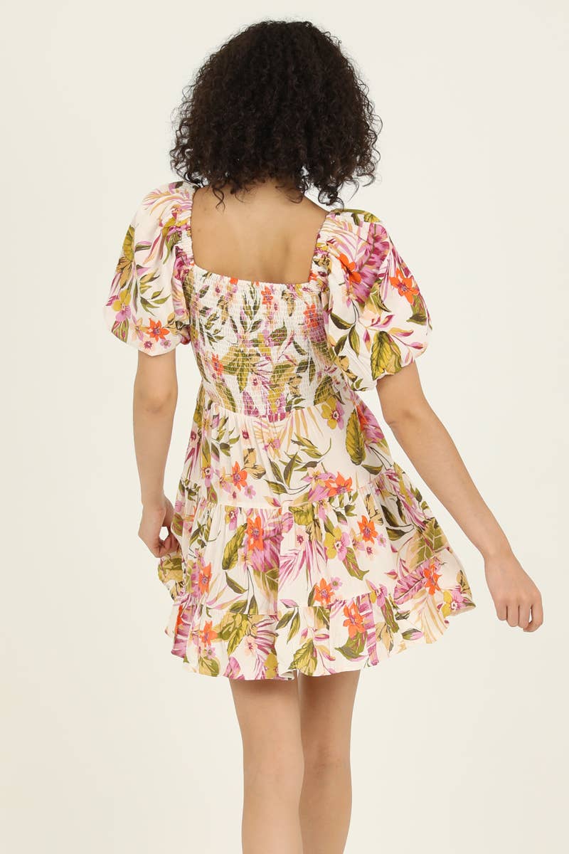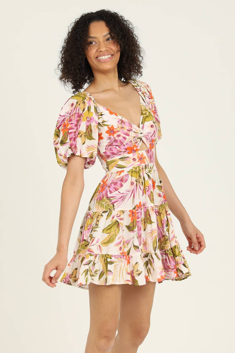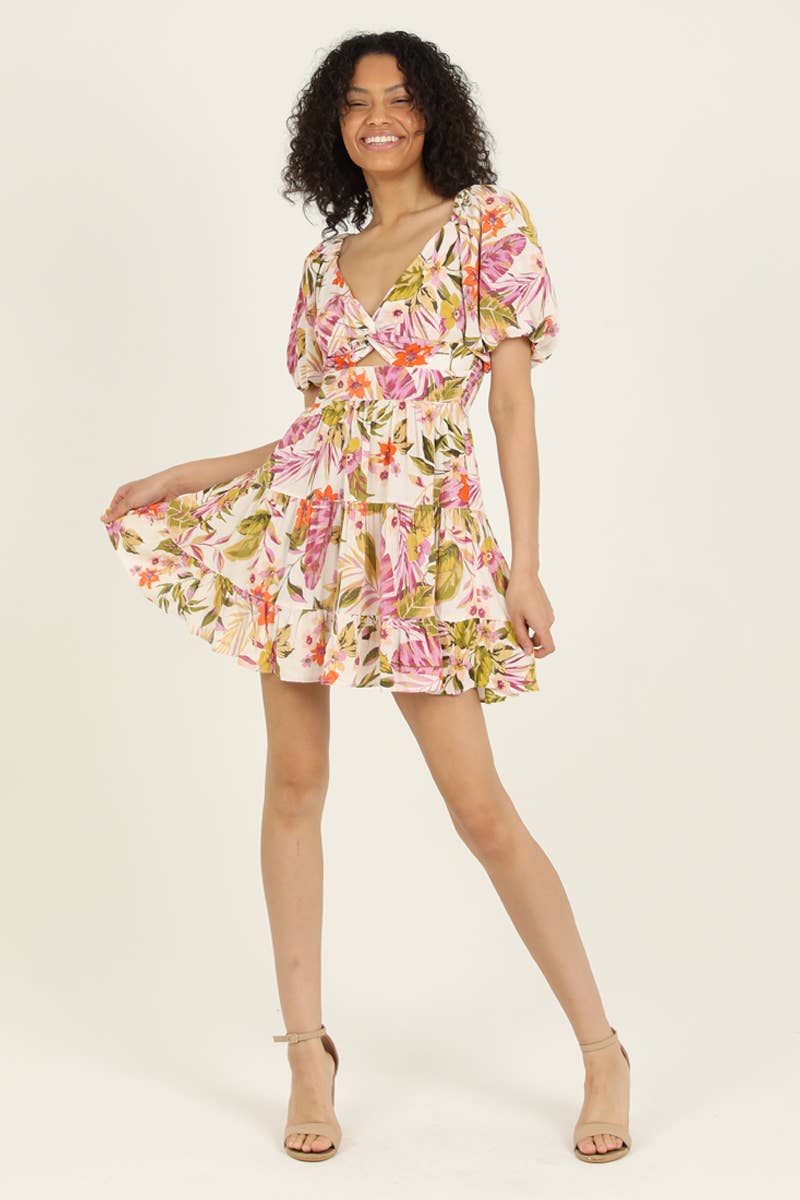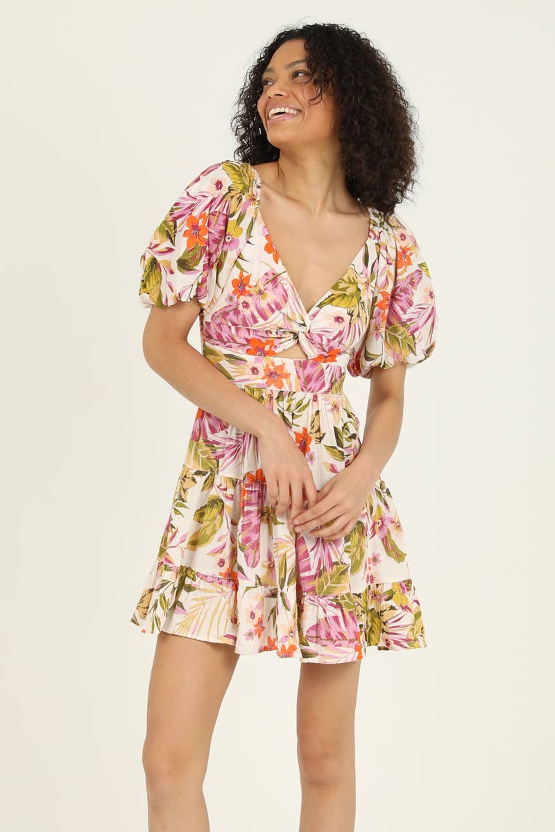 C4B91-A878 V NECK TWIST FRONT PUFF SLEEVE CUT OUT DRESS