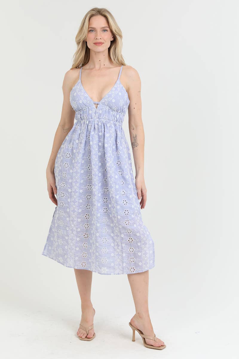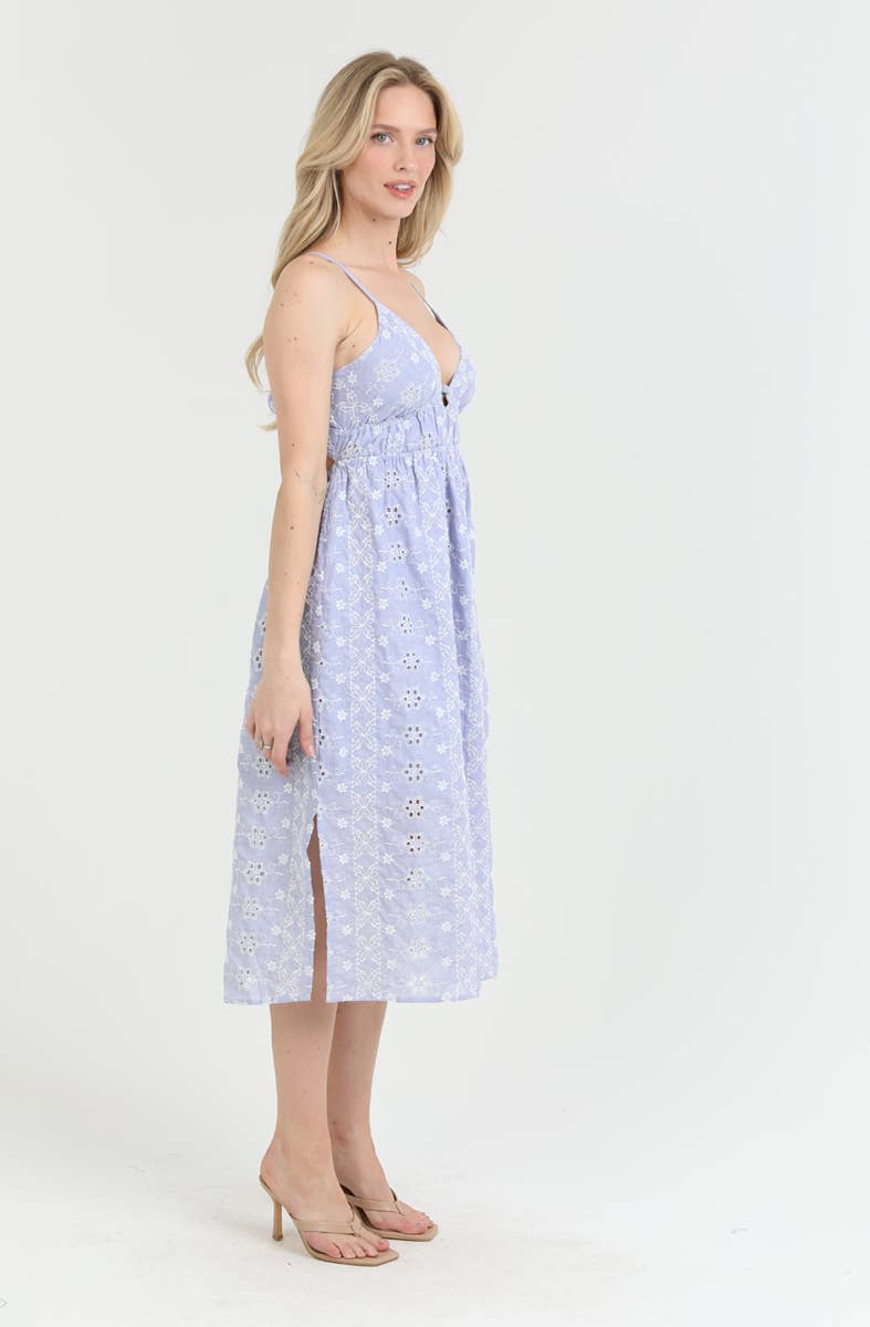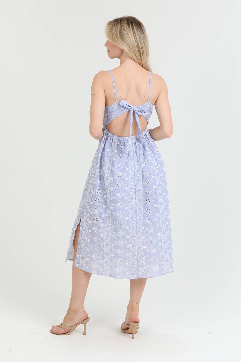 EYELET EMBBROIDERED TIE BACK MIDI DRESS