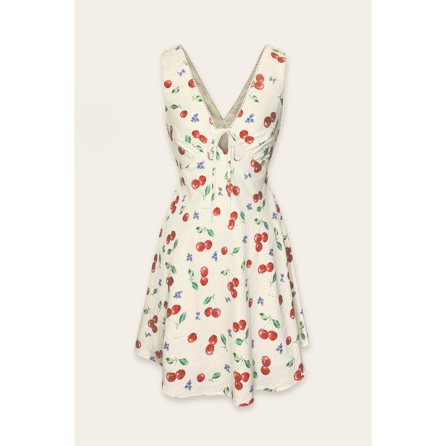 Fruit print mini dress featuring scallop lace trim on the plunging necklines.