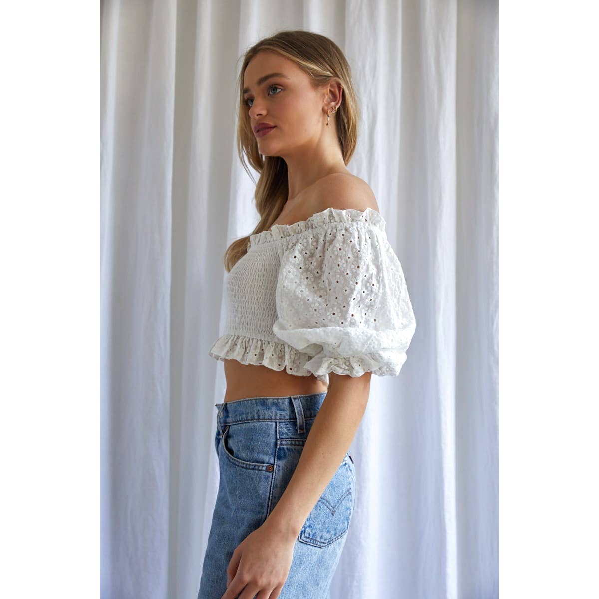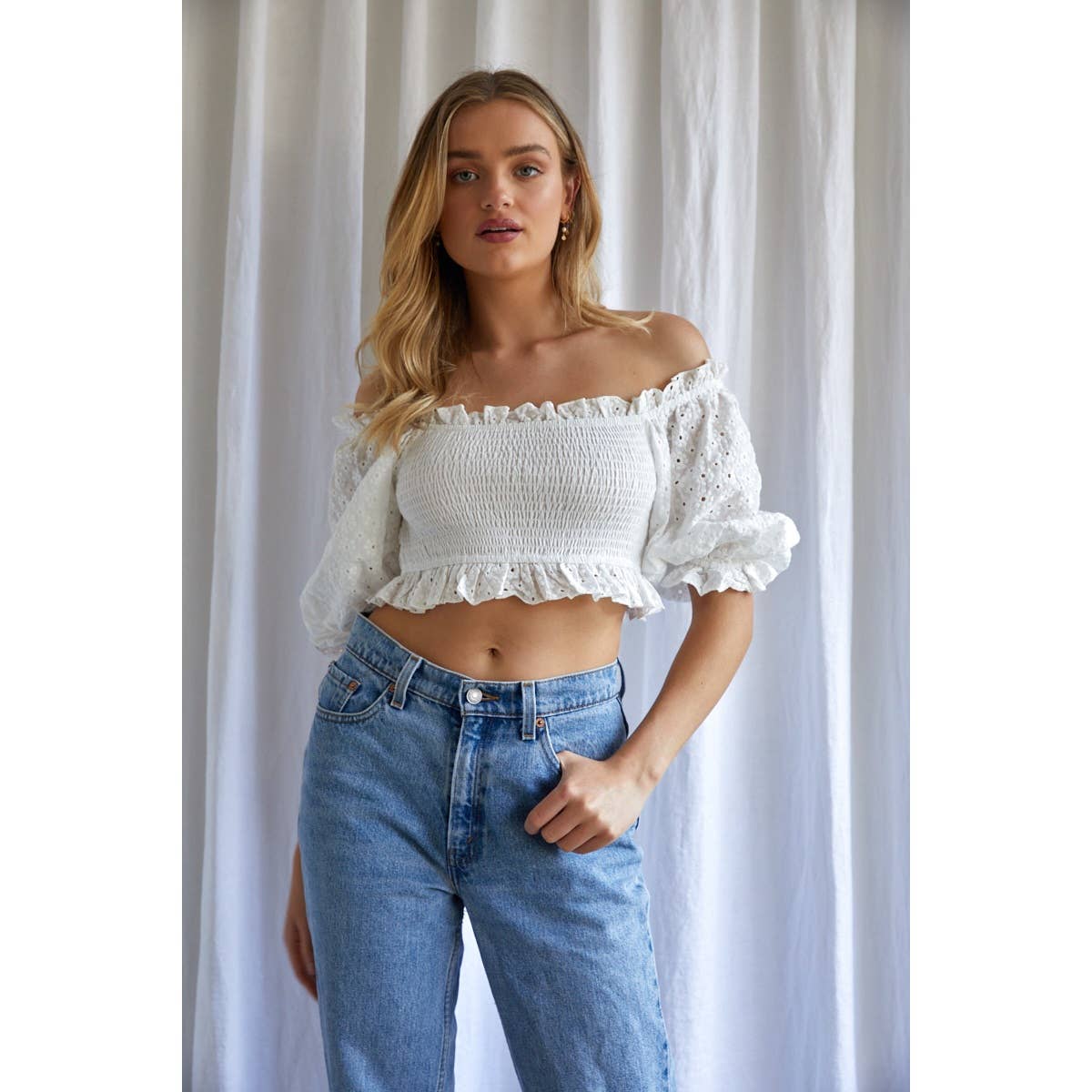 Cotton ruffled half balloon sleeve off the shoulder smocked crop top
