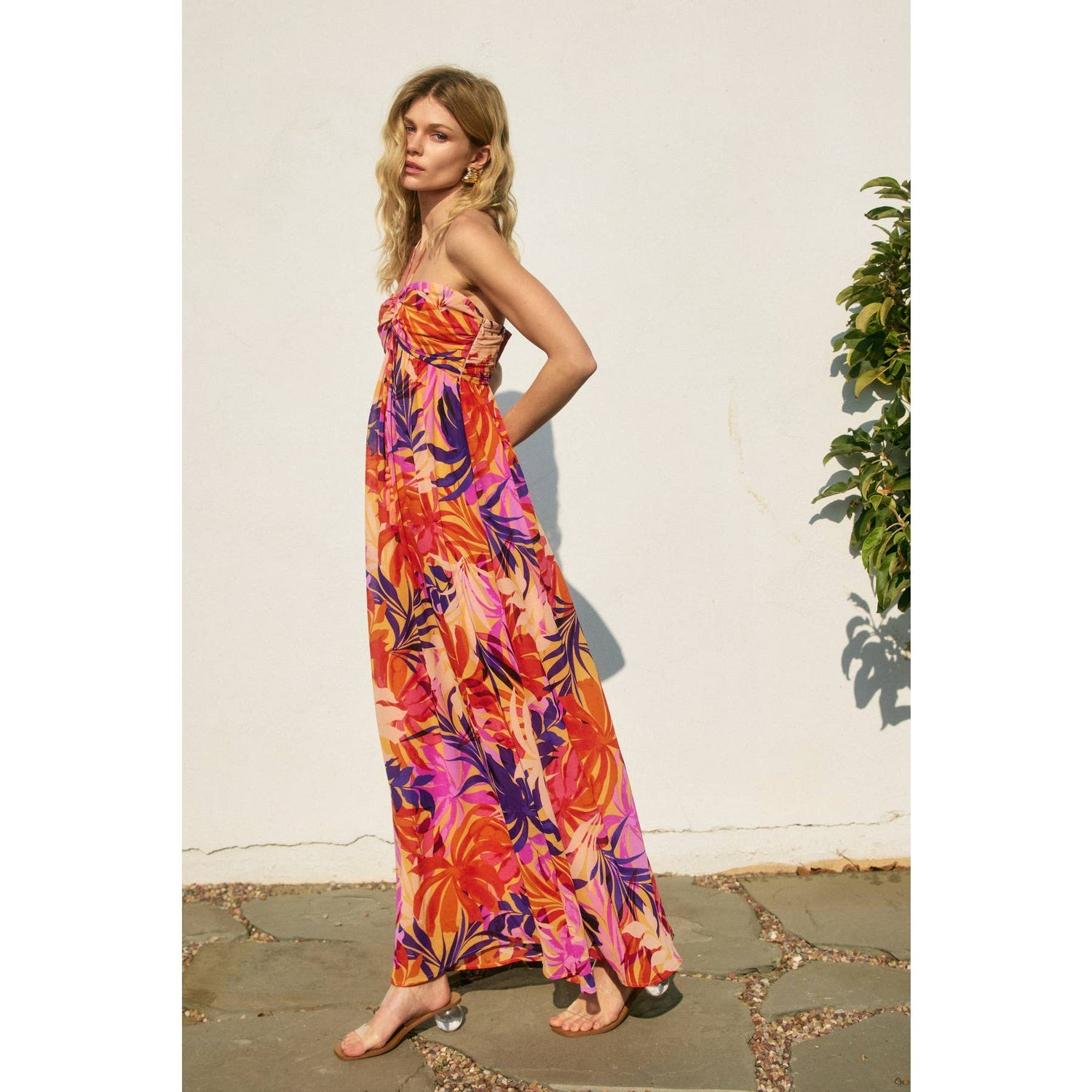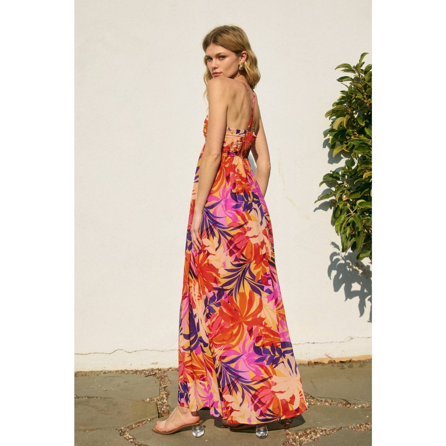 Coastal Cruising Ruched Babydoll Maxi Dress: SUNSET FRONDS / FD11400-P1998