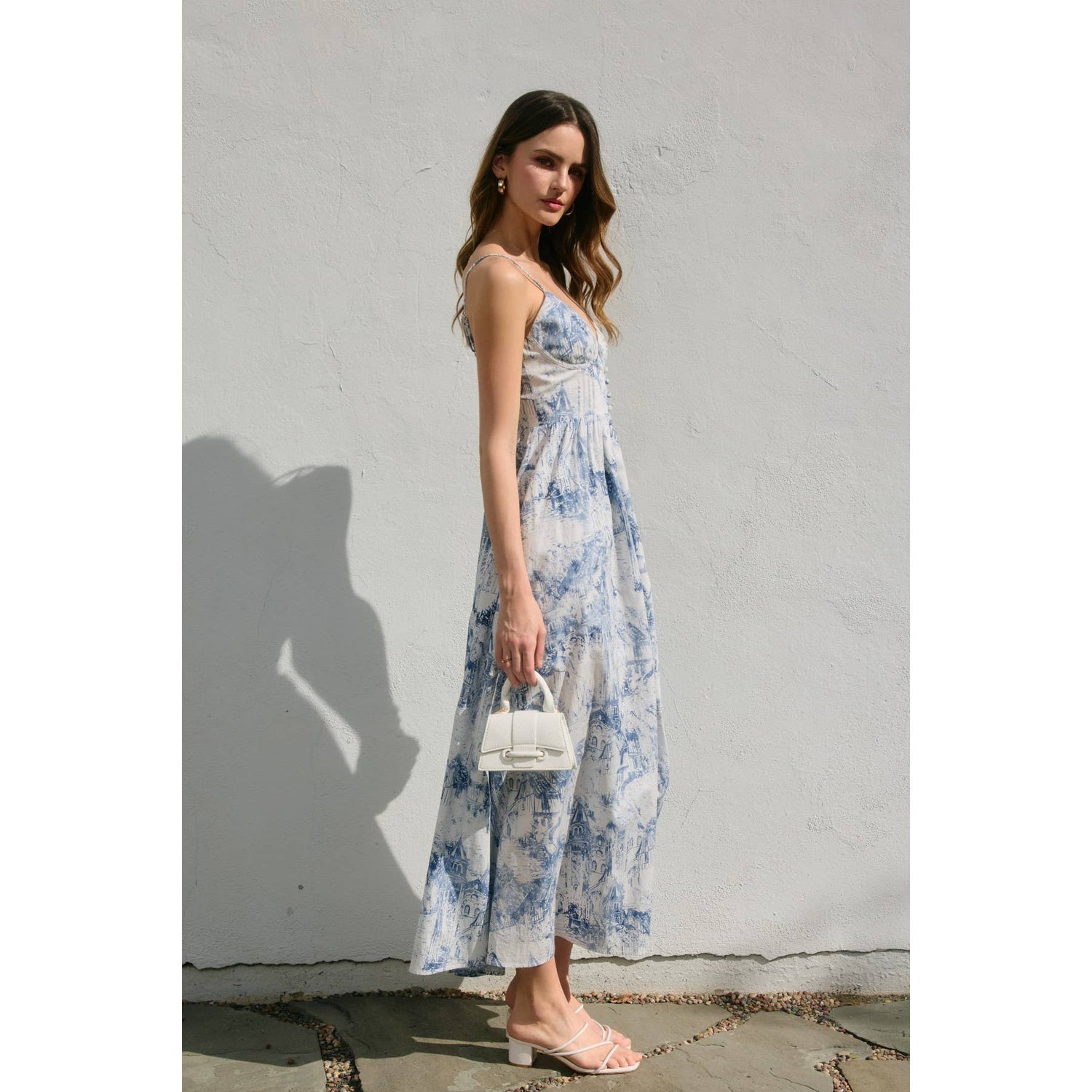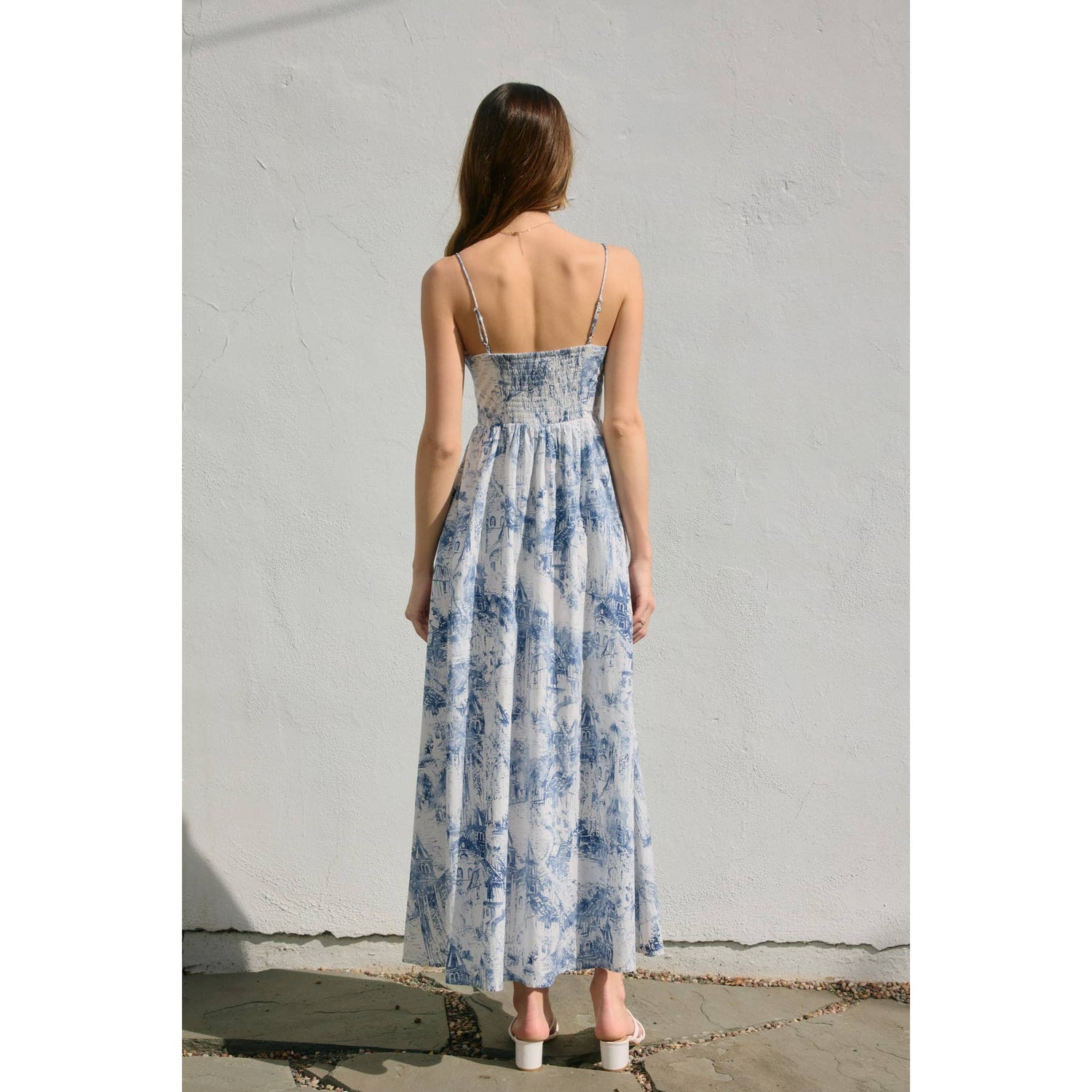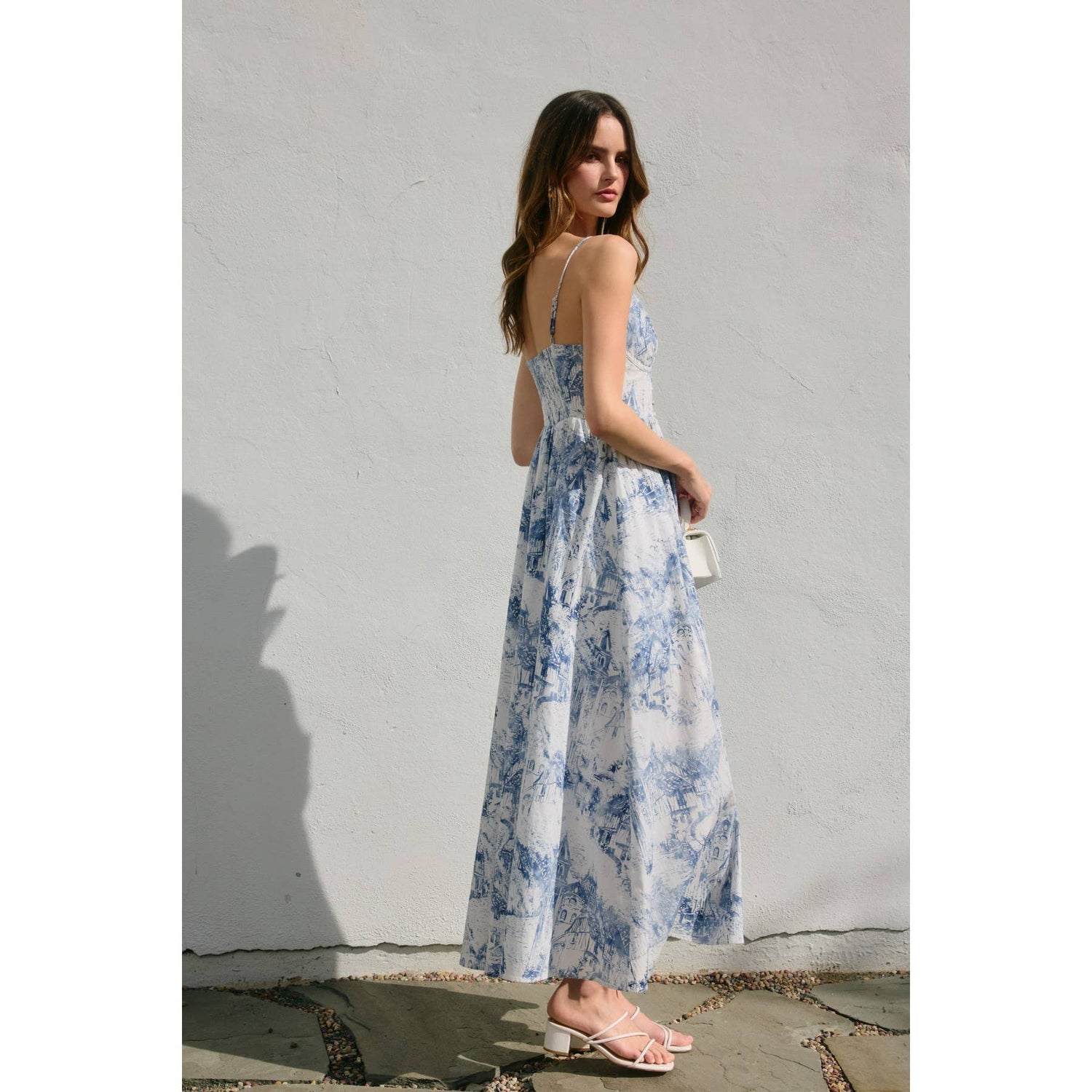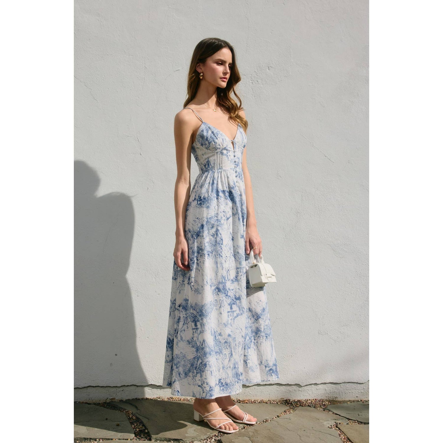 Printed sleeveless with the slit at the neckline maxi dress. Model is 5'9" and wearing size Small.