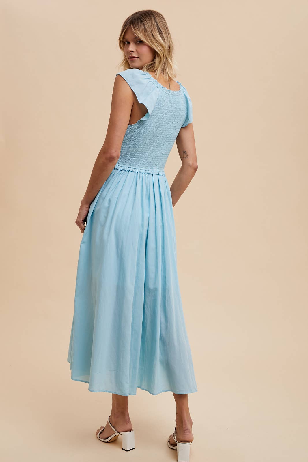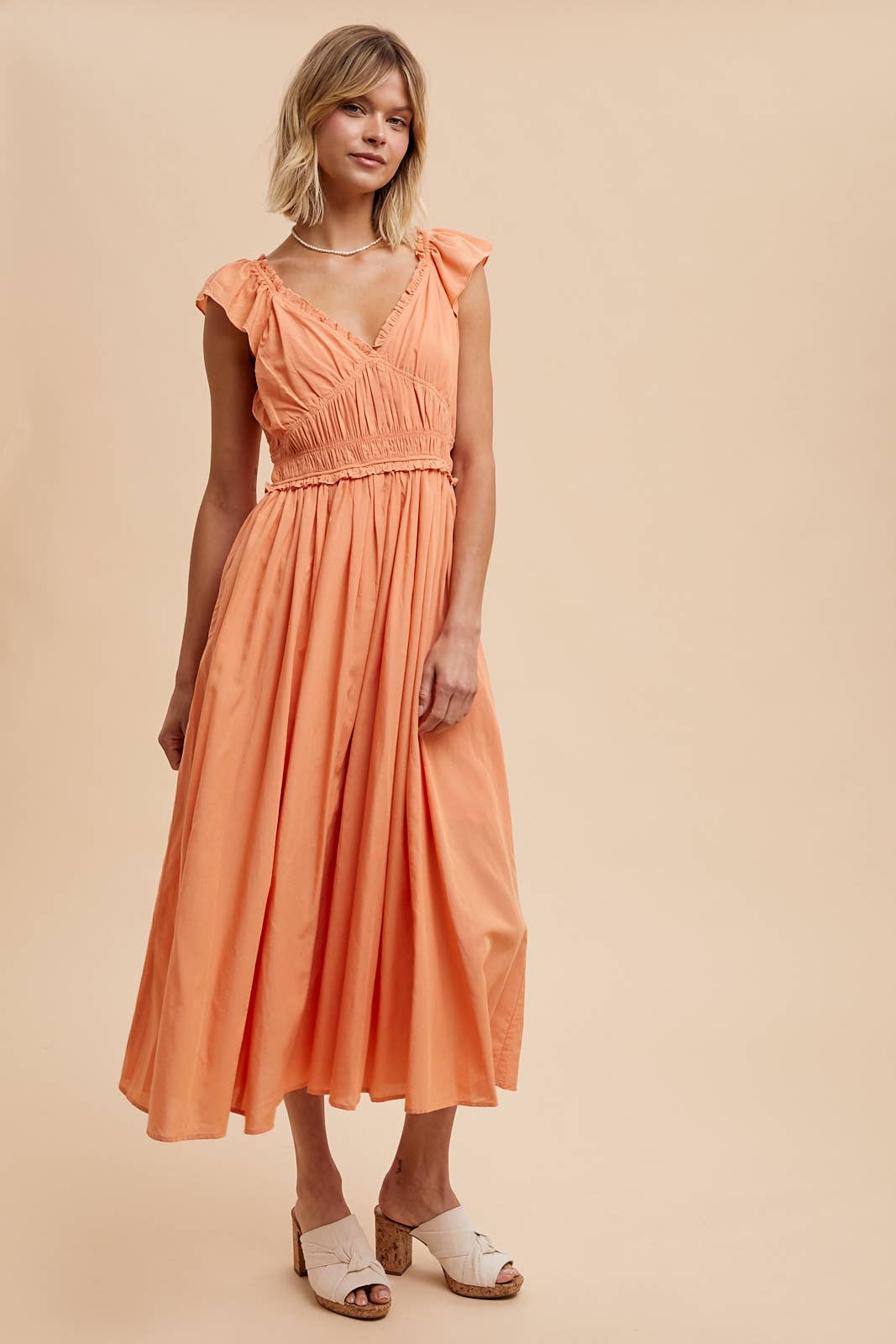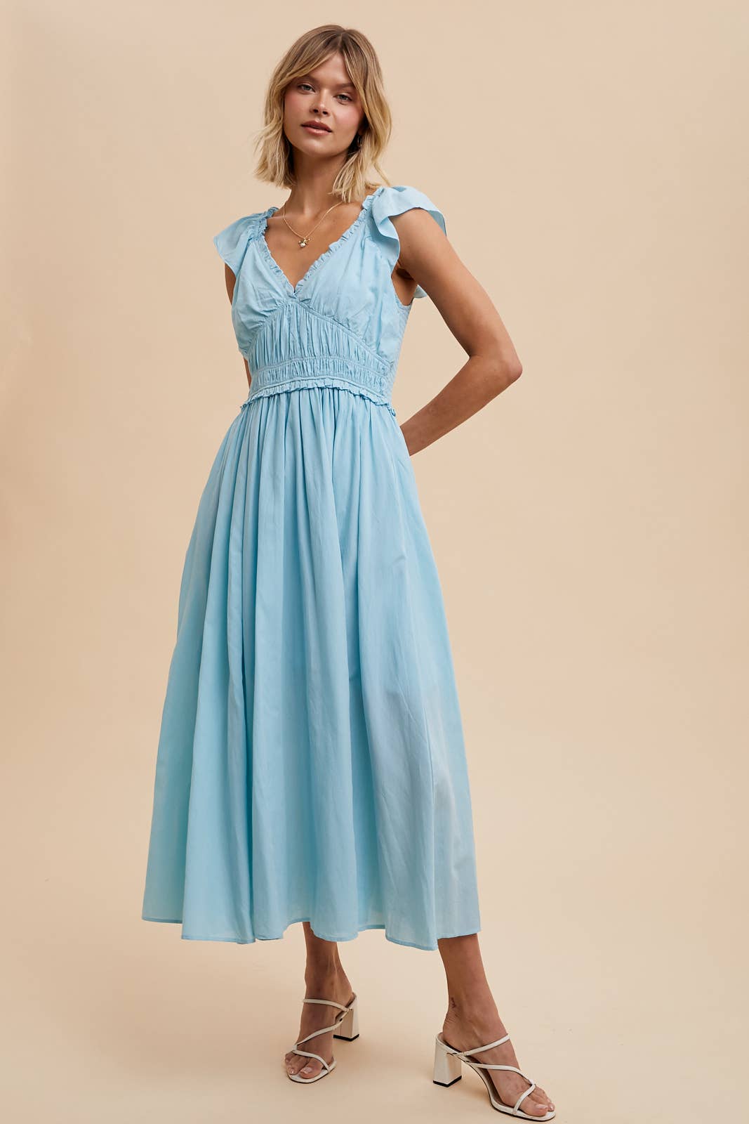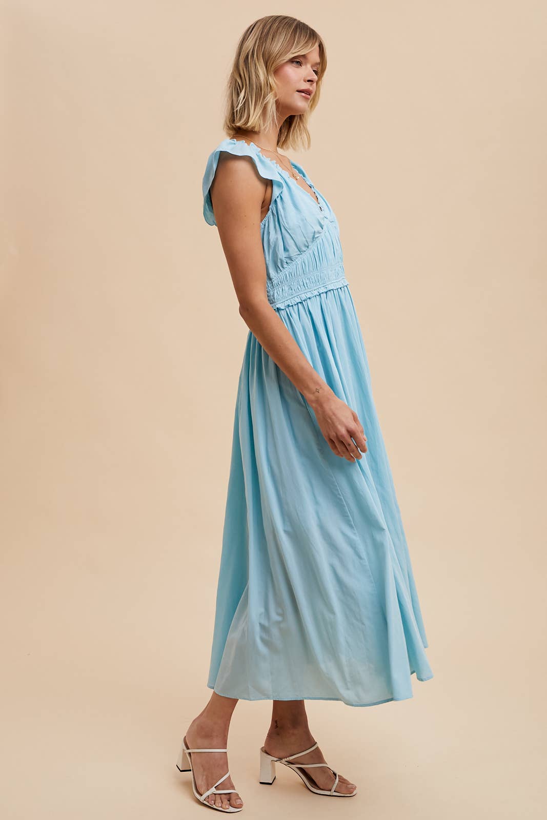 FLOWY COTTON BLEND MAXI DRESS FEATURES: GATHERED SWEETHEART NECKLINE WITH RUFFLED EDGES, SMOCKED BACK BODICE, SIDE POCKETS, AND FULL LINING.