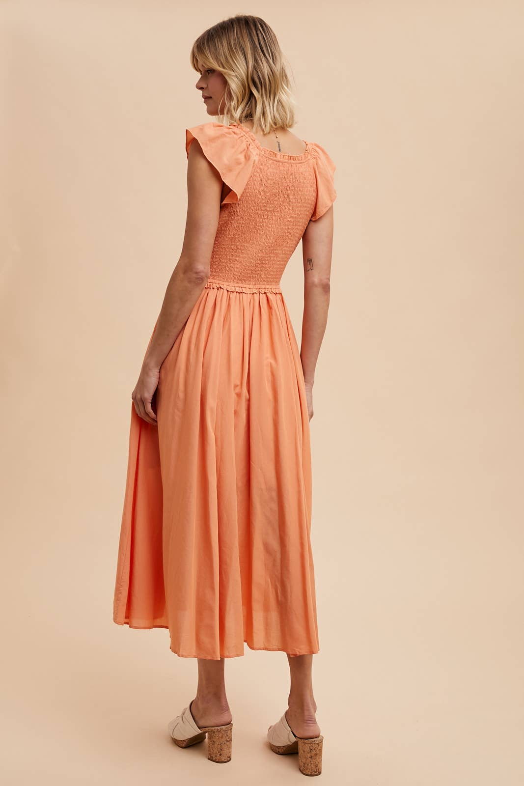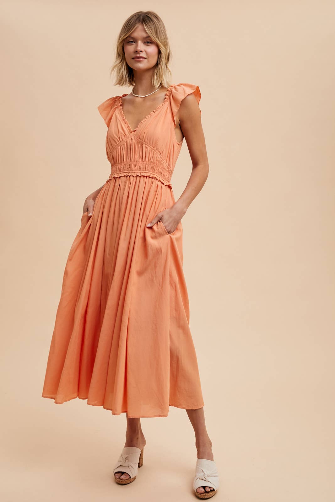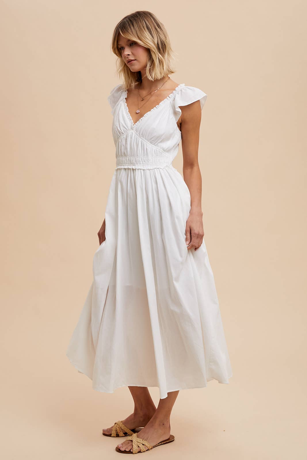 FLOWY COTTON BLEND MAXI DRESS FEATURES: GATHERED SWEETHEART NECKLINE WITH RUFFLED EDGES, SMOCKED BACK BODICE, SIDE POCKETS, AND FULL LINING.