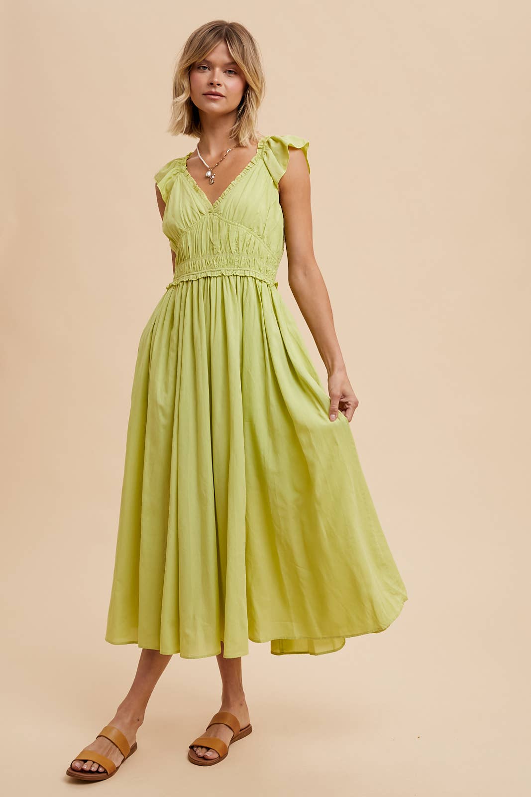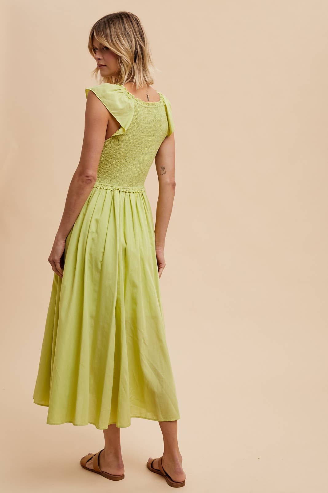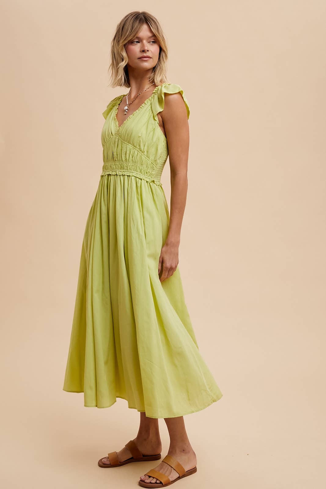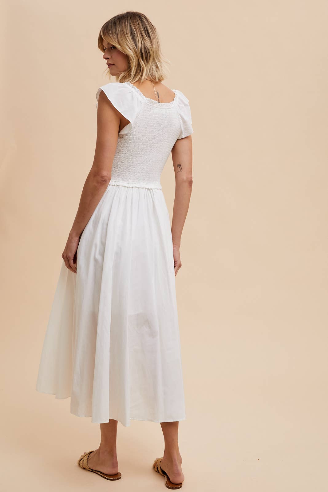 FLOWY COTTON BLEND MAXI DRESS FEATURES: GATHERED SWEETHEART NECKLINE WITH RUFFLED EDGES, SMOCKED BACK BODICE, SIDE POCKETS, AND FULL LINING.