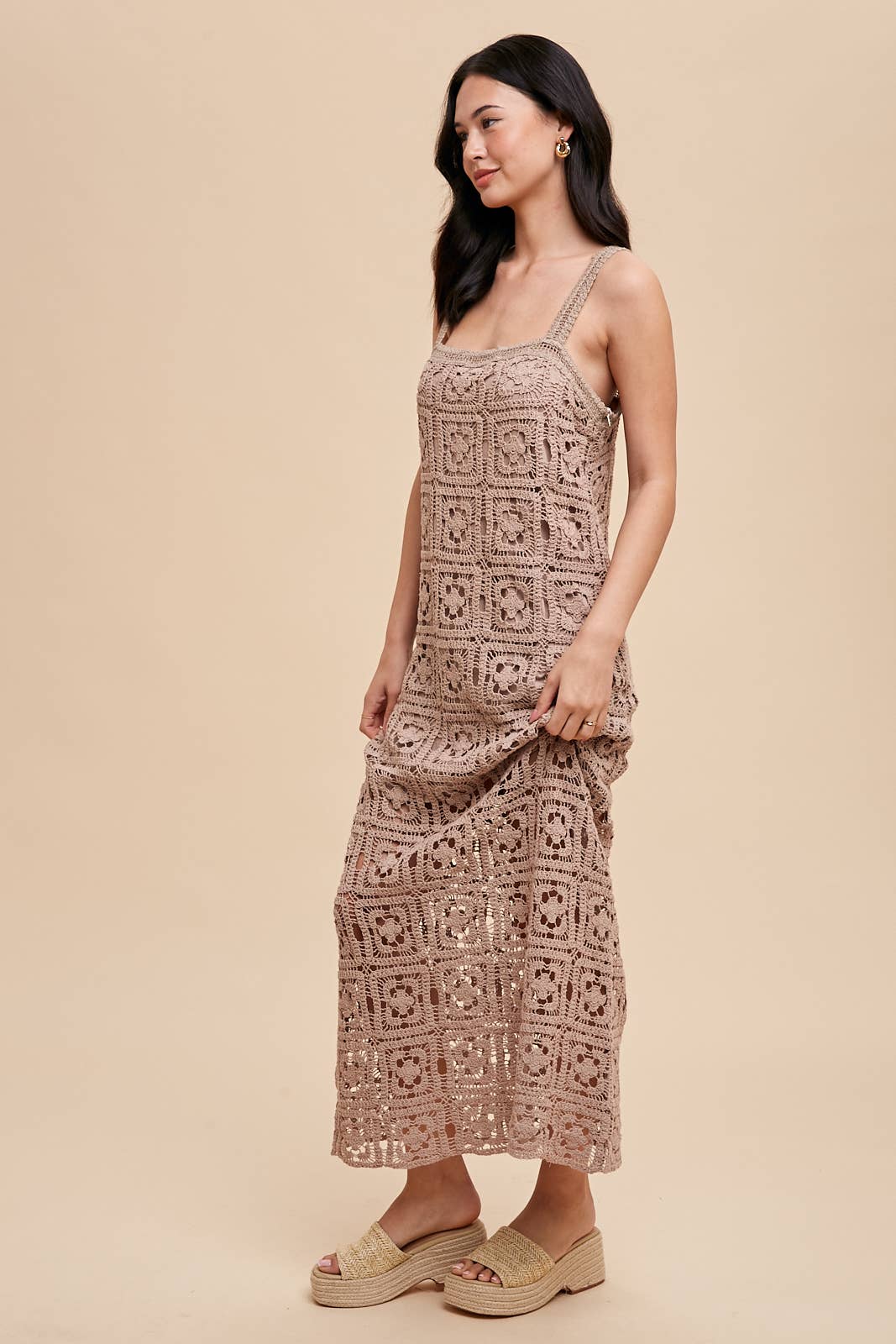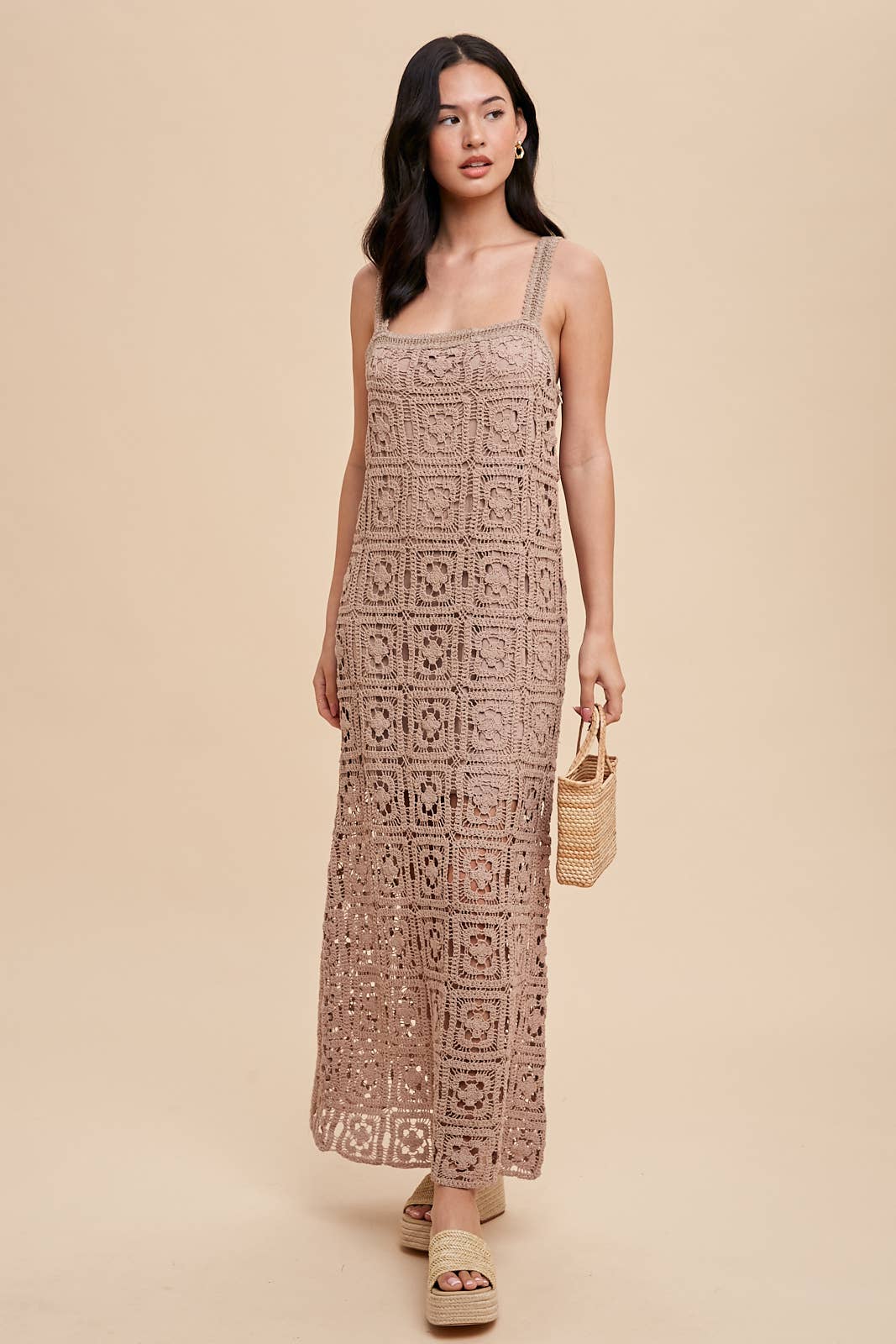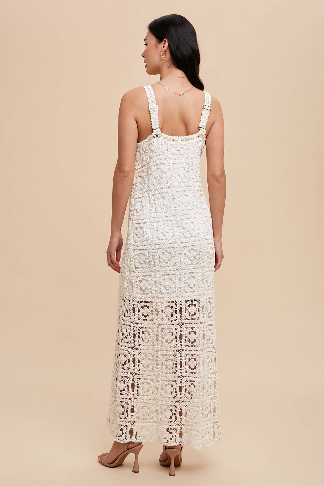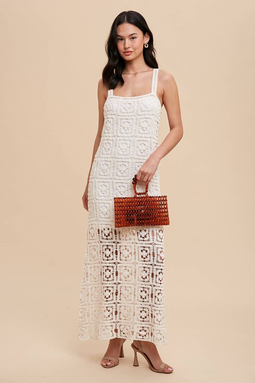 THE PERFECT RESORT WEAR DRESS IS HERE! SQUARE NECK MAXI DRESS FEATURES: COTTON CROCHET FABRICATION, TANK STRAPS, CONCEALED SIDE ZIPPER AND LINING.