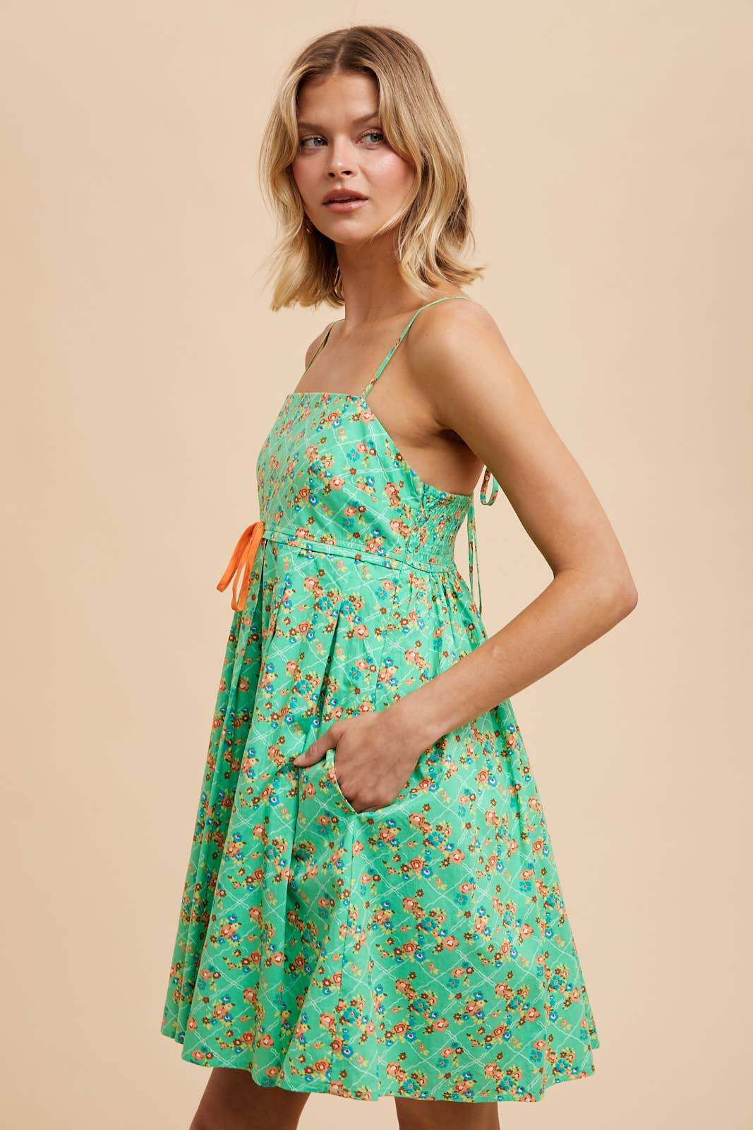 COTTON FLORAL SKATER DRESS: GREEN FLORAL / ILD5788