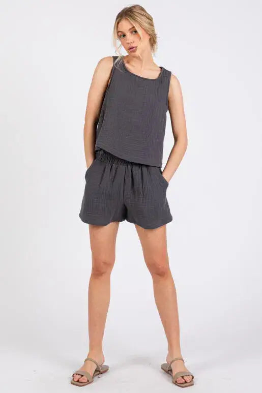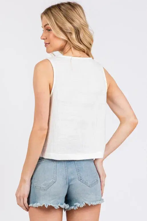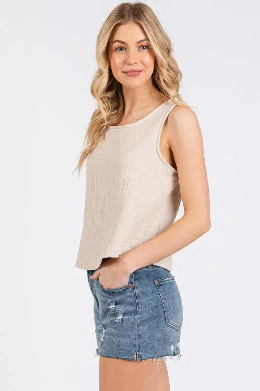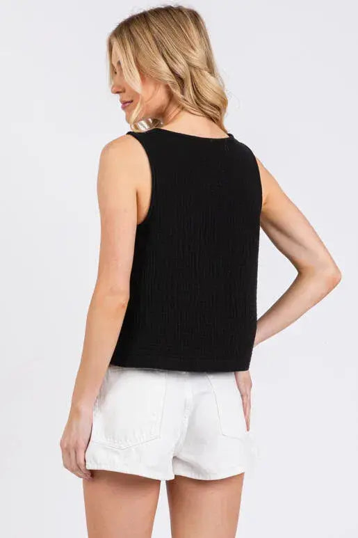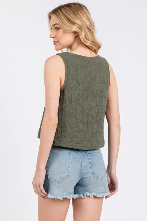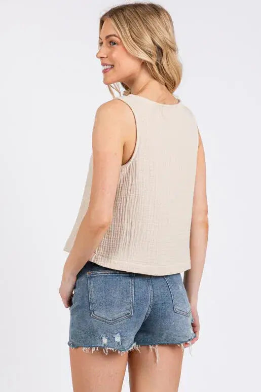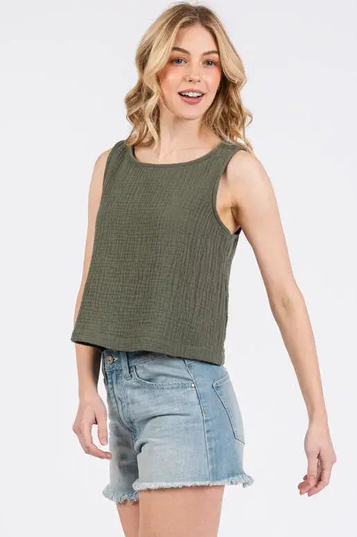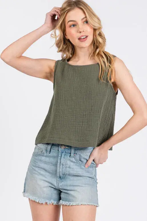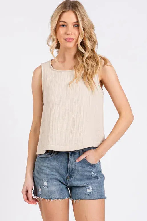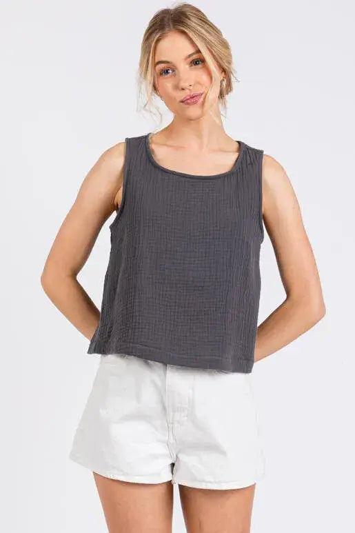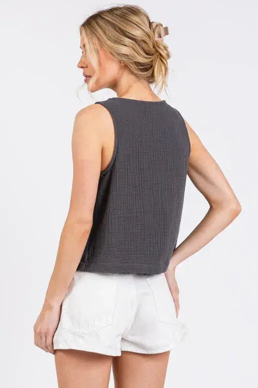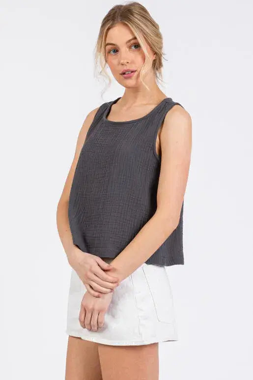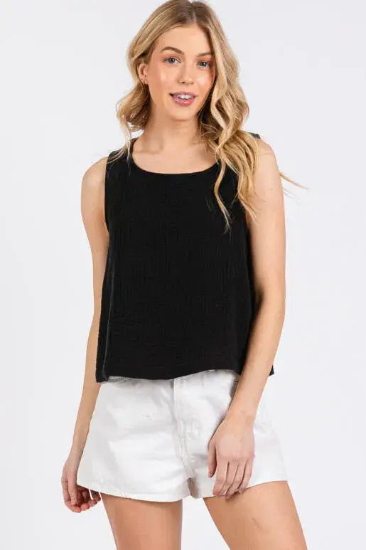 Cotton Gauze Round Neck Sleeveless Top - NT31273A: Black