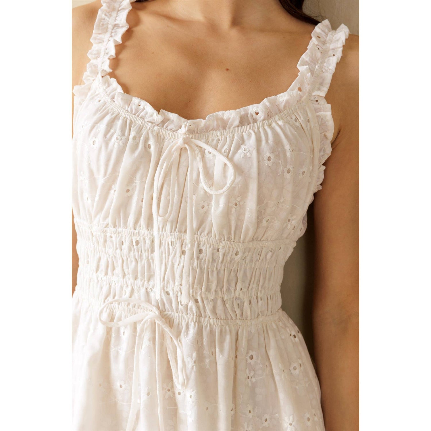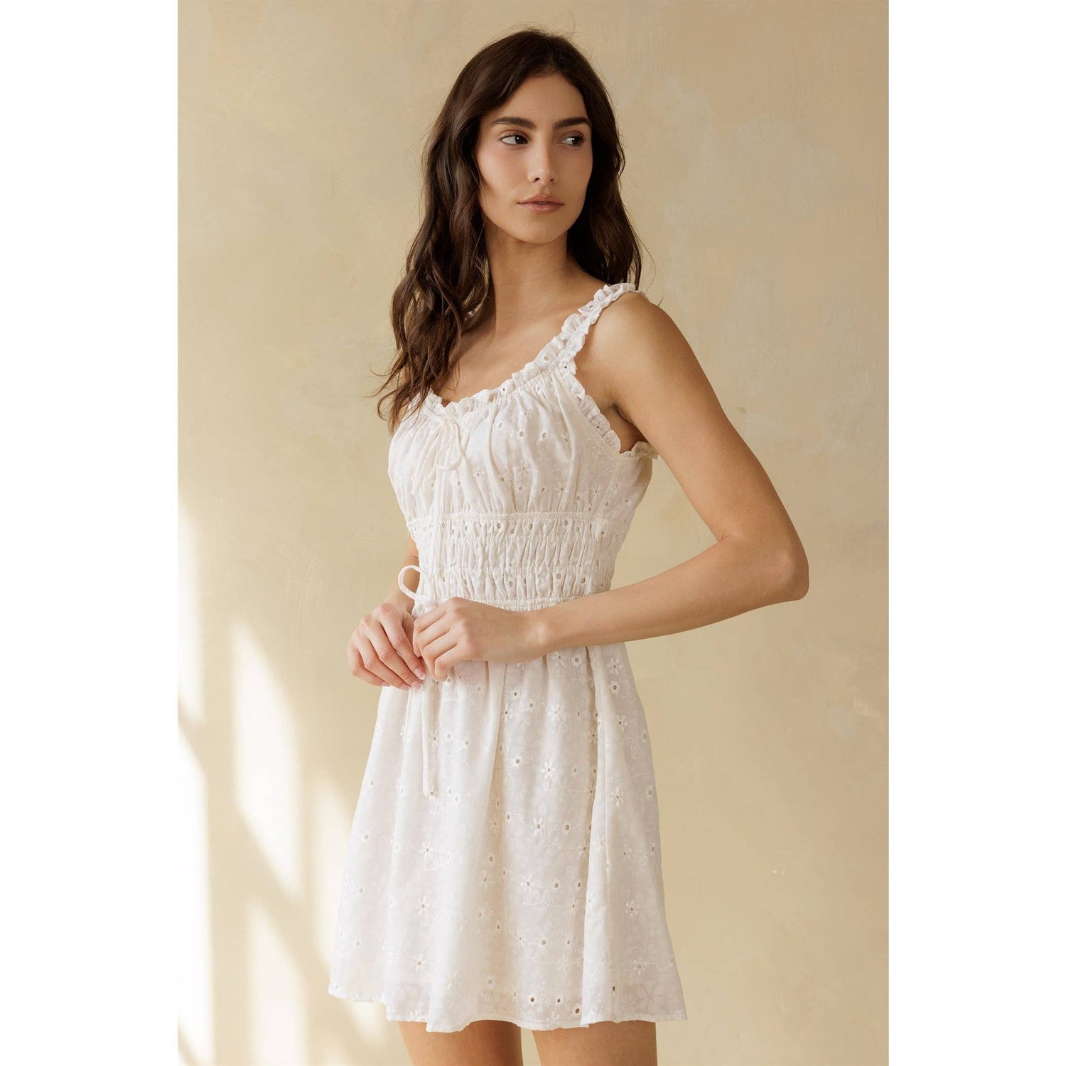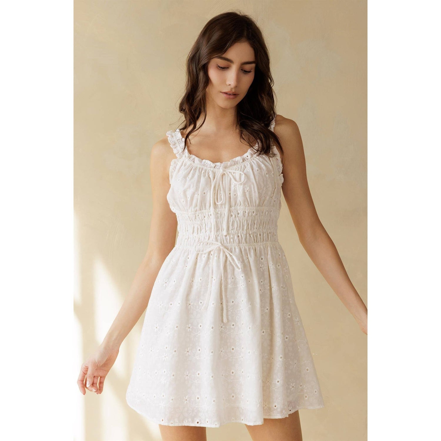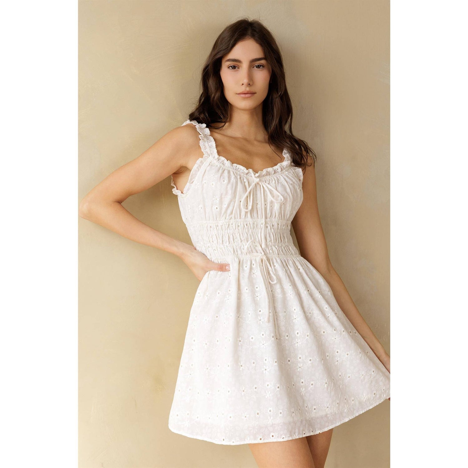 Channel effortless charm with this short and chic summer dress crafted from lightweight eyelet fabric in a soft white hue. The dress features delicate ruffle straps, a fitted bodice with comfortable smocking, and a flattering drawstring tie at the neckline. Subtle floral embroidery details enhance its feminine appeal, while the gently flared skirt adds a breezy touch.