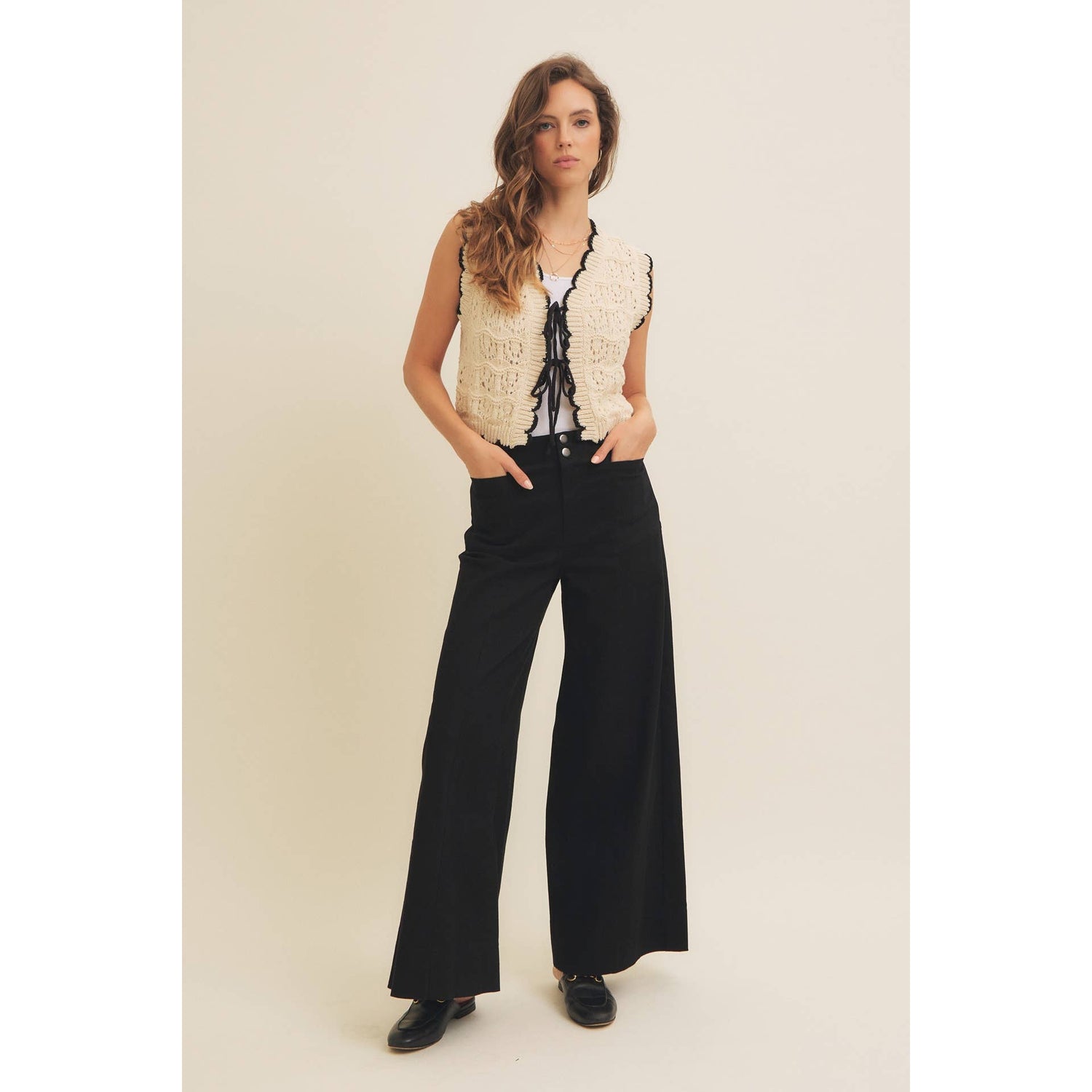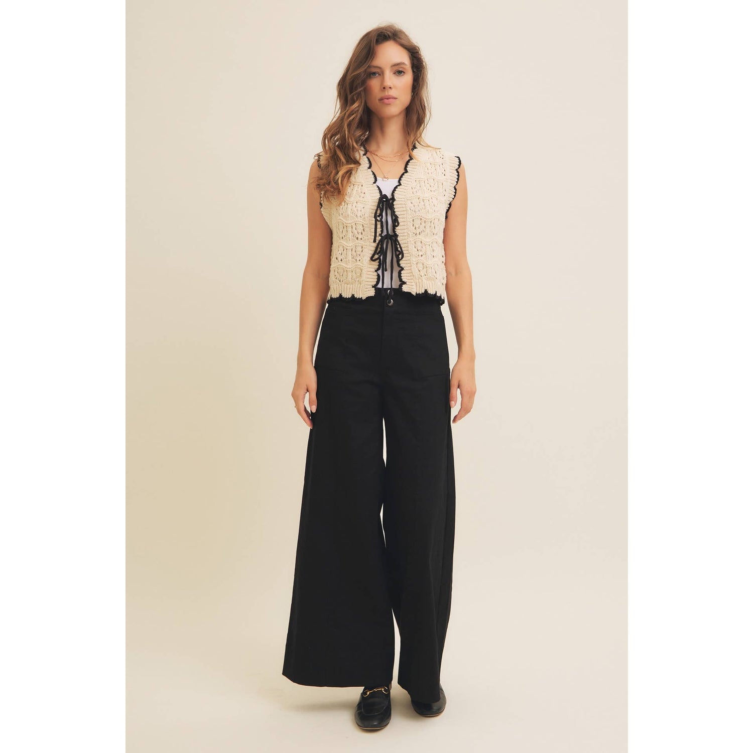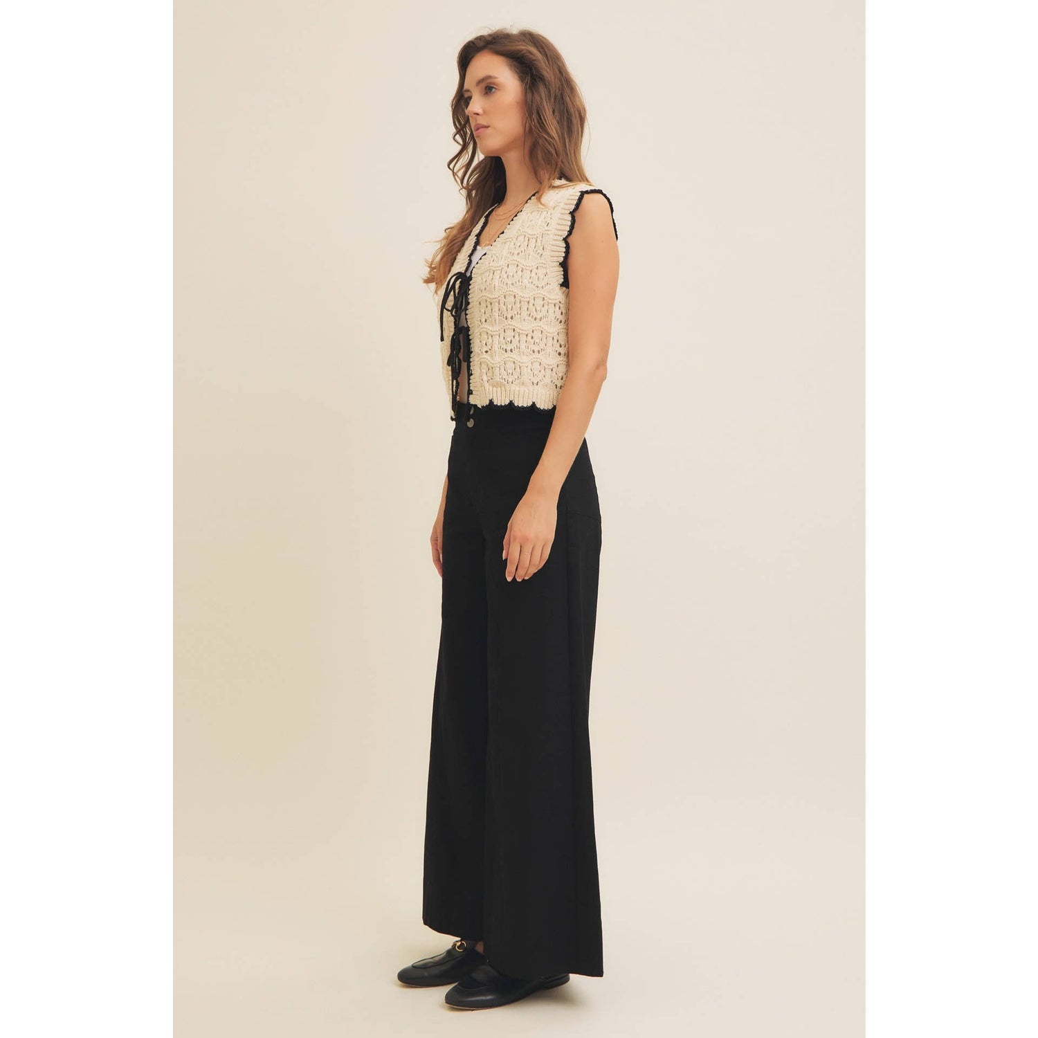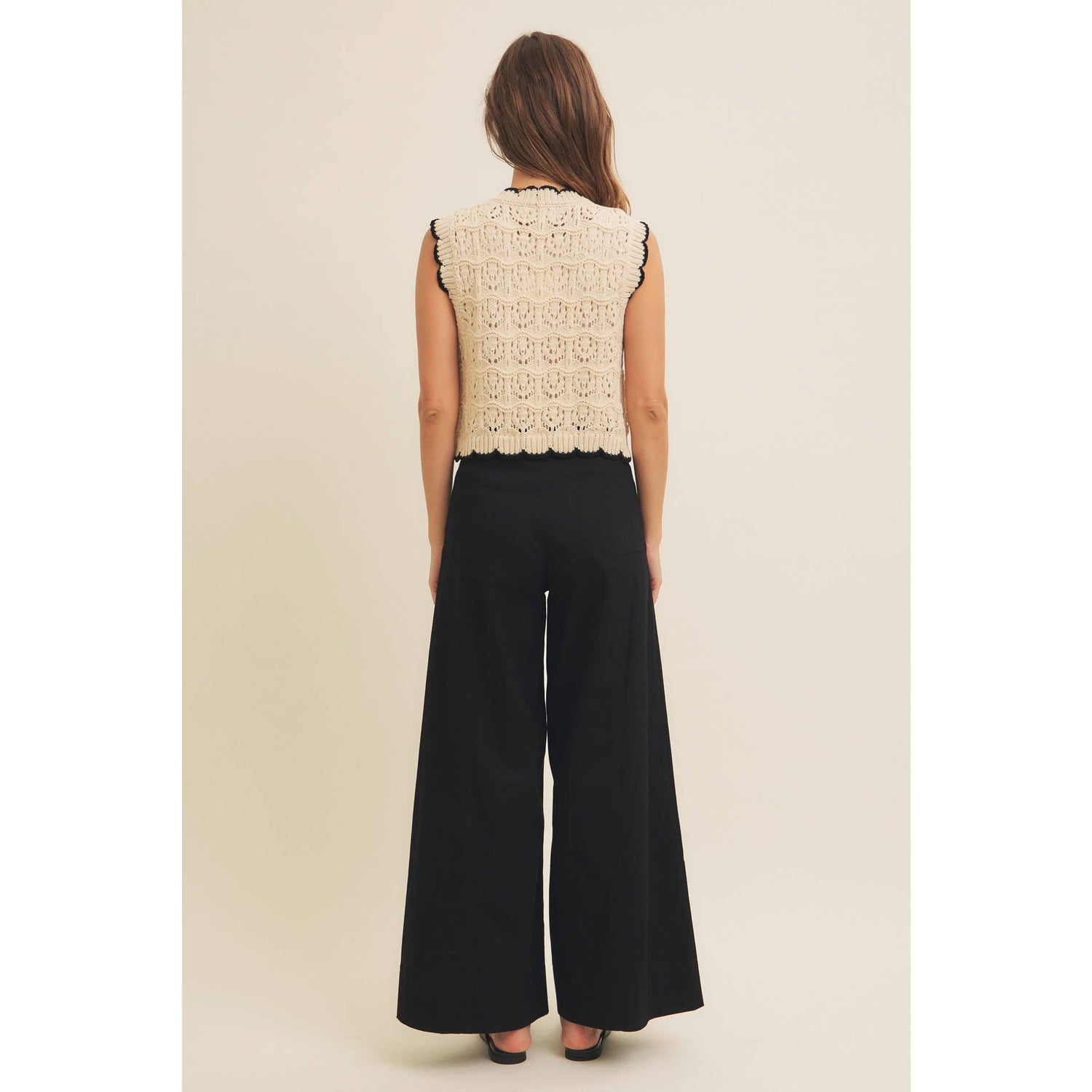 CROCHET SWEATER VEST WITH SCALLOP AND BOW DETAILS: NATURAL/BLACK / 1719SW