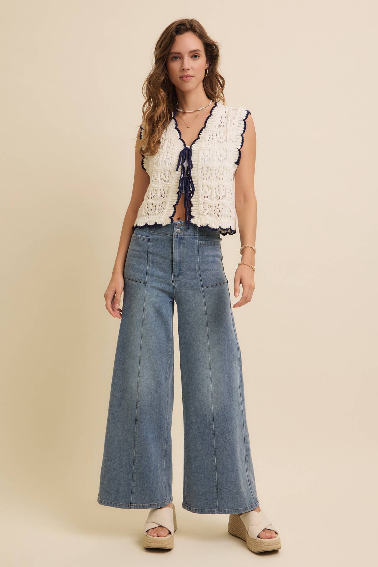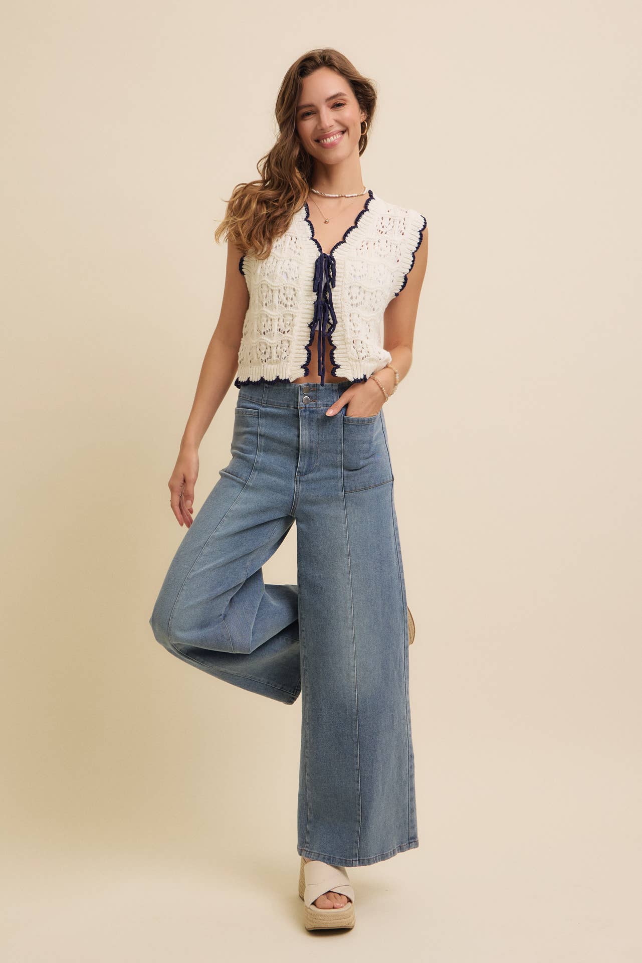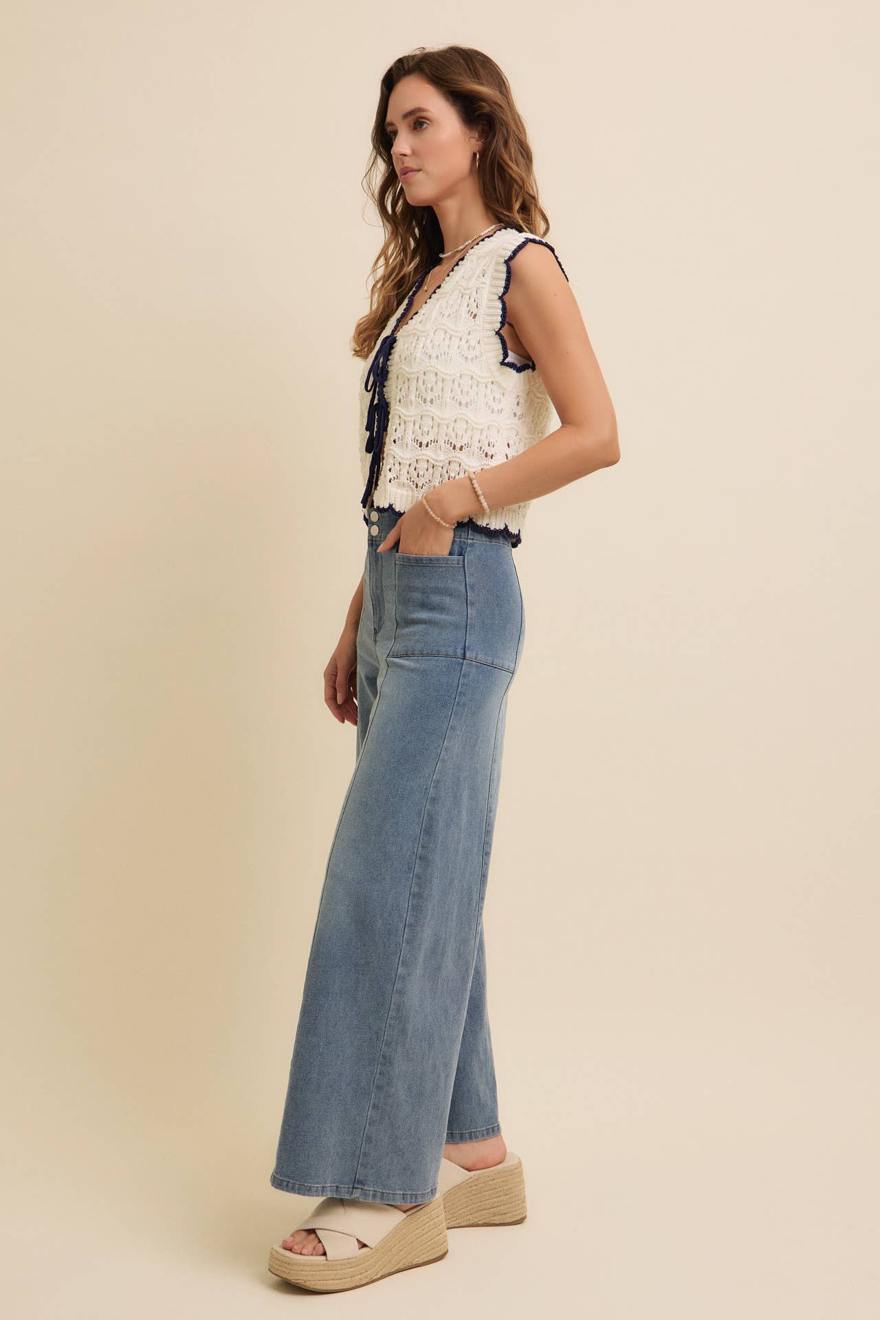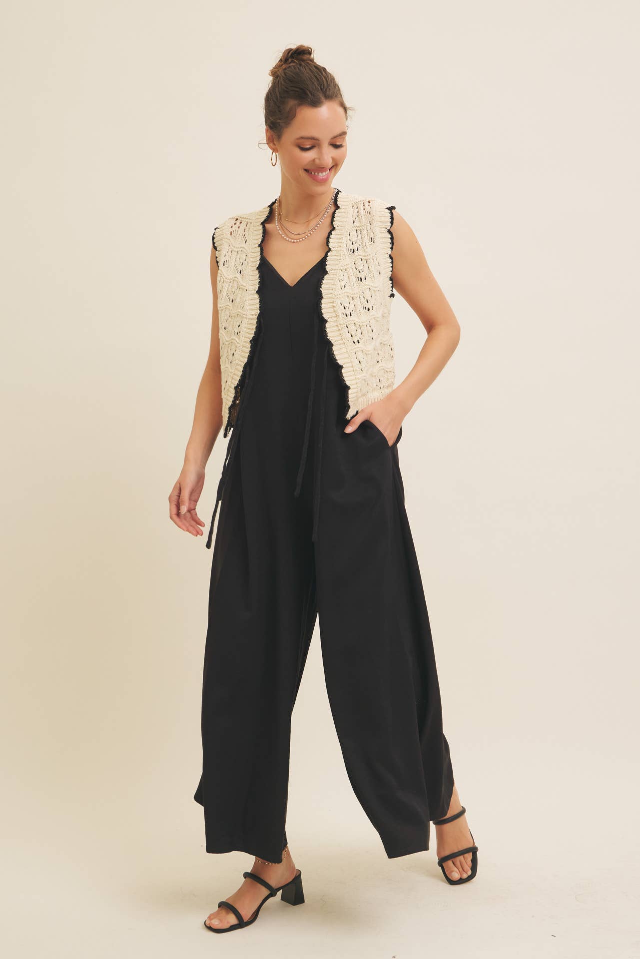 CROCHET SWEATER VEST WITH SCALLOP AND BOW DETAILS: NATURAL/BLACK / 1719SW