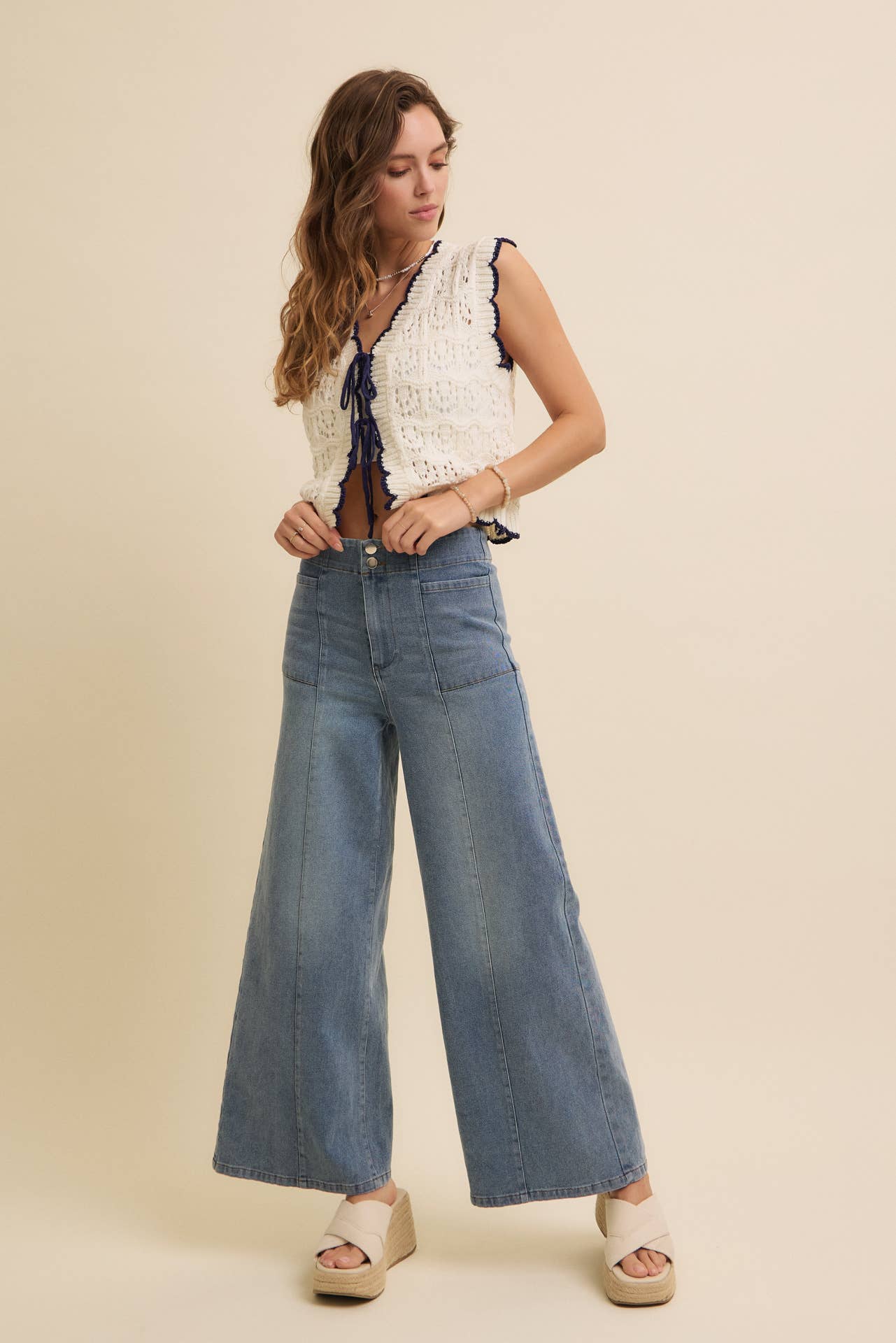 * Style No.: Features - Crochet knit sweater - Sleeveless - Sweater vets - Contrast scallop edge - Front bow tie details Contents - 60% COTTON 40% ACRYLIC Size + Fit Model is 5'10.5" and wearing a size Small Please refer to our size chart.