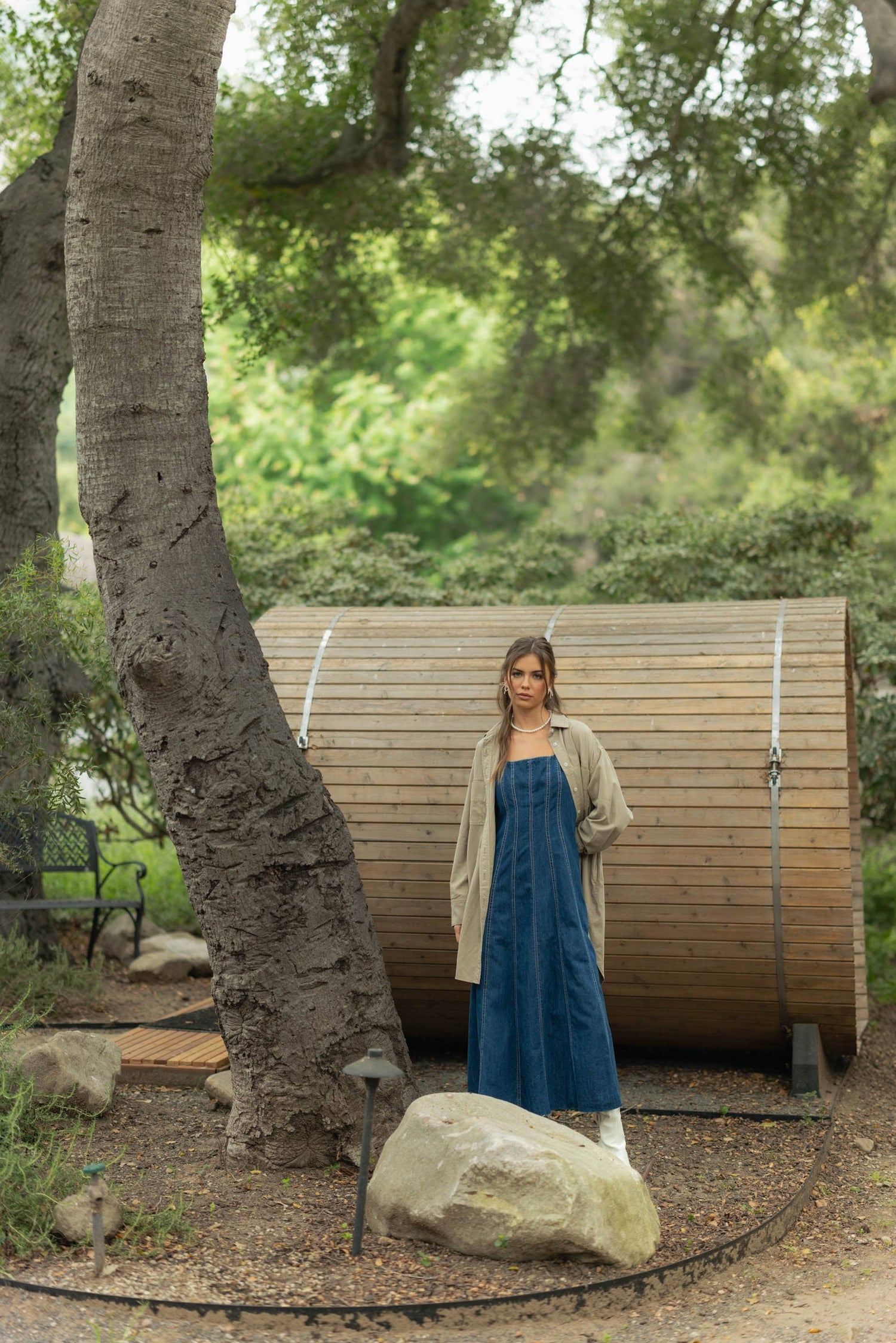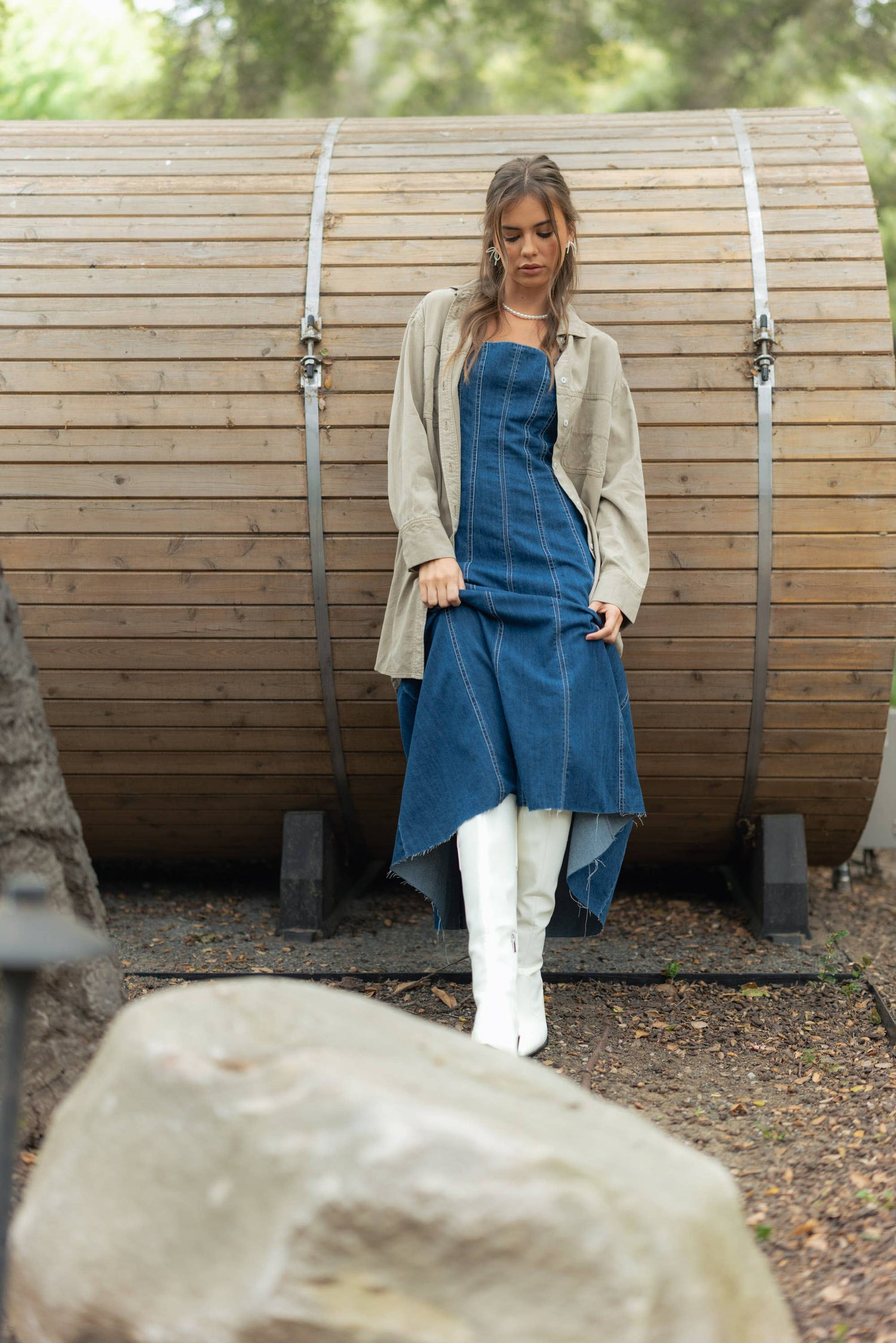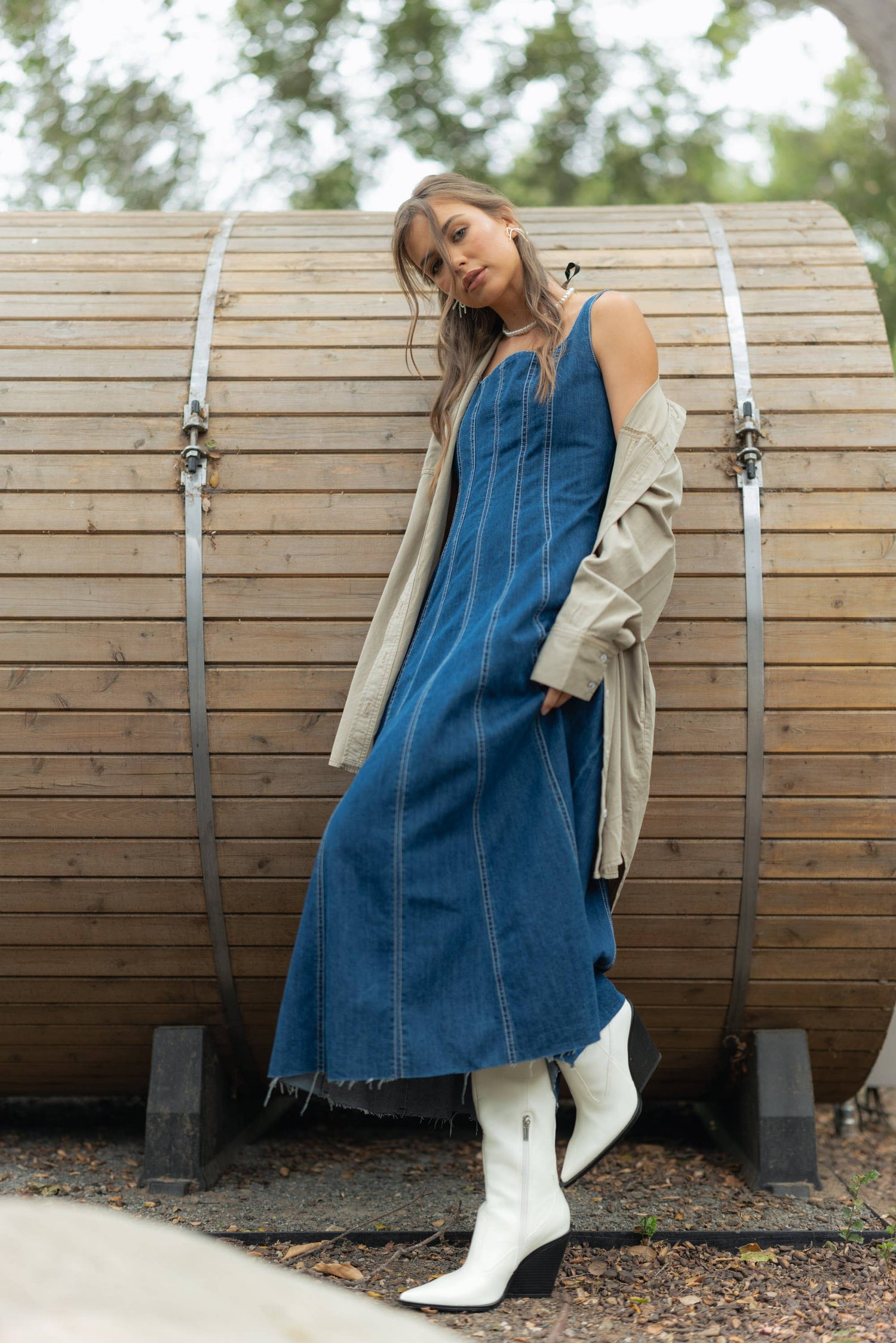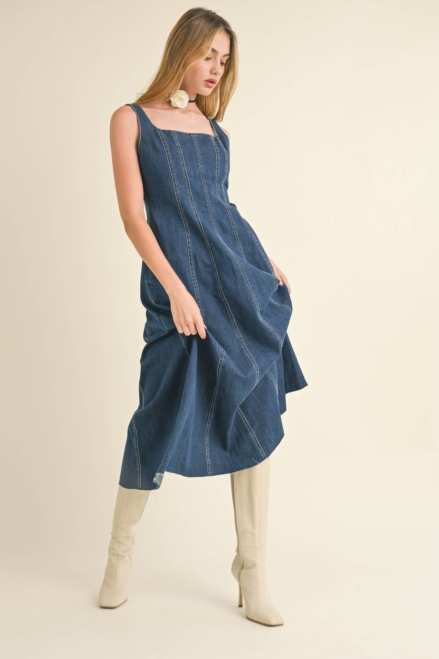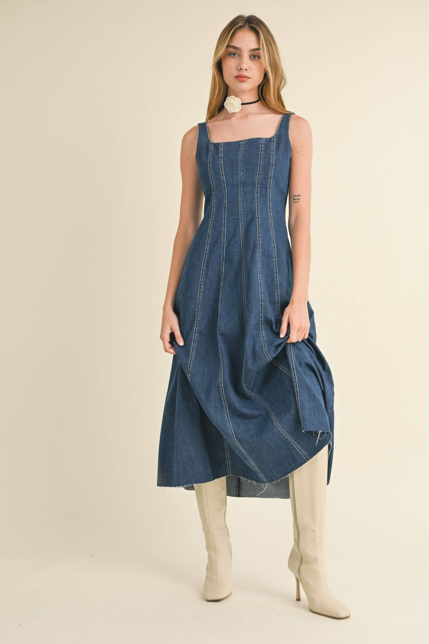 D3099 PANELED DENIM LONG DRESS: DENIM