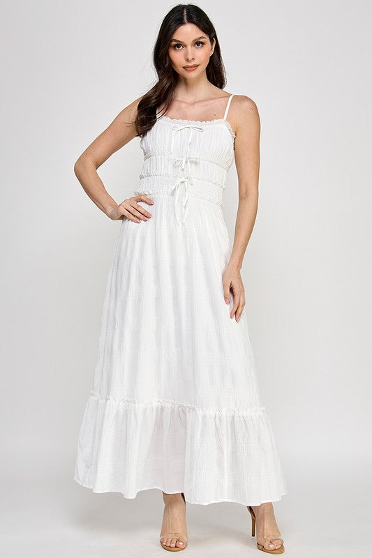 FUN BOLD STATEMENT DRESS WILL BE SURE TO TURN HEADS! MAXI DRESS FEATURES A BOLD PRINT IN COTTON FABRICATION, SCALLOPED SHOULDERS WITH EMBROIDERY EDGING, PARTIALLY SMOCKED BACK FOR EASY FIT, CONCEALED SIDE ZIPPER, LINING, AND SIDE POCKETS.