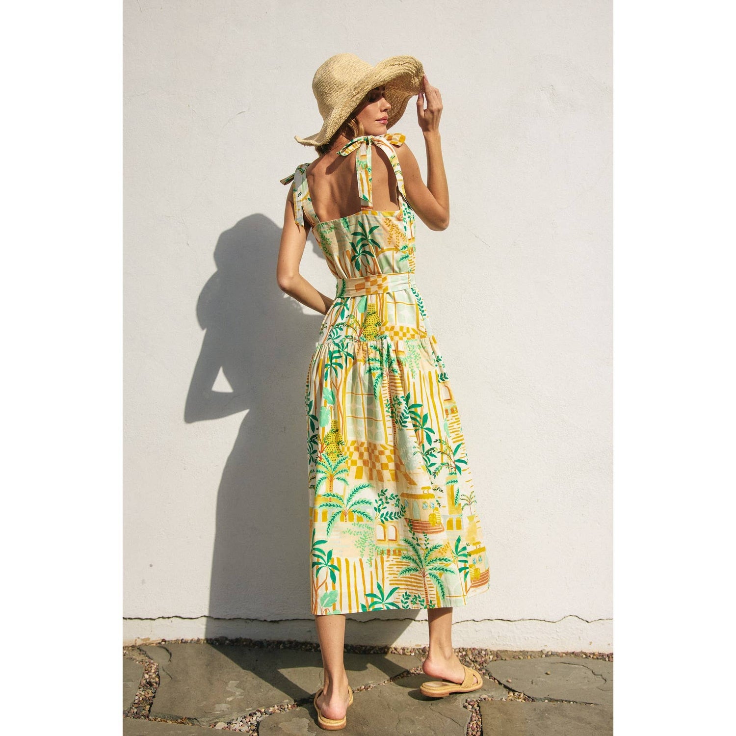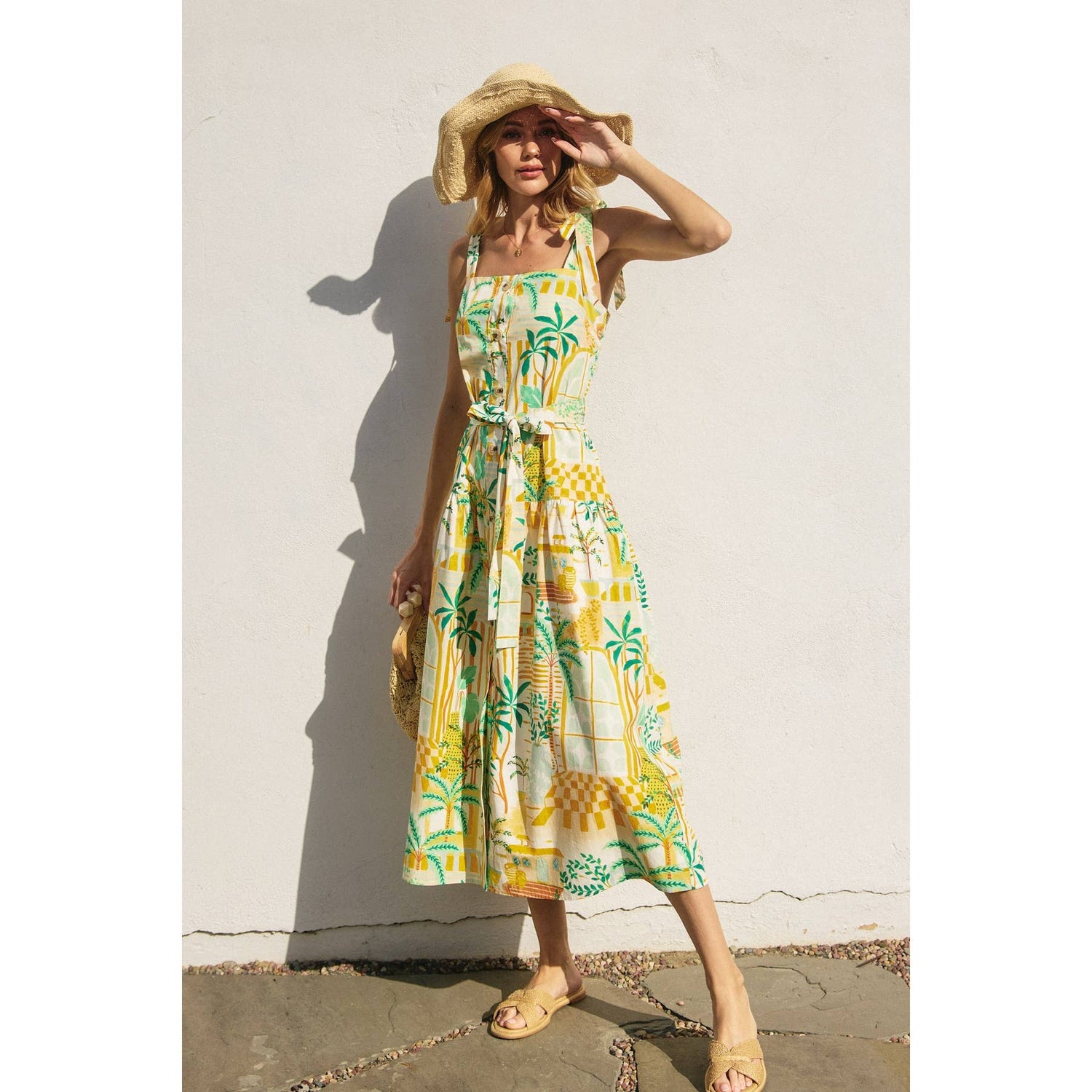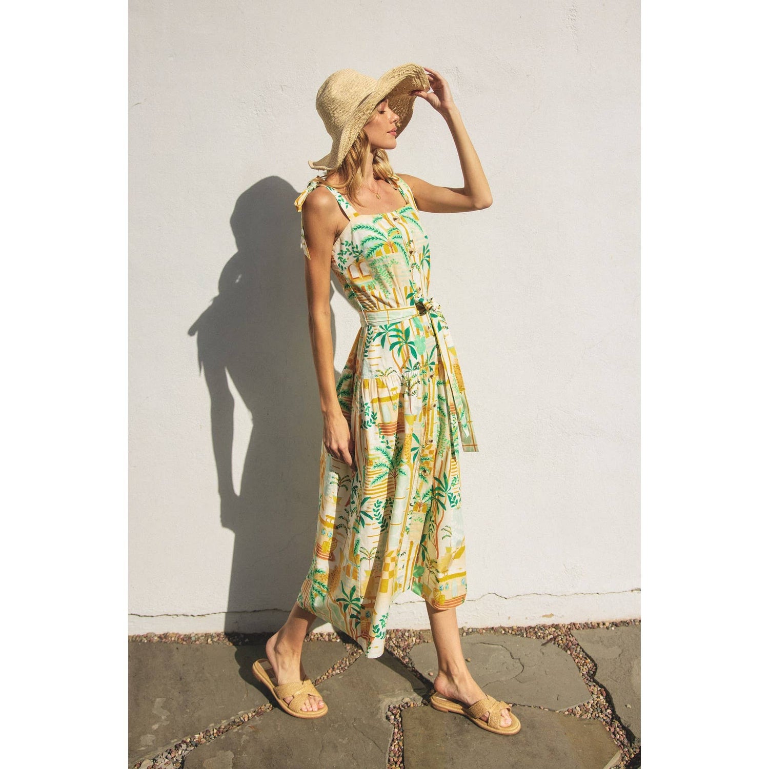 Tropical print midi dress with button placket and self tie wide shoulder straps. Model is 5'9" and wearing size Small.