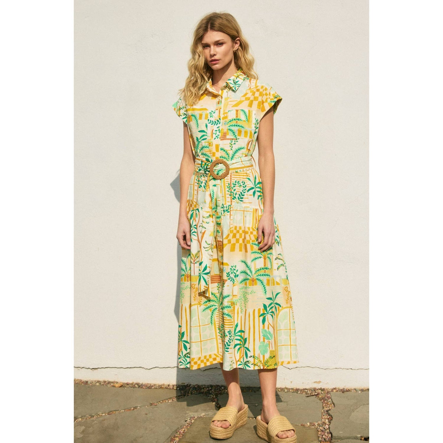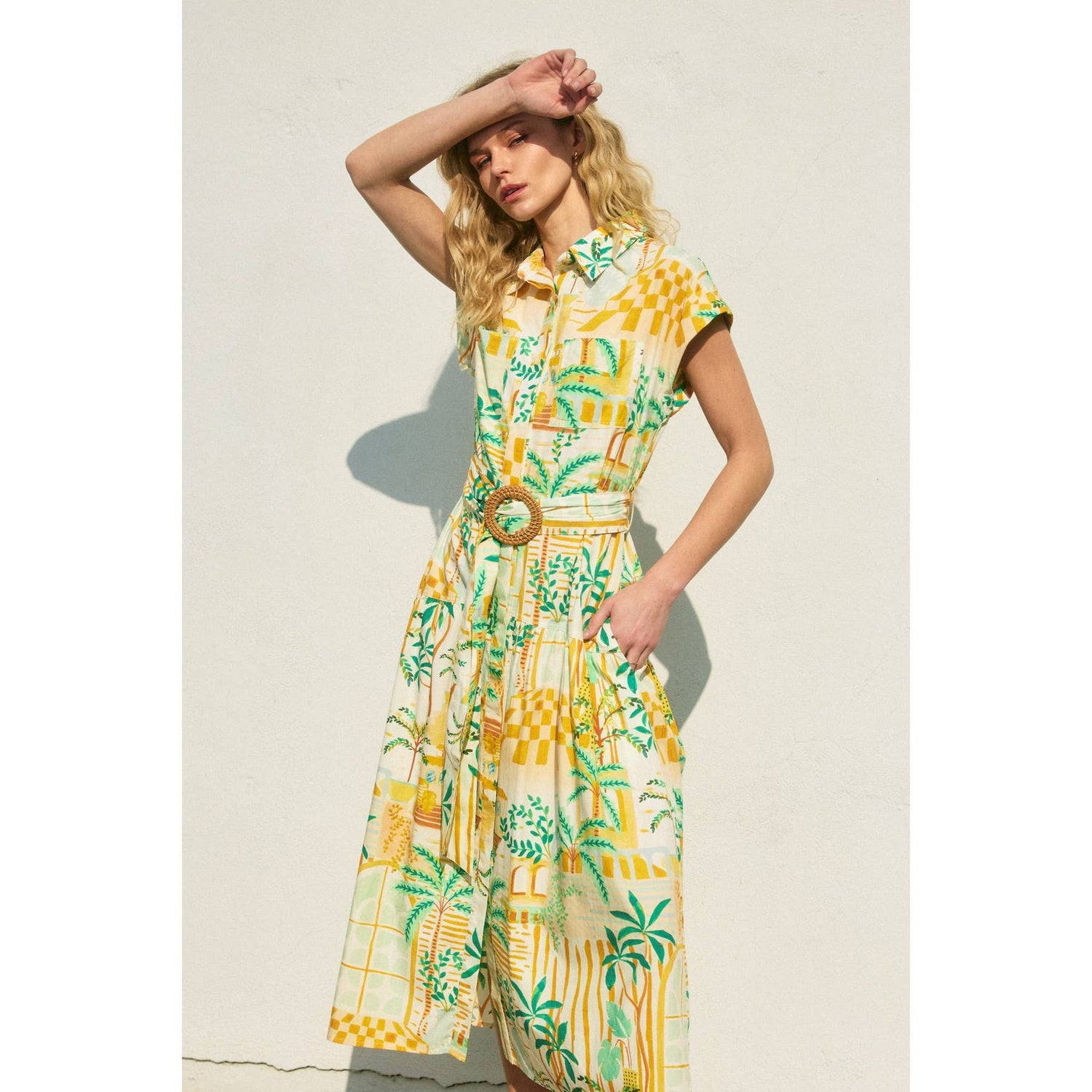 Tropical print shirt dress with a sash belt. Model is 5'7" and wearing size Small.