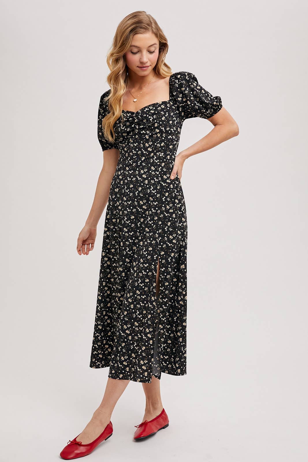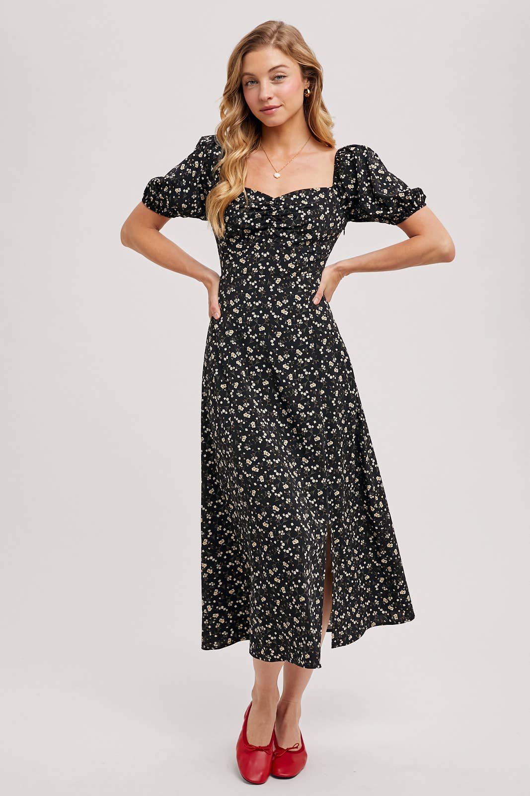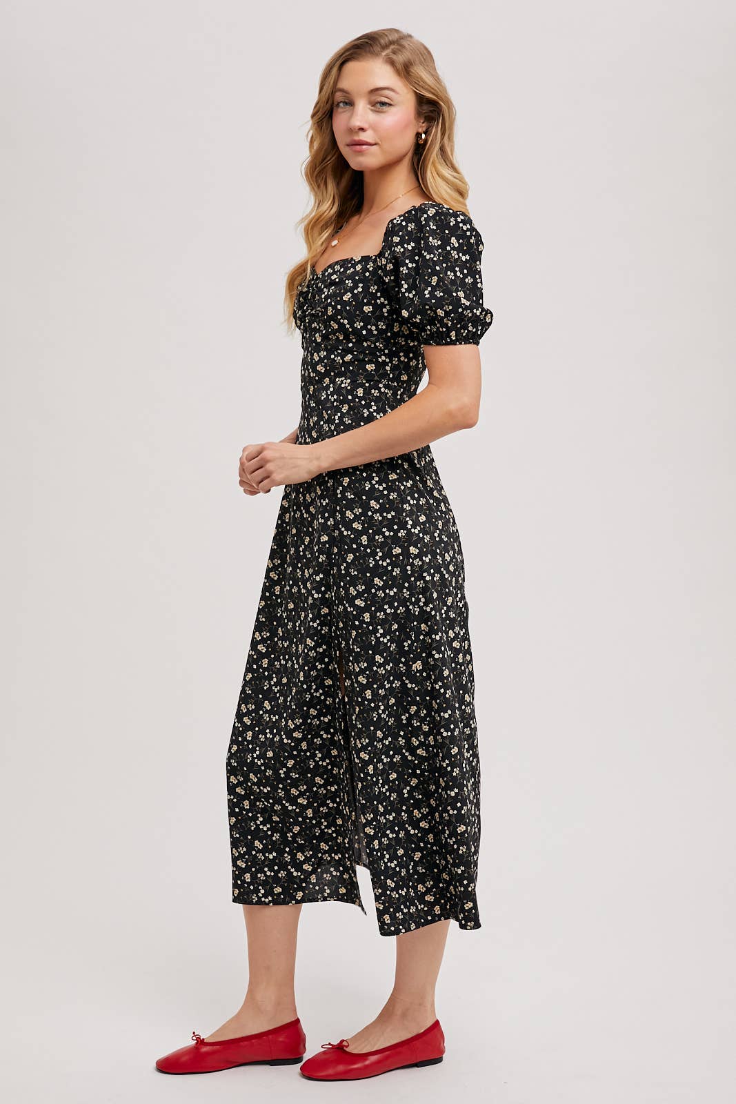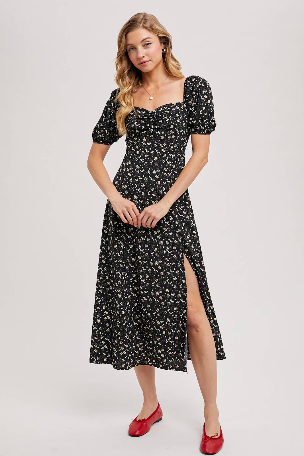 This is a black midi dress featuring a delicate, all-over ditsy floral print in shades of cream or off-white, possibly with subtle hints of pale yellow or beige. The dress has a flattering sweetheart neckline, enhanced with gentle ruching or gathering at the center of the bust. It includes short puff sleeves, adding a touch of romantic volume to the shoulders. The bodice appears fitted through the waist, transitioning into an A-line skirt that falls to the mid-calf region. A prominent feature is the thigh-high slit on the wearer's left side, introducing a modern element and allowing for movement. The overall aesthetic combines feminine charm with a contemporary edge, suitable for various warm-weather occasions.