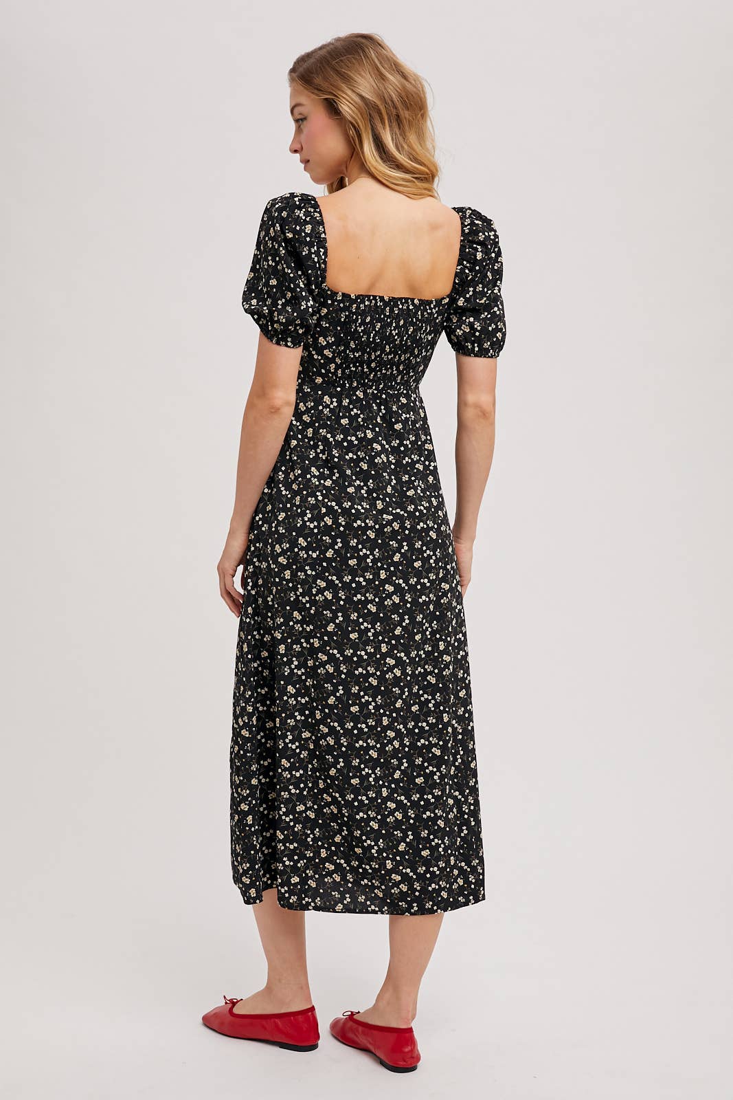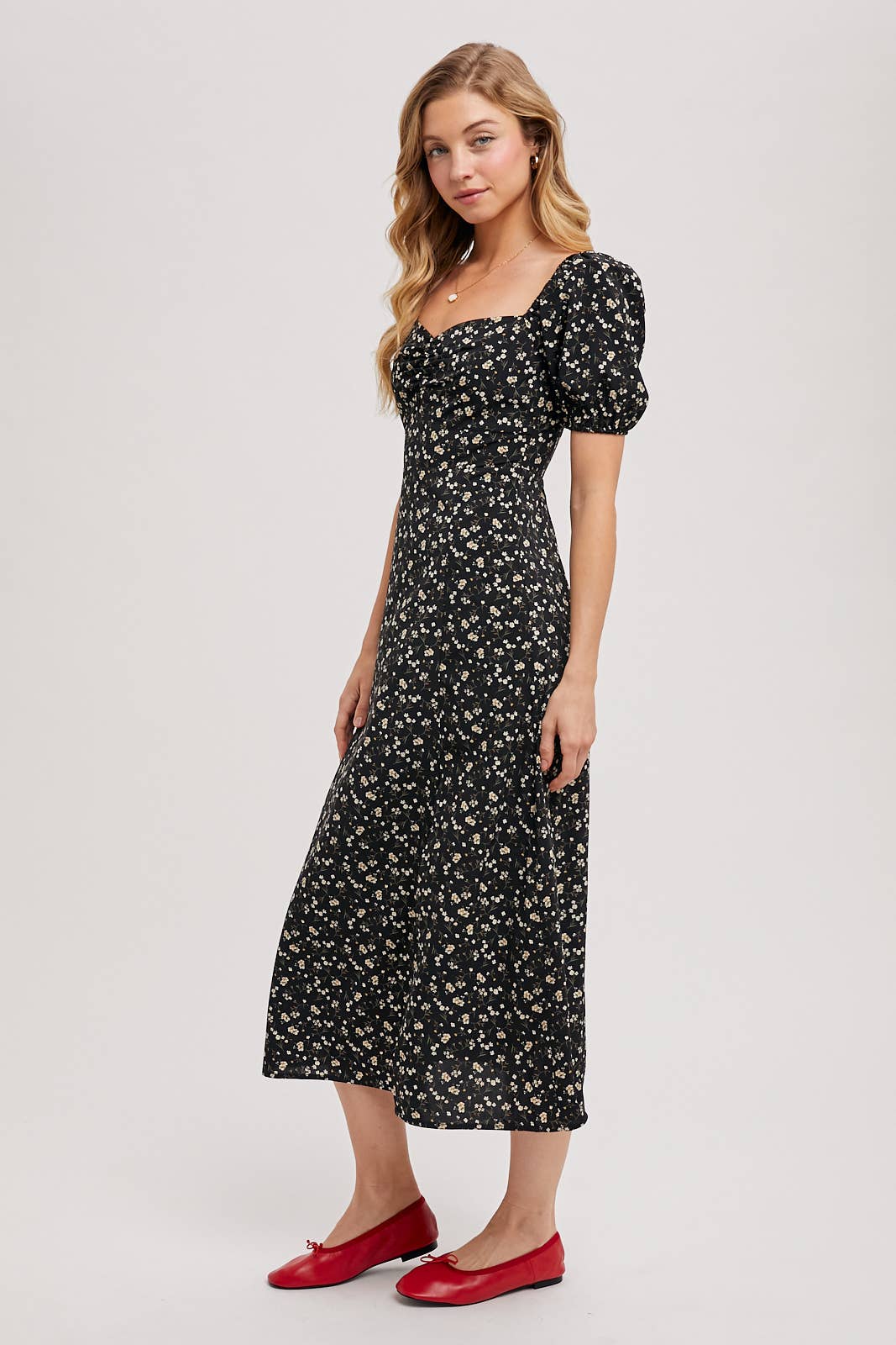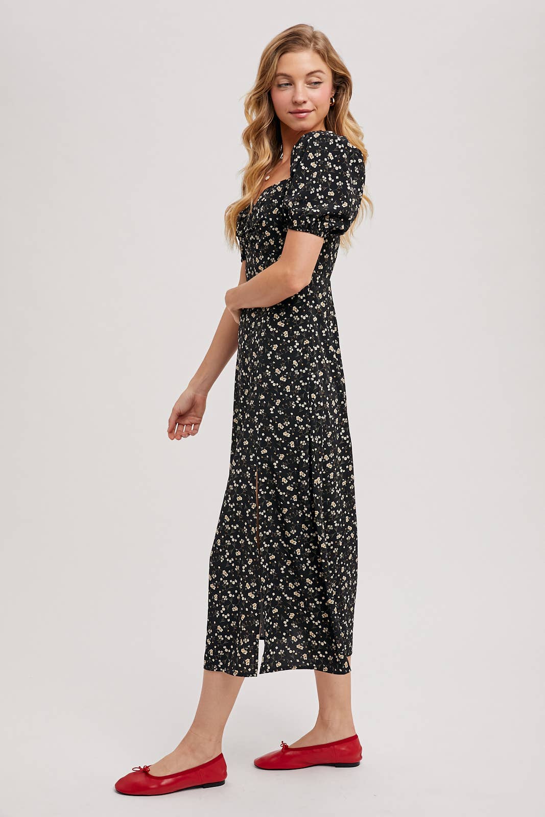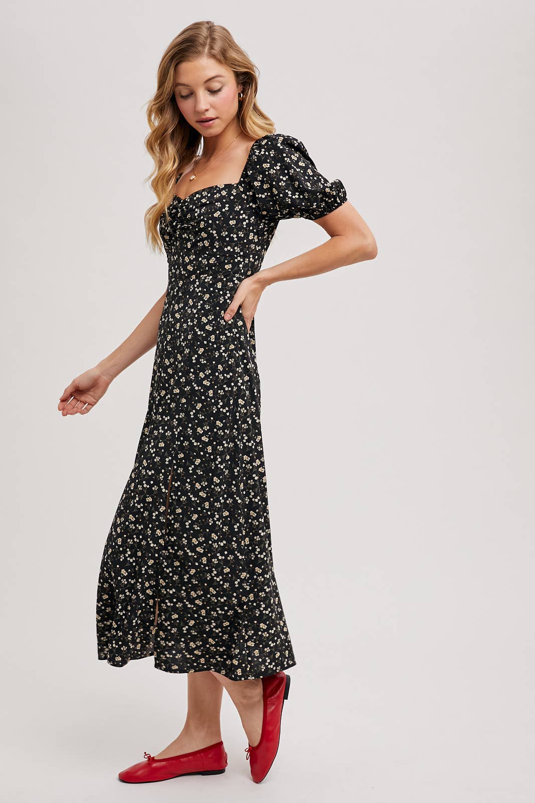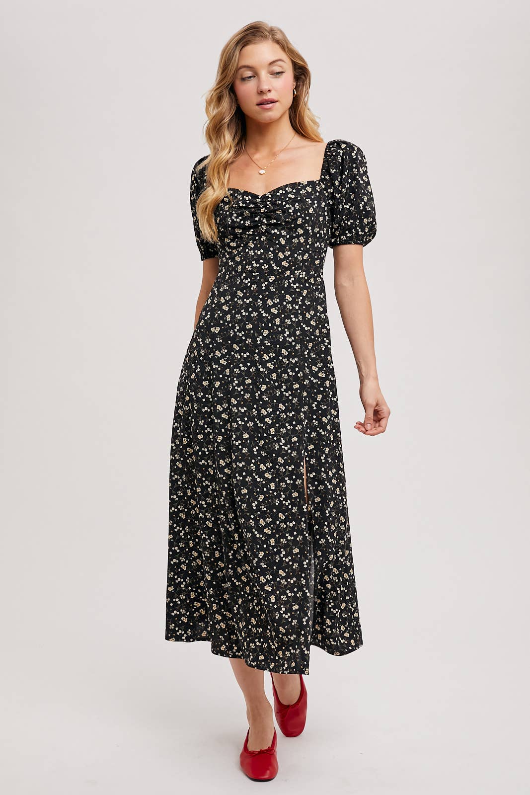 This is a black midi dress featuring a delicate, all-over ditsy floral print in shades of cream or off-white, possibly with subtle hints of pale yellow or beige. The dress has a flattering sweetheart neckline, enhanced with gentle ruching or gathering at the center of the bust. It includes short puff sleeves, adding a touch of romantic volume to the shoulders. The bodice appears fitted through the waist, transitioning into an A-line skirt that falls to the mid-calf region. A prominent feature is the thigh-high slit on the wearer's left side, introducing a modern element and allowing for movement. The overall aesthetic combines feminine charm with a contemporary edge, suitable for various warm-weather occasions.