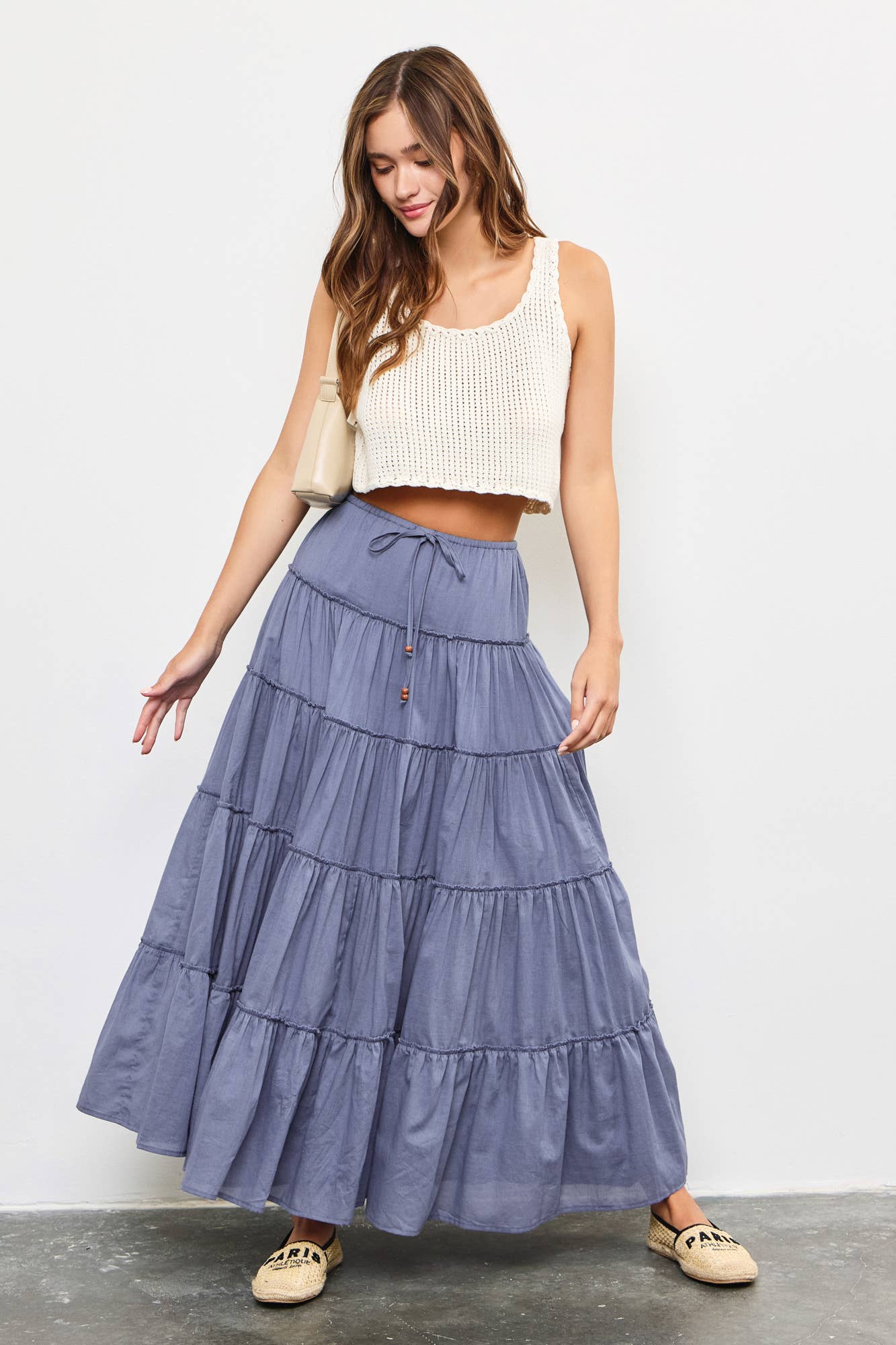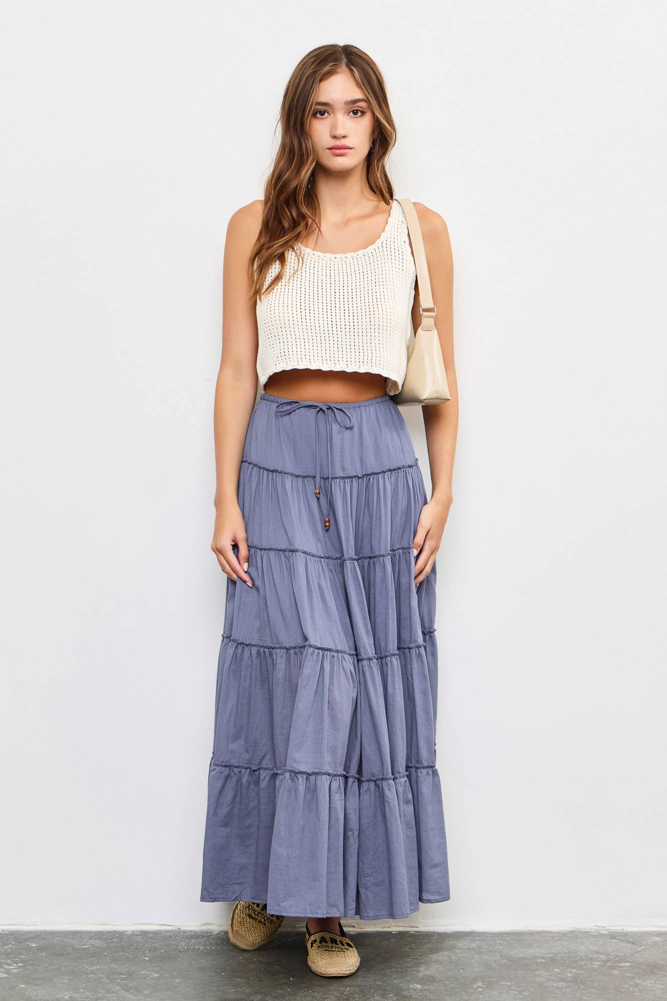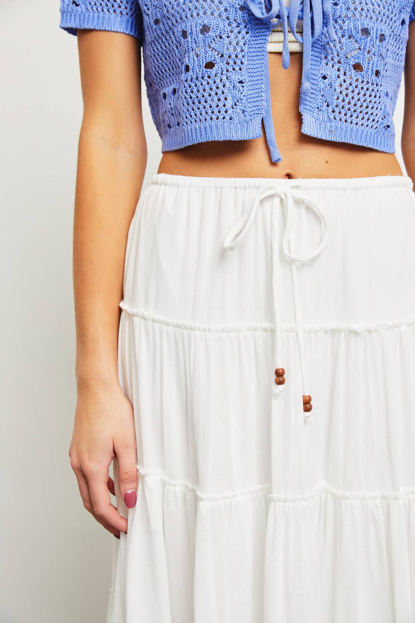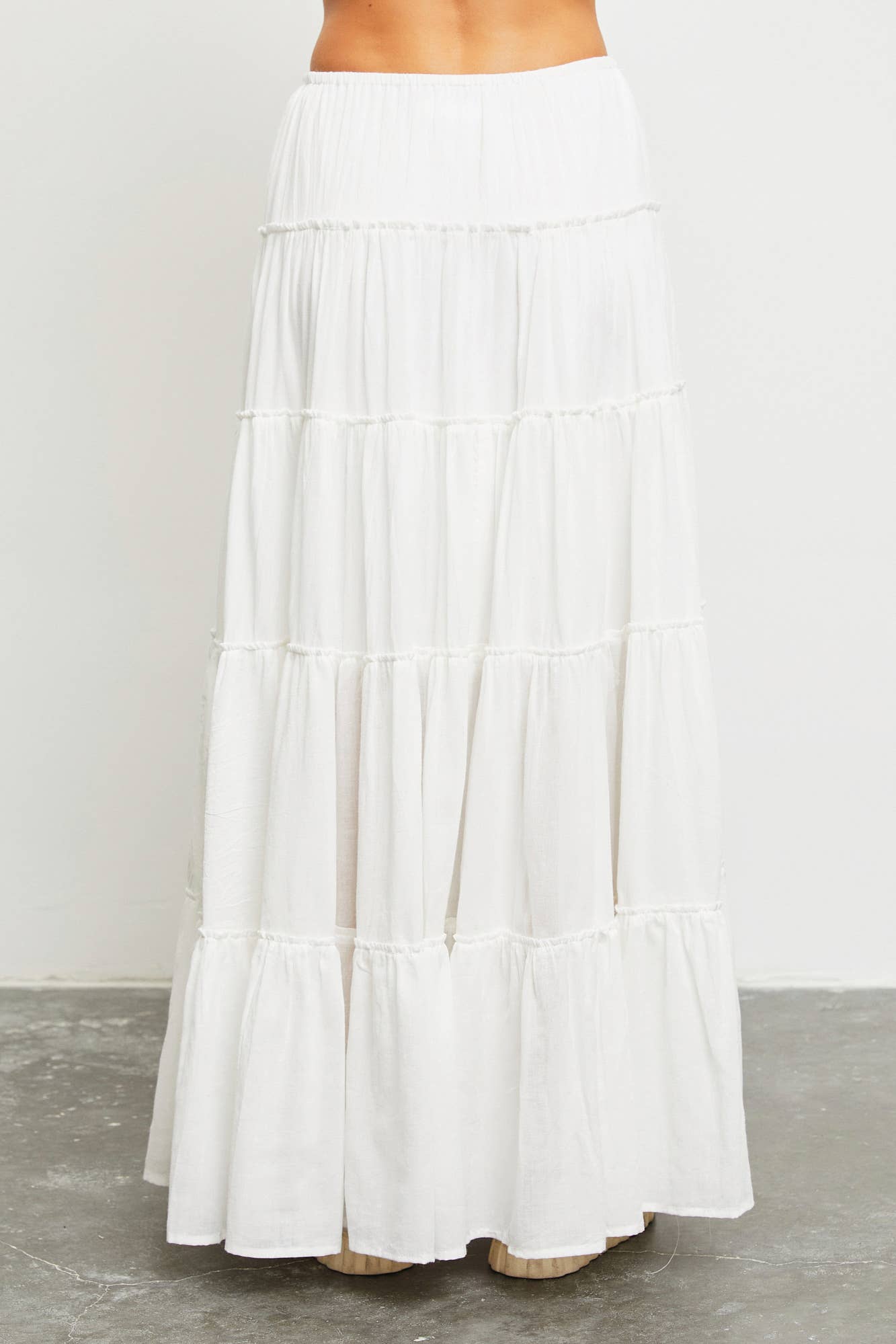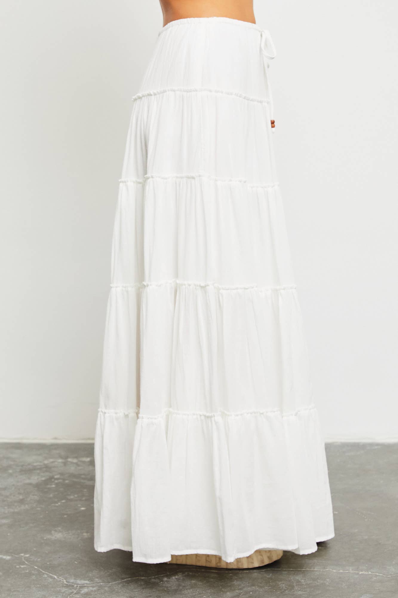 DRAWSTRING DETAIL TIERED MAXI SKIRT: OFF WHITE / S22856
