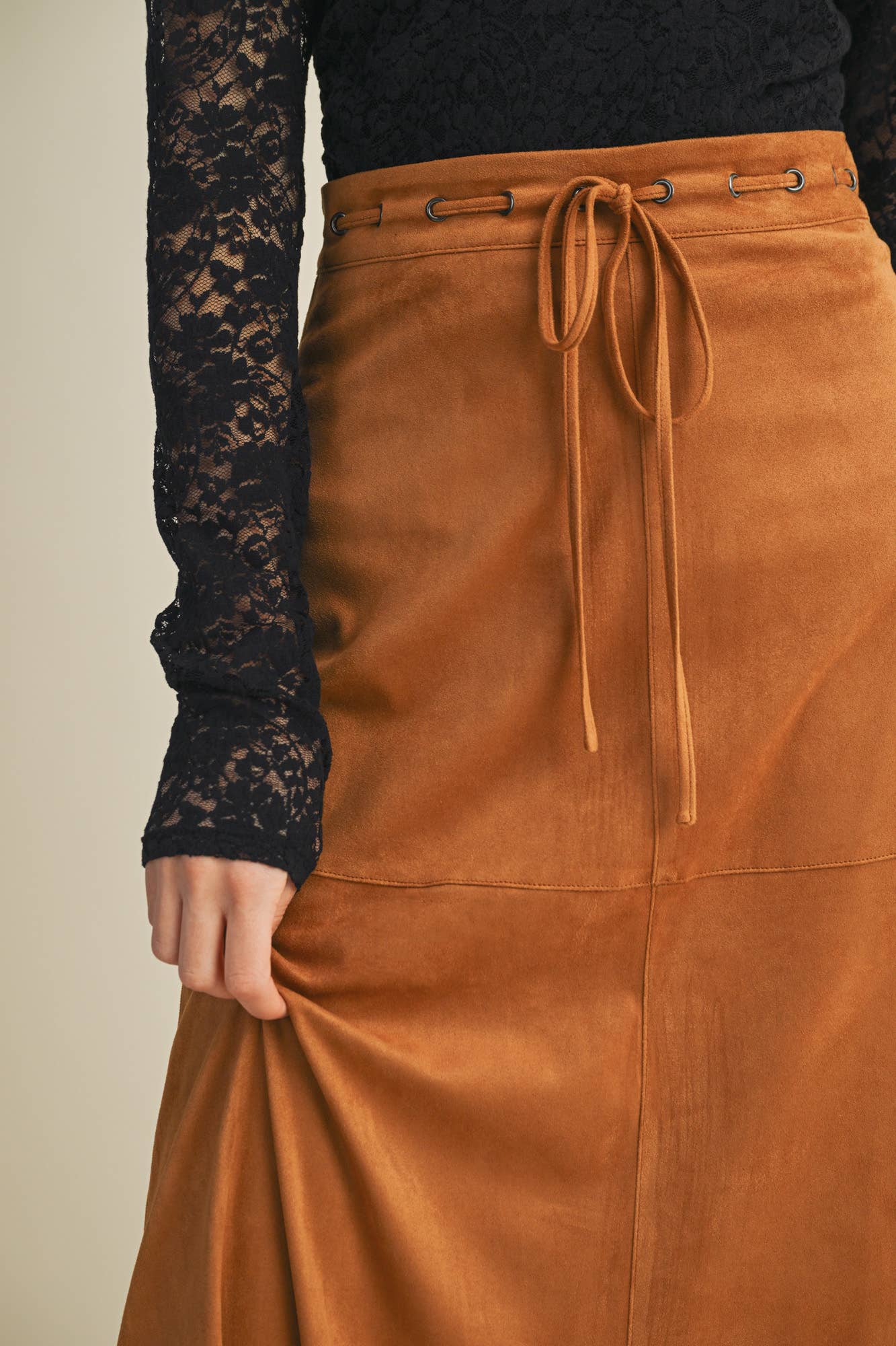 DRAWSTRING SUEDE A-LINE SKIRT: CAMEL / S25226