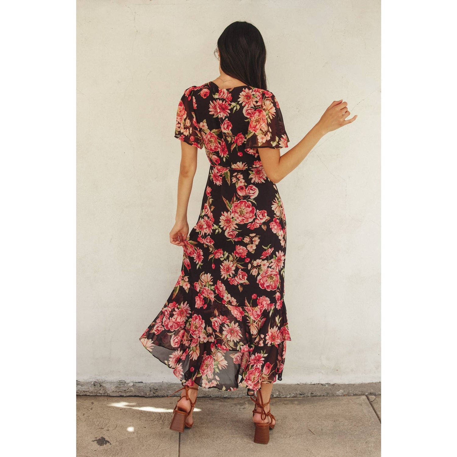 Floral printed maxi dress in a wrapping design. Model is 5'8" and wearing size Small. - Wrap design - Half sleeves - Double layered ruffle hem - Loop tie fastening on the waist - Lined Shell: 100% Polyester Lining: 100% Polyester Available By BLACK FLORAL : 10/11/2024 LILY FLORAL : 12/20/2024