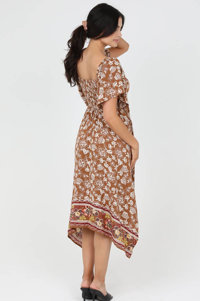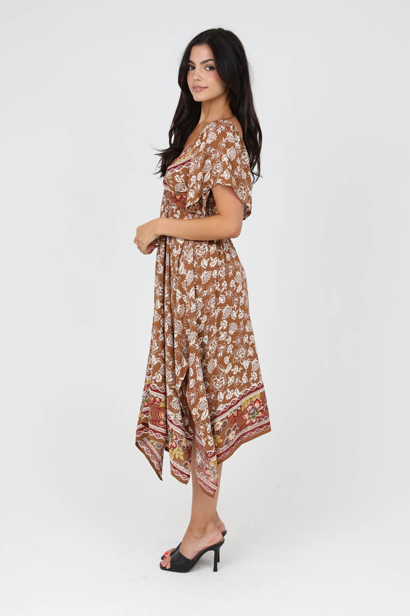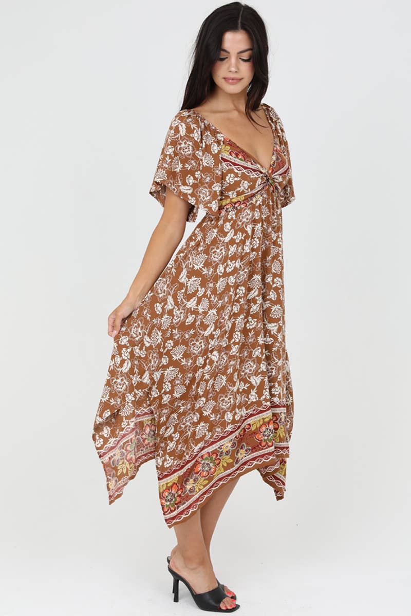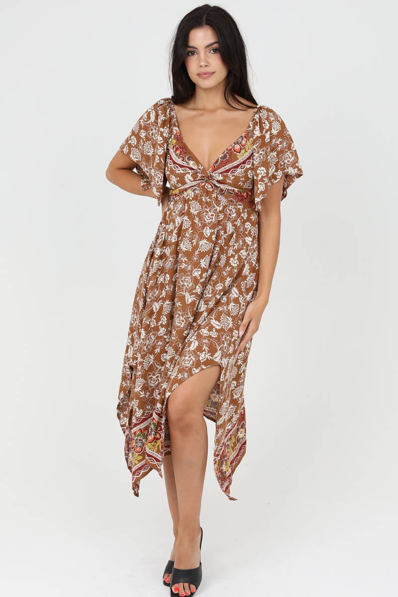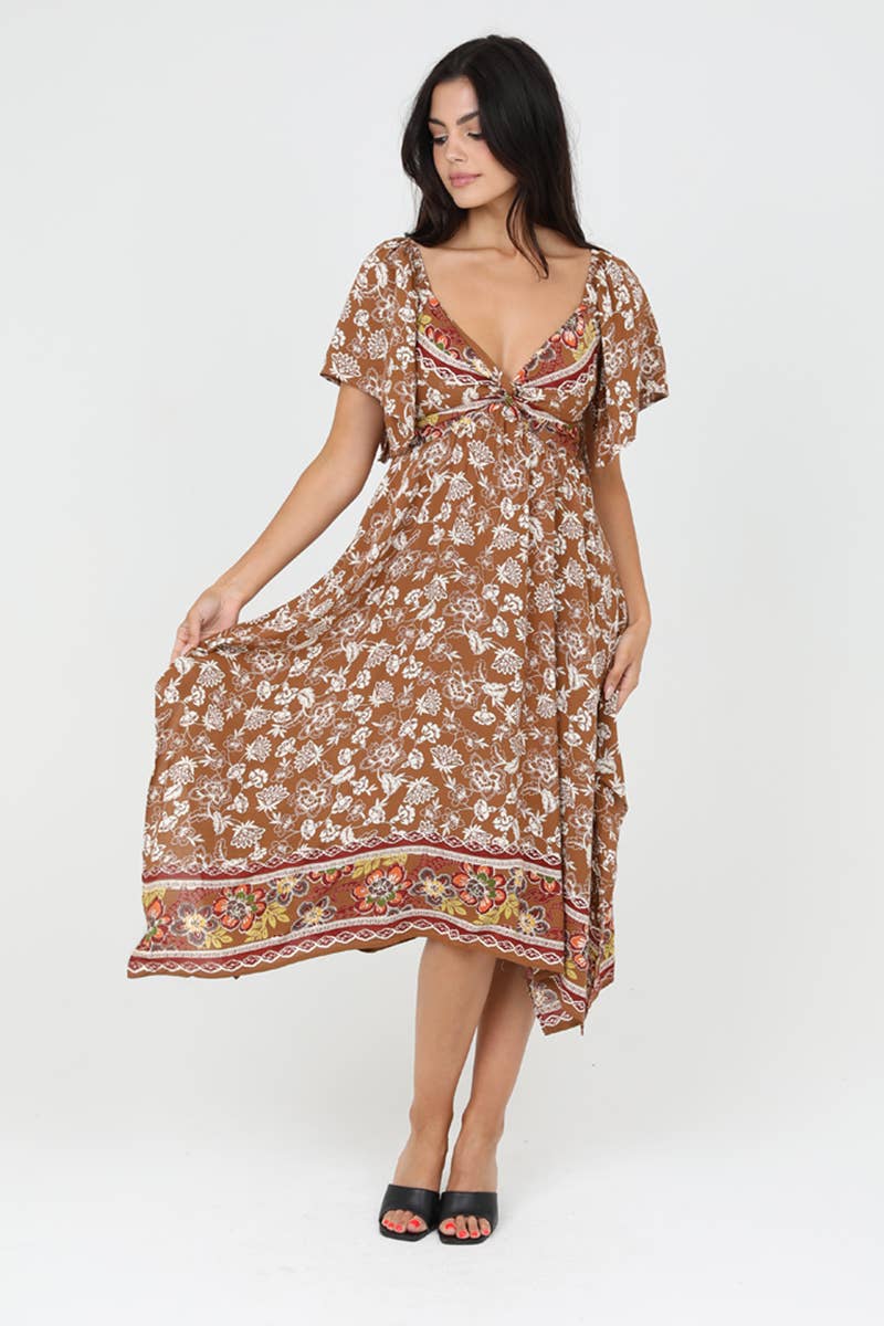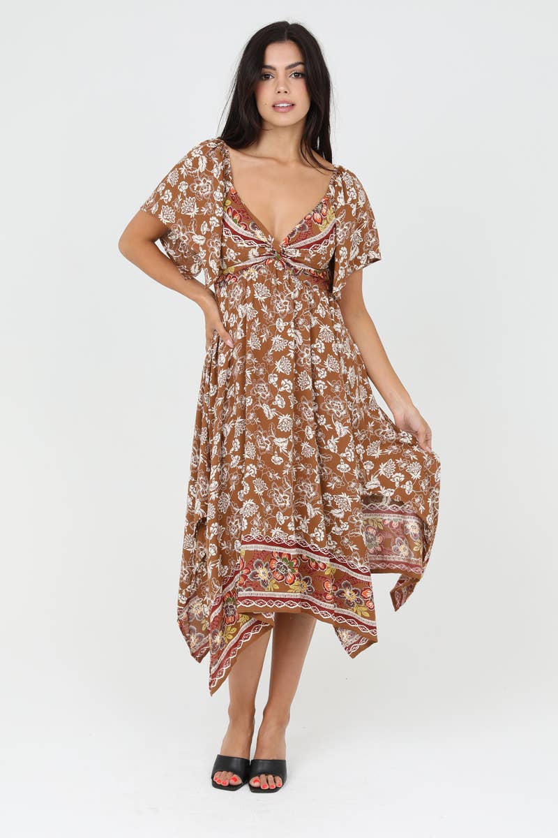 Experience the perfect blend of casual and elegant with ANGIE's Twist Front Hanky Hem Dress. This brown, floral A-line dress, designed for the everyday woman, is ideal for a day party or any casual occasion. The dress features a twist front, a v-neck, and short sleeves, making it a standout piece in any wardrobe. The midi length adds a touch of sophistication, while the junior fit ensures a flattering silhouette. With Angie, embrace the bohemian and vintage influences that are deeply rooted in a well-traveled, romantic spirit.