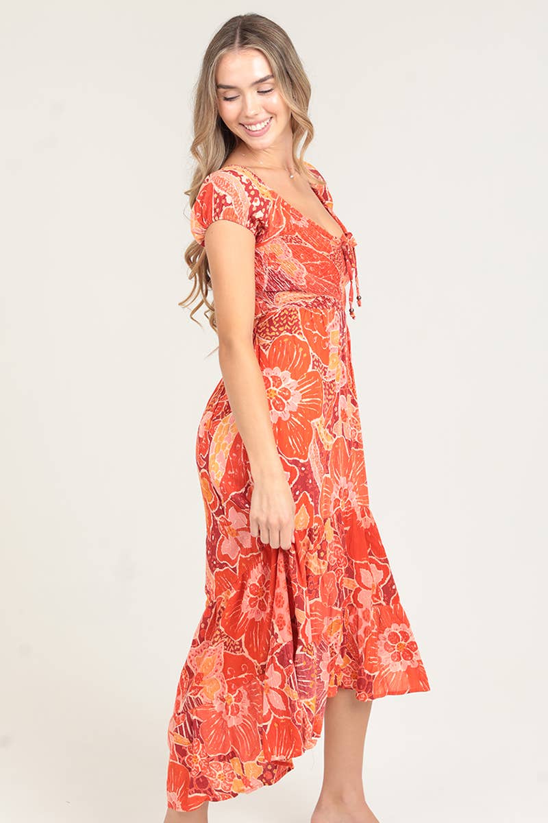 Our F4K79-A896 Smocked Bodice Criss Cross Back Maxi Dress W Slit, by Angie, is the perfect expression of our bohemian and vintage influences. This dress is not shy of embellishment, featuring a smocked bodice and a criss-cross back that gives it a romantic spirit. The maxi length, complemented by a daring slit, makes it bold yet wearable. Perfect for the every-girl who is well-traveled and appreciates artful clothing. Stand out in color and design with Angie.