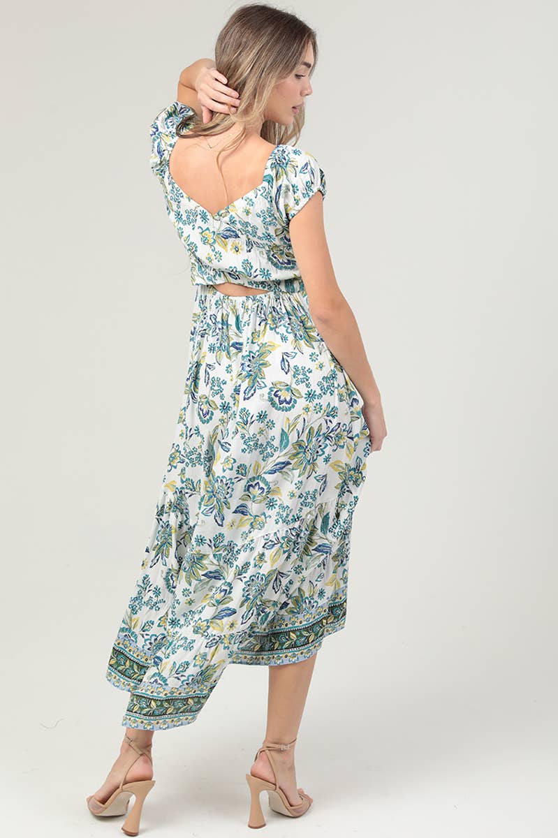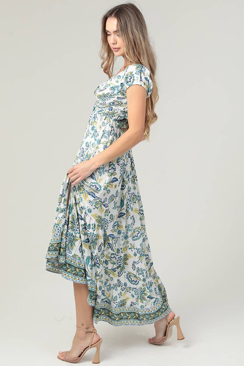Explore the stylish world of Angie with our F4K79-FR32 Smocked Bodice Criss Cross Back Maxi Dress. This dress showcases our brand's affinity for color and embellishment, featuring a smocked bodice that adds a touch of bohemian flair. The criss-cross back design adds a unique twist, while the maxi length with a slit ensures a distinctive silhouette. The dress is a perfect blend of vintage influences and global lifestyle, creating a bold and poetic look. It's more than just a dress; it's an expression of a well-traveled, romantic spirit.