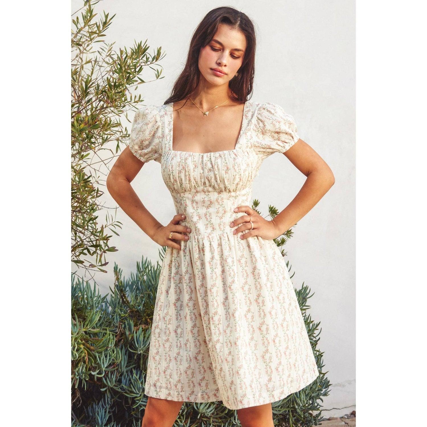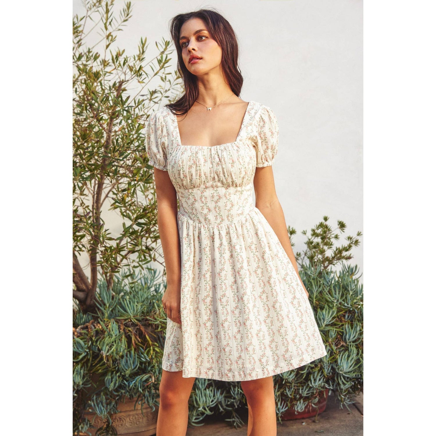 Floral print mini dress with a bustier detail. Model is 5'6" and wearing size Small.