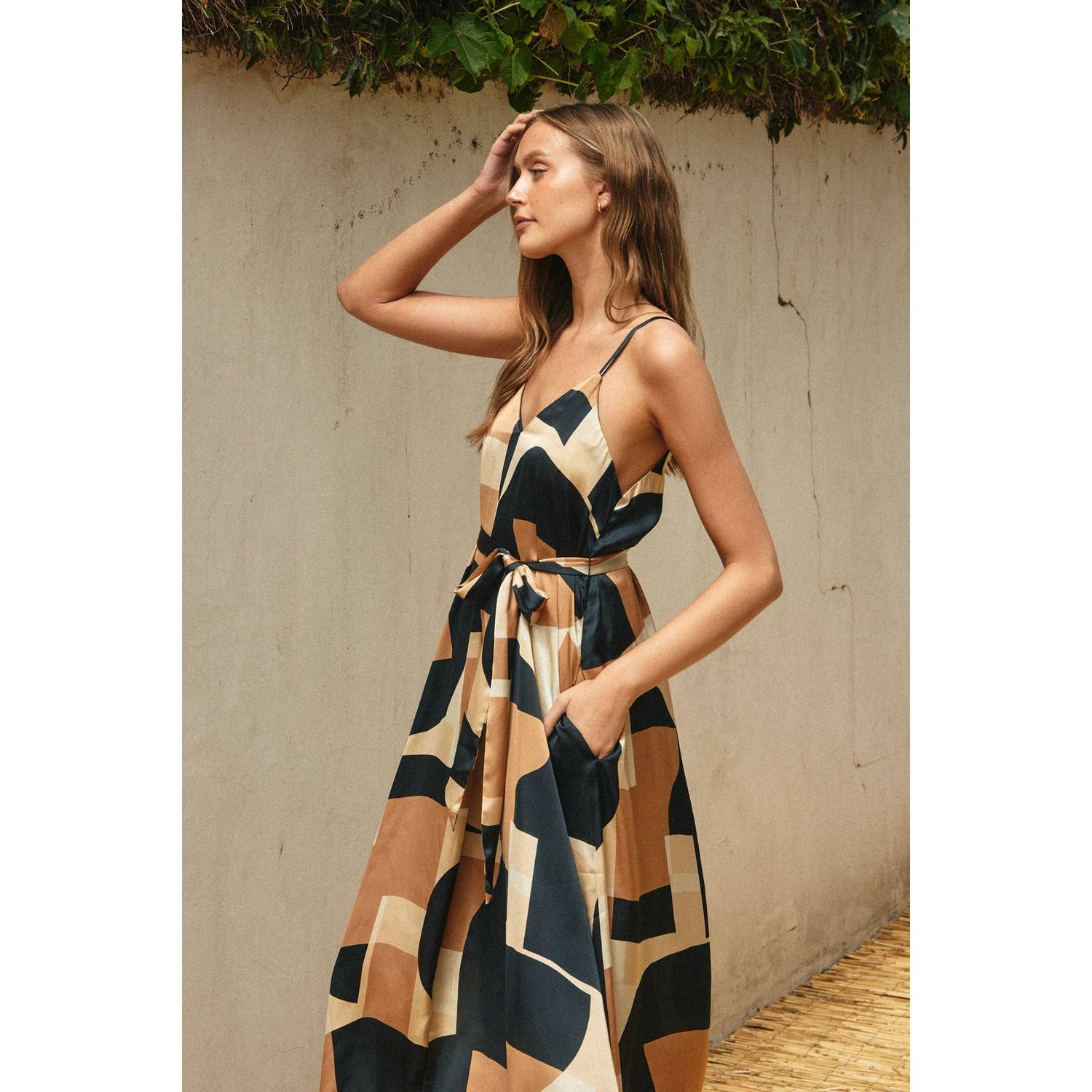 Geometric print maxi dress with extreme flared hem. Model is 5'10" and wearing size Small.