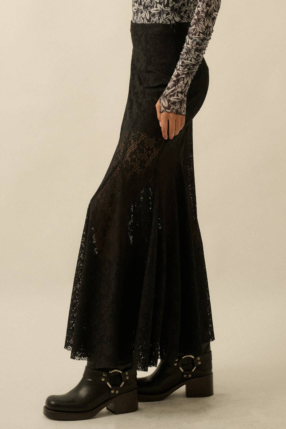 A floral crochet lace maxi skirt with the following features: