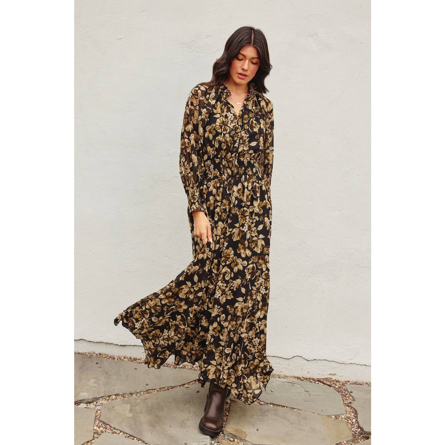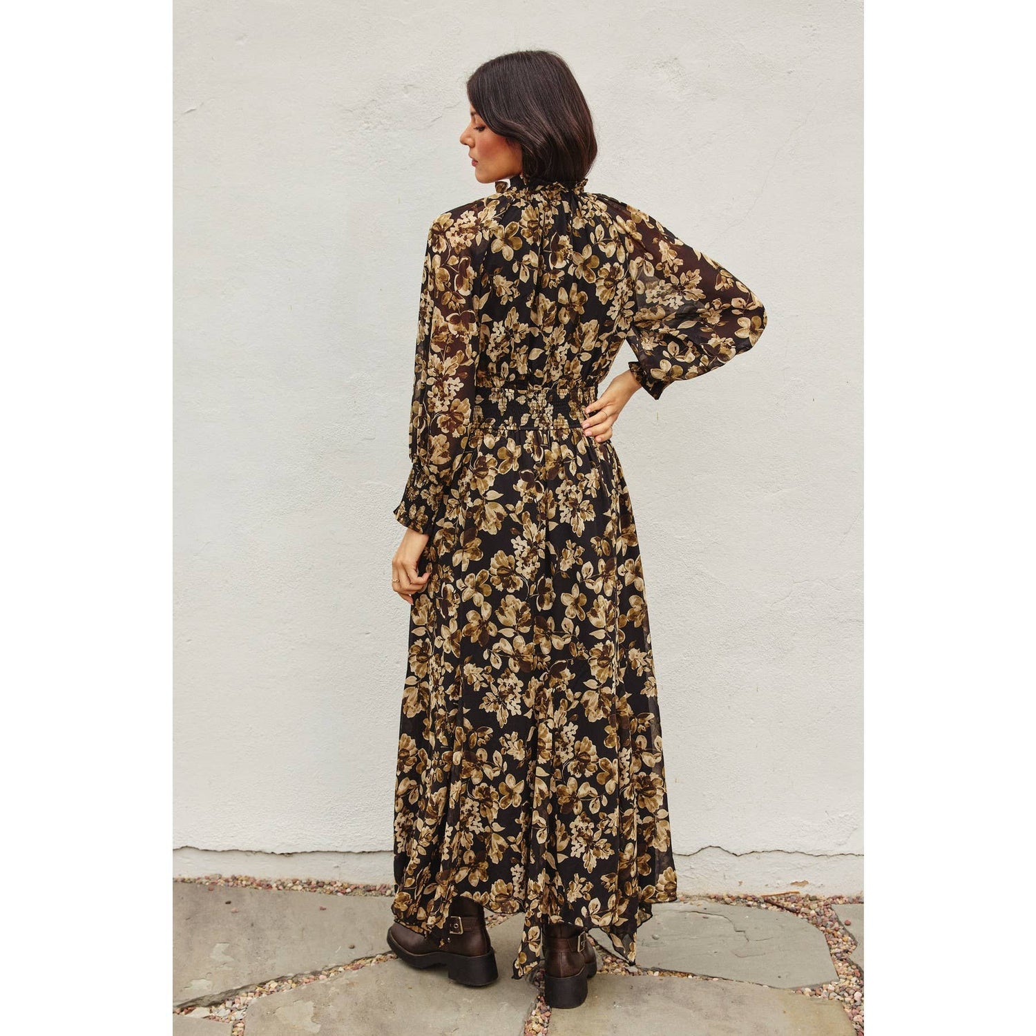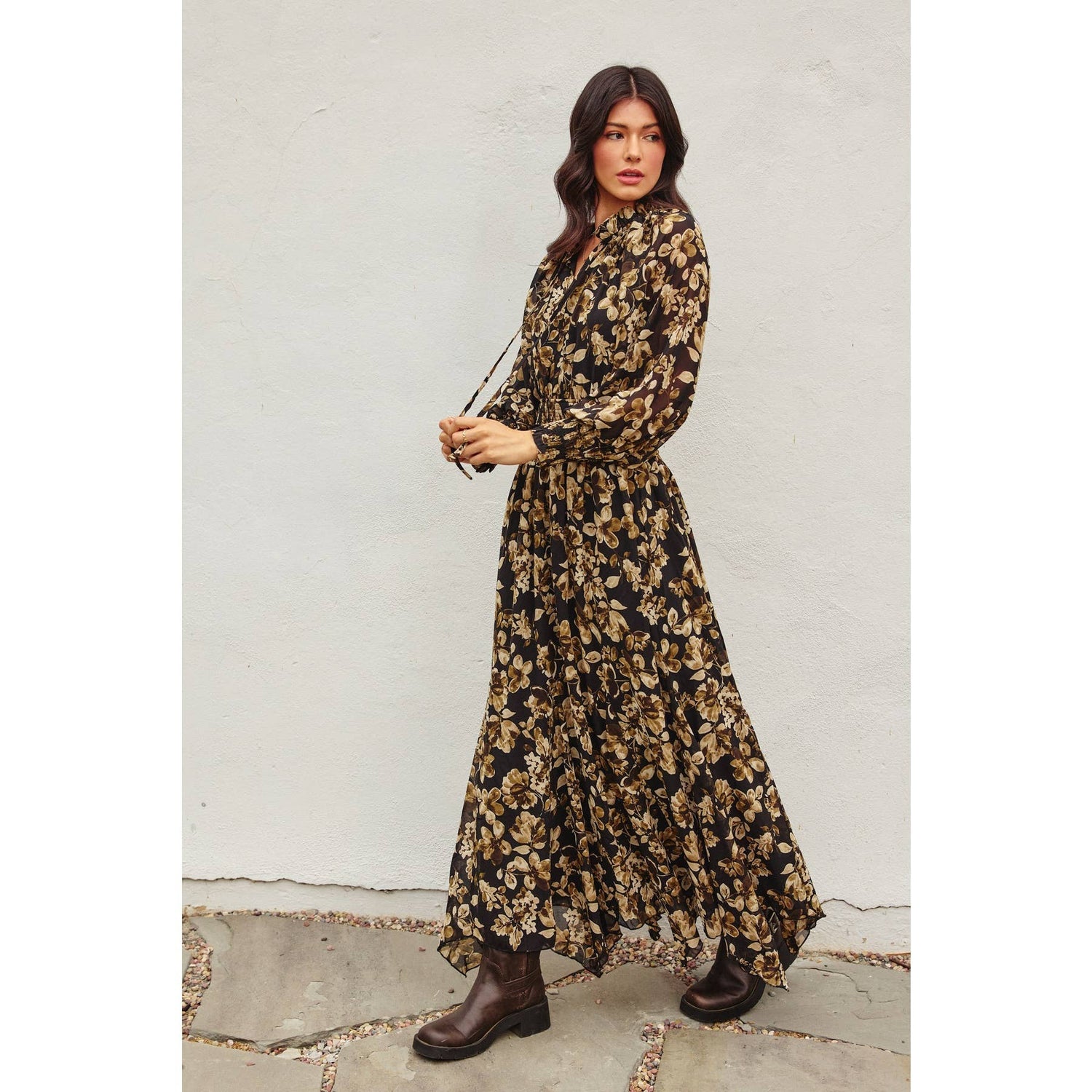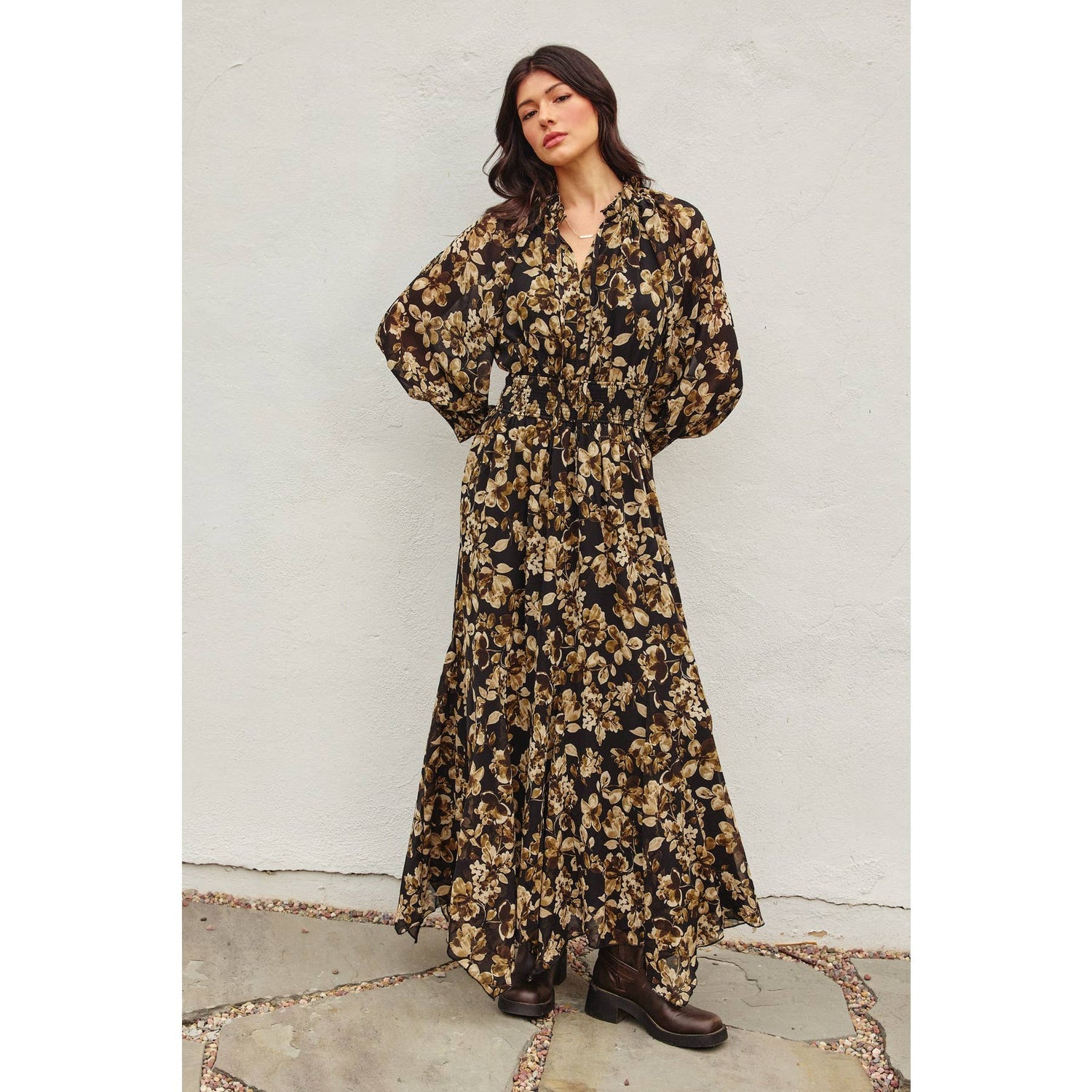 -X Floral print maxi dress deaturing a handkerchief hem. Model is 5'8" and wearing size Small. - Smocked waist and cuffs - Ruffle detailing on the shoulders and neckline. - Neck tie closure which we prefer to keep it untied - Partially lined Shell: 100% Polyester Lining: 100% Polyester Available By BLACK FLORAL : 12/27/2024