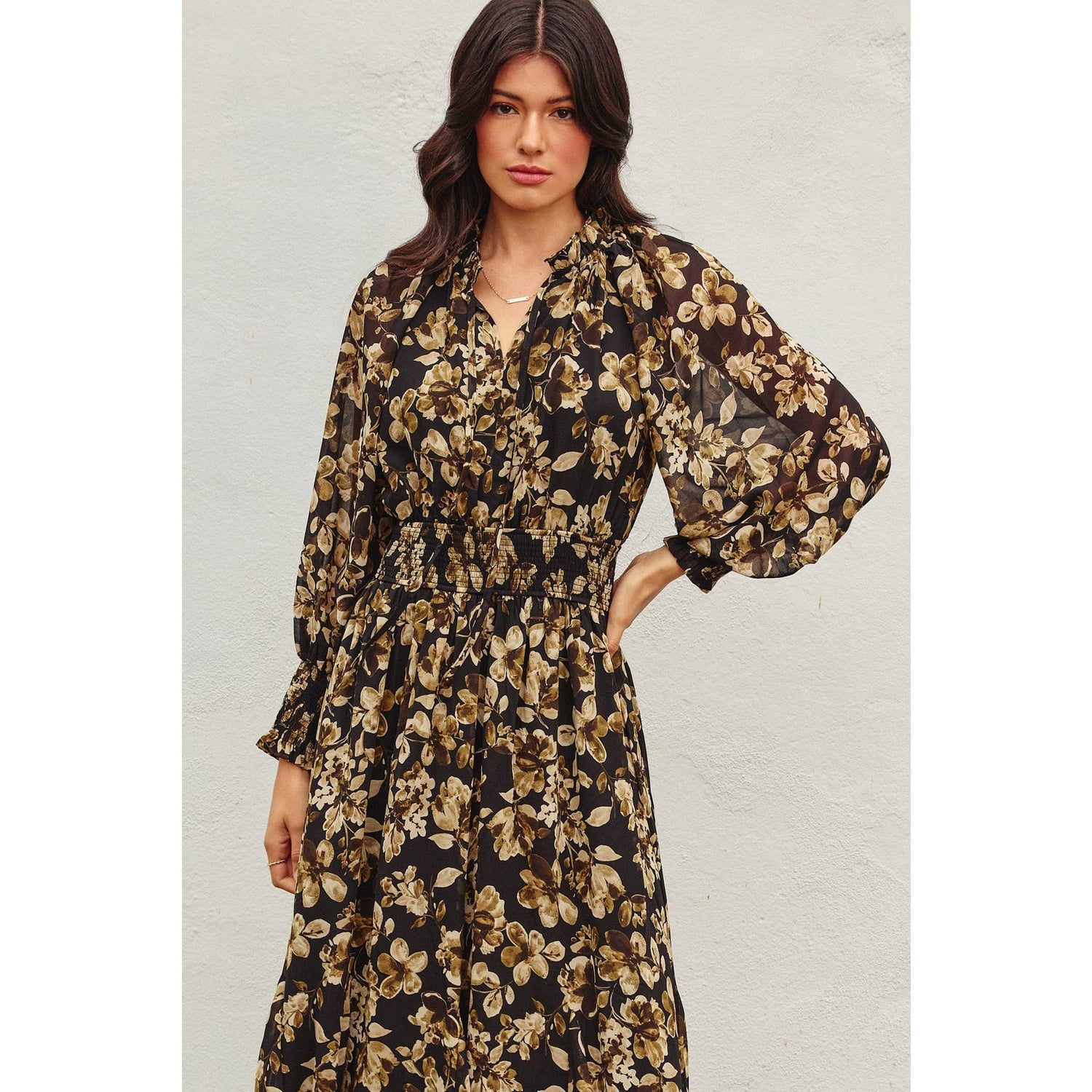 Floral Shirred Waist Handkerchief Maxi Dress: BLACK FLORAL / FD12117-P1662
